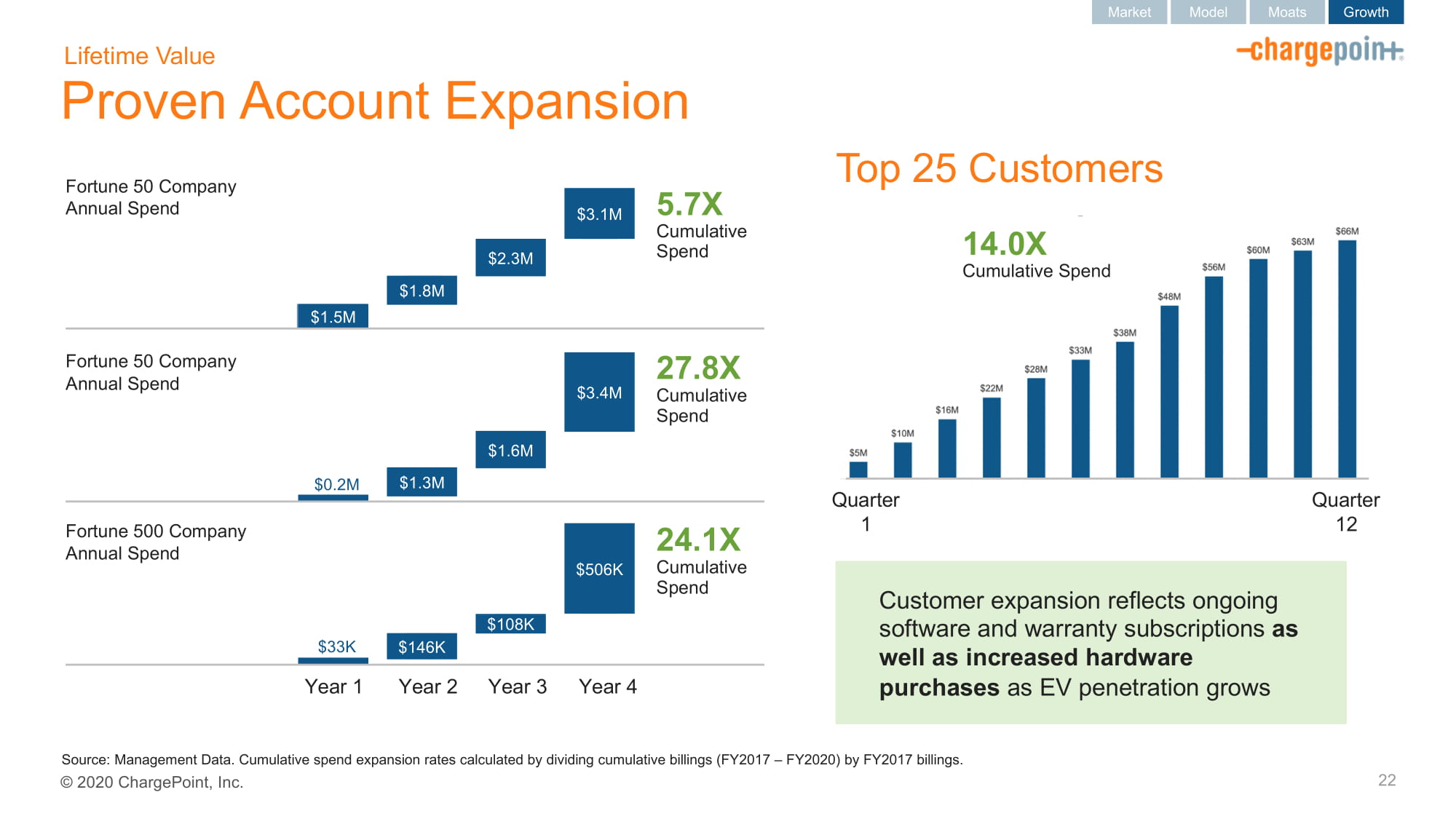 2020ChargePoint,Inc.资料来源:管理数据。累计支出扩张率按累计Billings(2017财年-2020财年)除以2017财年Billings计算。5.7X累计支出$1,548$1,779$2,276$3,149FY2017FY2018FY2019FY2020FY202020FY234$1,252$1,579$3,429FY2017FY202020FY202020FY3$146$108$506FY2018FY2018FY2020FY2020FY2020FY2020FY2020财富50公司年度支出$1,548FY1,150万美元180万美元230万美元310万美元年度支出财富500强公司年度支出2年3年427.8倍累计支出24.1倍累计支出已验证账户扩展寿命值22季度1季度1214.0倍累计支出TOP25客户市场模型护城河增长客户扩展反映正在进行的软件和保修订阅以及随着EV渗透率的增长,硬件采购增加