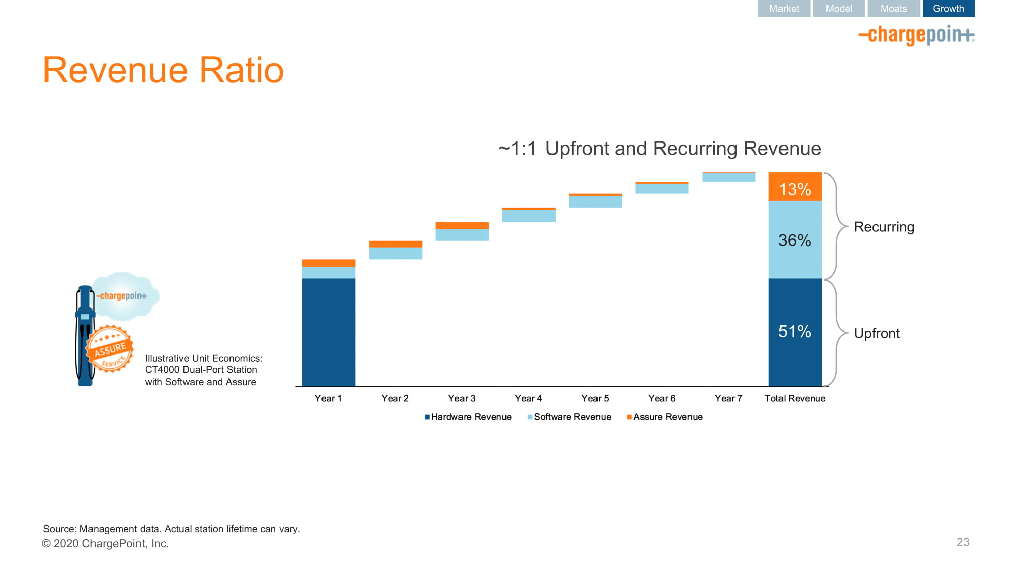 2020ChargePoint,Inc.收入比23市场模型护城河增长1:1前期和经常性收入说明单位经济:CT400双口站与软件和保证经常性前期来源:管理数据。实际的站寿命可以变化。13% 36% 51%