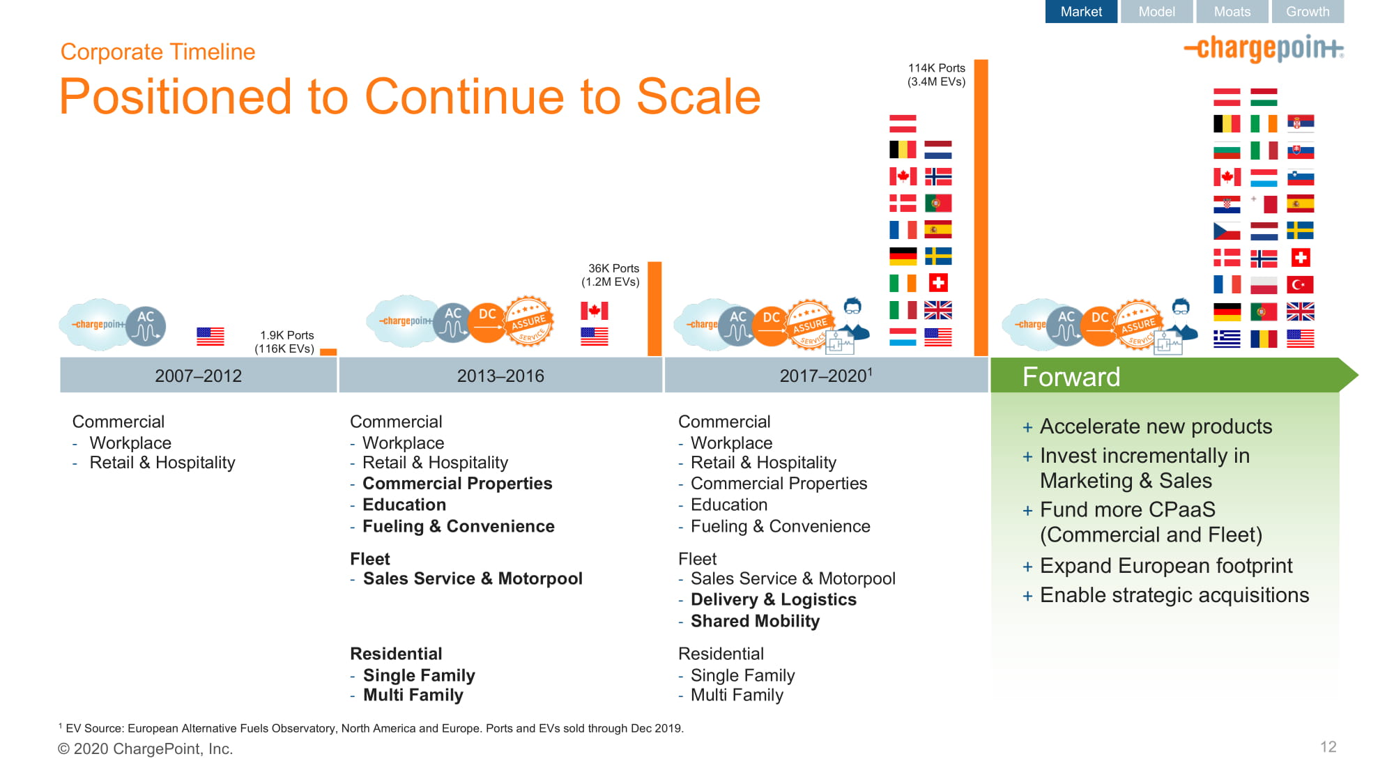 2020ChargePoint,Inc.定位于继续扩大规模122007-2012年1.9K端口(116K EV)商业-工作场所-零售和酒店36K端口(120万EV)商业-工作场所-零售和酒店-商业物业-教育-加油和便利车队-销售服务和汽车池住宅-单一家庭-多家庭2013-2016年114K端口(340万EV)商业-工作场所-零售和酒店-商业物业教育-加油与便利车队-销售服务与汽车池-交付与物流-共享出行住宅-单一家庭-多家庭2017-20201+加速新产品+增量投资营销与销售+基金更多CPAAS(商业与车队)+扩大欧洲足迹+启用战略收购前进企业时间表1EV来源:欧洲替代燃料观察站,北美和欧洲。Ports和EV销售至2019年12月。市场模式护城河增长