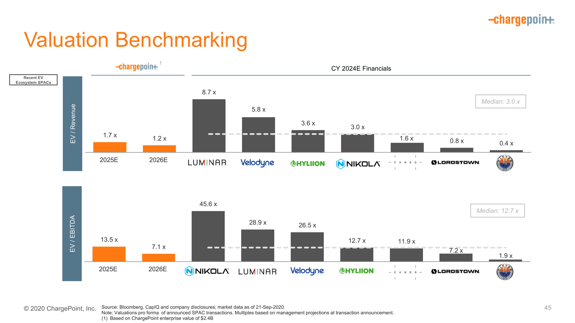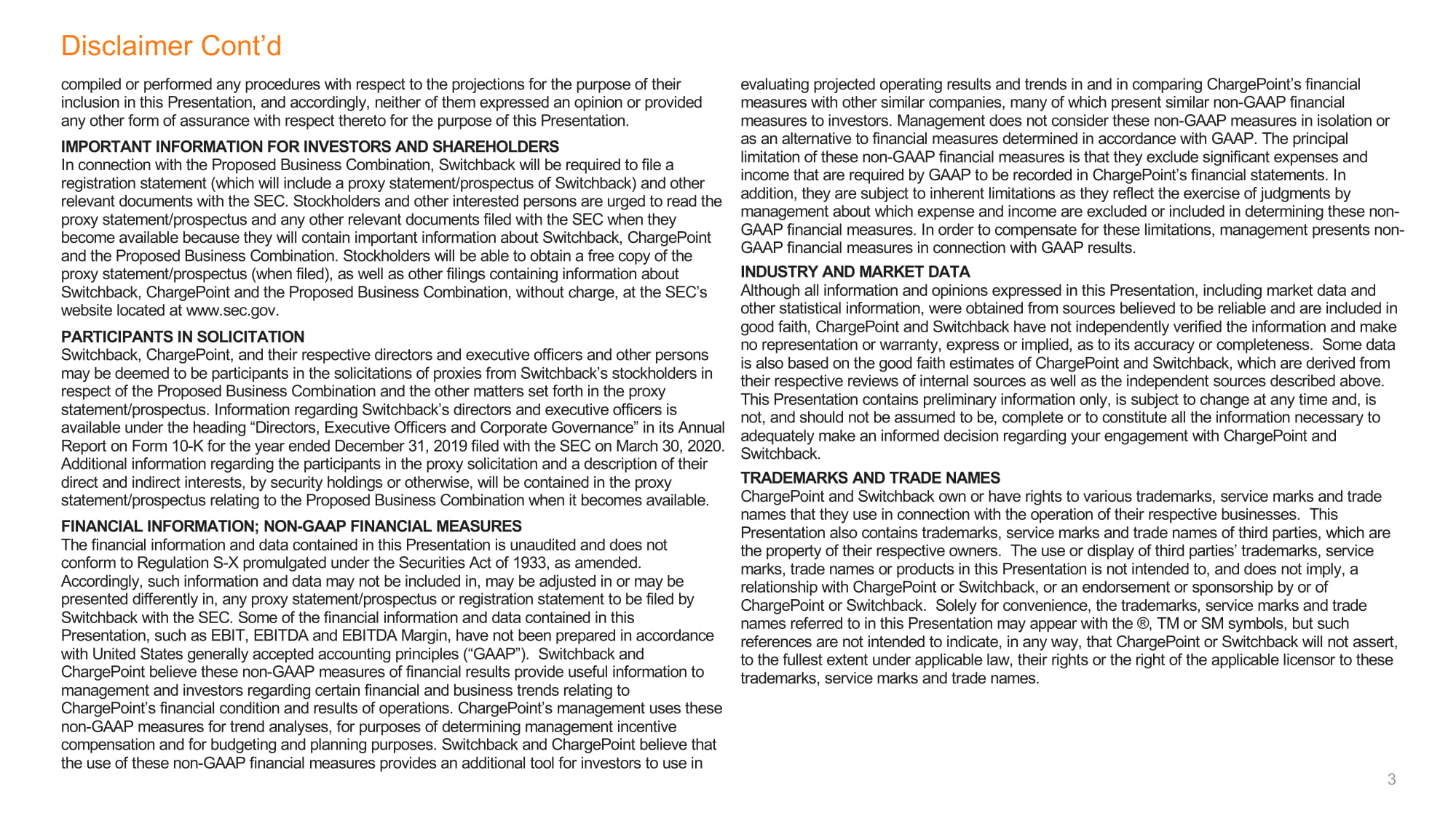 3为将预测纳入本陈述而汇编或执行了任何程序,因此,两人均未为本陈述的目的就此发表意见或提供任何其他形式的保证。对于投资者和股东而言,与拟议业务合并有关的重要信息,Switchback将被要求向SEC提交一份注册声明(其中将包括Switchback的代理声明/招股说明书)和其他相关文件。请股东和其他有关人士在收到委托书/招股说明书和任何其他相关文件时阅读,因为这些文件将载有关于Switchback、ChargePoint和拟议业务合并的重要信息。股东将可以免费在证券交易委员会网站www.sec.gov上获得委托书/招股书(提交时)以及包含Switchback、Chargepoint和拟议企业合并信息的其他文件。邀请Switchback、ChargePoint的参与者及其各自的董事和执行官员及其他人士,可被视为邀请Switchback的股东就建议的业务合并及委托书/招股章程所载的其他事宜进行代理的参与者。有关Switchback董事及执行人员的资料载于其于2020年3月30日向SEC提交的截至2019年12月31日止年度10-K表格的年度报告“董事、执行人员及公司管治”标题下。一旦获得关于拟议企业合并的代理声明/招股书,将载有关于代理招标参与者的更多信息,并按持有的证券或其他方式说明他们的直接和间接利益。财务信息;非公认会计原则财务计量本报表所载财务信息和数据未经审计,不符合根据经修正的1933年《证券法》颁布的条例S-X。因此,这样的信息和数据可以不包括在、可以调整在或可以不同地呈现在、通过Switchback向SEC提交的任何代理声明/招股说明书或注册声明中。本列报中所载的一些财务信息和数据,如息税折旧摊销前利润(EBIT)、EBITDA和EBITDA利润率,均未按照美国公认会计原则(“GAAP”)编制。Switchback和Chargepoint认为,这些非GAAP财务业绩衡量标准为管理层和投资者提供了有关Chargepoint财务状况和运营结果的某些财务和业务趋势的有用信息。ChargePoint的管理层使用这些非公认会计原则措施进行趋势分析,以确定管理层奖励报酬,并编制预算和进行规划。Switchback和ChargePoint认为,这些非GAAP财务措施的使用为投资者提供了一个额外的工具,可以用来评估ChargePoint财务措施与其他同类公司的预计经营业绩和趋势,并进行比较,其中许多公司向投资者提出了类似的非公认会计原则财务措施。管理层并不孤立地或作为根据公认会计原则确定的财务措施的替代办法来考虑这些非公认会计原则措施。这些非公认会计原则财务措施的主要限制是,它们不包括公认会计原则要求在ChargePoint财务报表中记录的重大支出和收入。此外,它们还受到固有的限制,因为它们反映了管理层在确定这些非公认会计原则财务措施时对哪些费用和收入被排除在外或包括在内所作的判断。为了弥补这些限制,管理层结合公认会计原则的结果提出了非公认会计原则的财务措施。行业和市场数据尽管本次演示文稿中表达的所有信息和意见,包括市场数据和其他统计信息,都是从被认为可靠且诚信的来源获得的,但ChargePoint和Switchback并未对信息进行独立验证,也未做出任何表示或保证,明示的或暗示的,关于其准确性或完整性的。有些数据还基于对充电点和开关点的善意估计,这些估计来自它们各自对内部来源以及上述独立来源的审查。本演示文稿仅包含初步信息,可随时更改,不完整,也不应被假定为完整,或构成所有必要信息,足以就您与ChargePoint和Switchback公司的业务往来作出知情决定。商标和商品名ChargePoint和Switchback拥有或有权使用与其各自业务的经营有关的各种商标、服务商标和商品名。本演示文稿还包含第三方的商标、服务商标和商品名,这些商标、服务商标和商品名是各自所有者的财产。在本演示文稿中使用或展示第三方的商标、服务标记、商品名或产品,并不是为了,也不意味着与收费点或交换点的关系,或收费点或交换点的背书或赞助。仅为方便起见,本演示文稿中提及的商标、服务标记和商品名称可以用、商标或商标符号出现,但此种提及并不旨在以任何方式表明,根据适用法律,充值点或交换点将不会最充分地主张,他们的权利或适用许可人对这些商标、服务商标和商标名称的权利。免责声明c"d