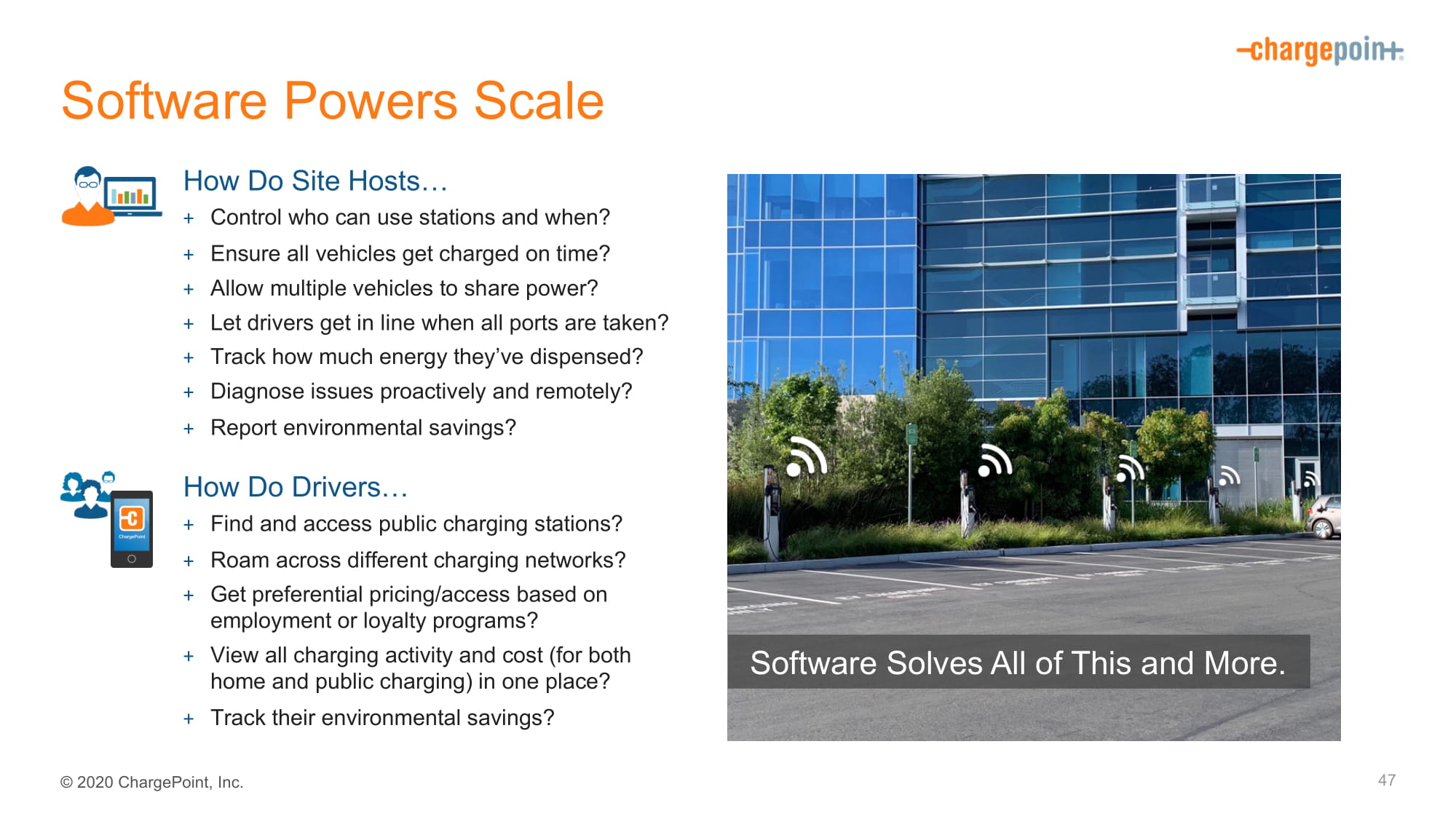 2020ChargePoint,Inc.软件能力标尺47站点主机如何…+控制谁可以使用站点以及何时使用?确保所有车辆按时充电?+允许多辆车共享动力?+让司机在所有端口都取走后排队?追踪他们分配了多少能量?+主动和远程诊断问题?+报告环境节约情况?软件解决了所有这些和更多问题。司机如何……+找到并进入公共充电站?在不同的充电网络中漫游?+获得基于就业或忠诚度计划的优惠定价/准入?+在一个地方查看所有收费活动和费用(家庭和公共收费)?追踪他们的环保储蓄?