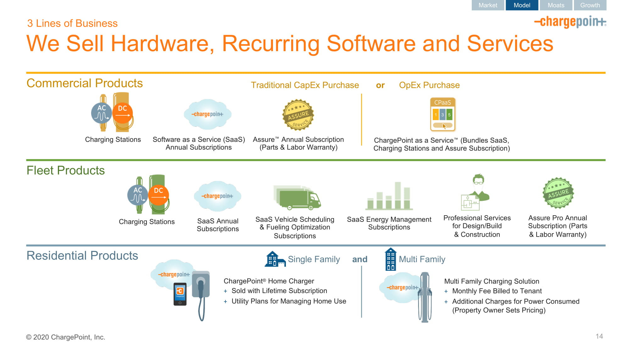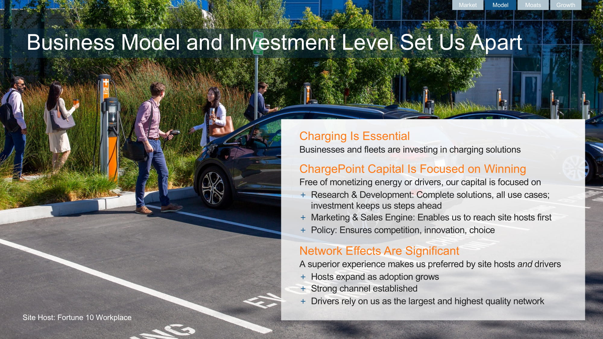2020ChargePoint,Inc.充电是必不可少的业务和车队都在投资充电解决方案ChargePoint资本专注于赢得免费的货币化能源或司机,我们的资本专注于+研发:完整的解决方案,所有用例;投资使我们走在前面+营销和销售引擎:使我们能够首先到达网站主机+政策:确保竞争,创新,选择网络效应显着优越的体验使我们受到站点主机和驱动程序的青睐+主机随着采用率的增长而扩展+强大的渠道建立+驱动程序依赖我们作为最大和最高质量的网络商业模式和投资水平使我们与众不同市场模式护城河的增长网站主持人:《财富》10强职场,