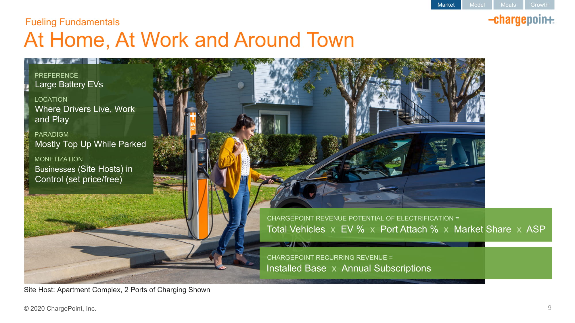 2020ChargePoint,Inc.在家里,在工作地点和附近的城镇9喜欢大电池电动汽车的司机居住的地方,工作和娱乐模式大多是在停车赚钱业务(网站主机)在控制中(设定价格/免费)市场模式护城河增长ChargePoint电气化的收入潜力=车辆总量x EV%x端口附着%x市场份额x ASP ChargePoint经常性收入=已安装基数x年度订阅网站主机:公寓大楼,2个充电端口显示了燃料的基本原理
