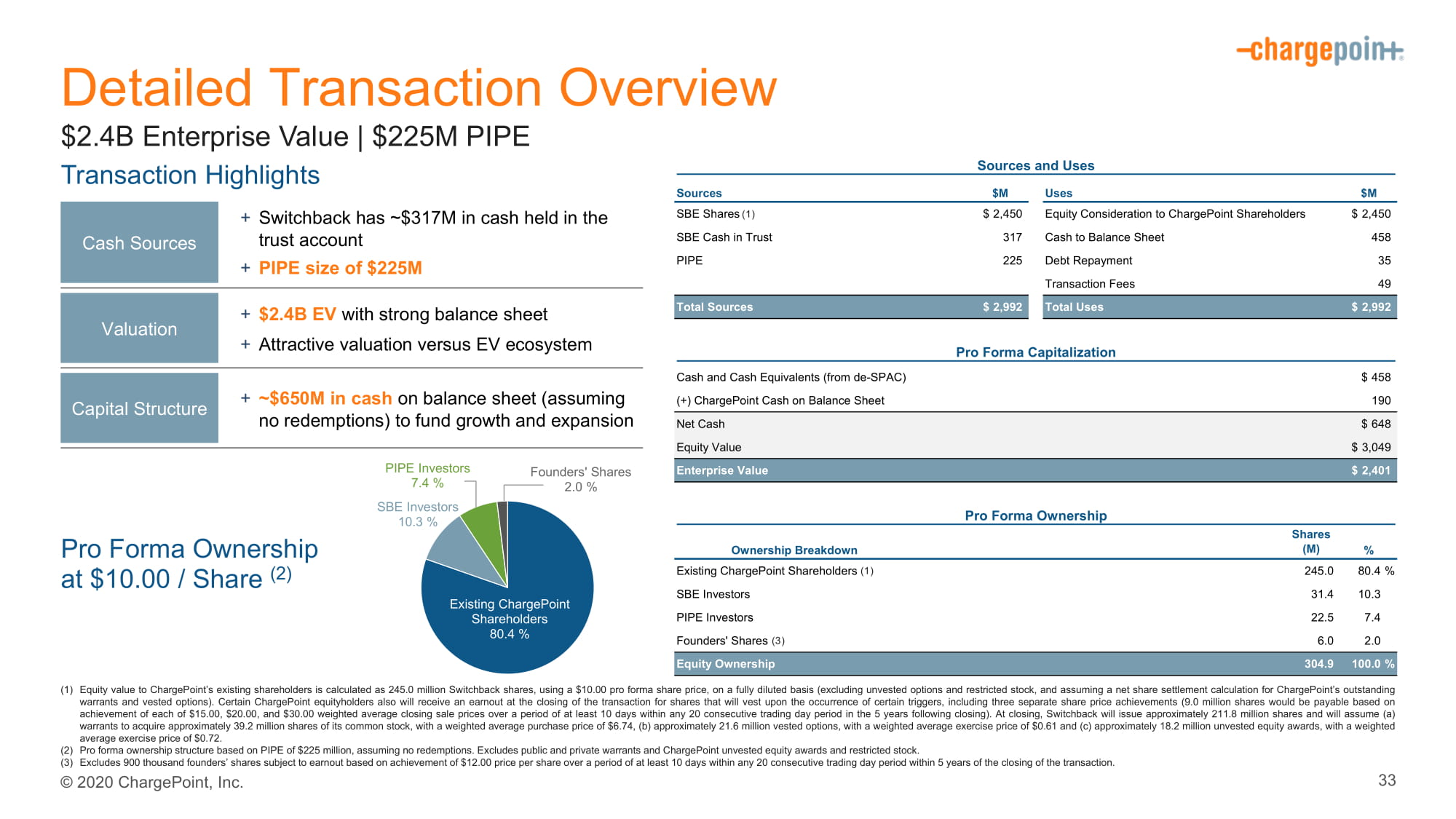 2020ChargePoint,Inc.详细交易概况33$2.4B企业价值|$2.25亿管道交易要点(1)对ChargePoint现有股东的股权价值计算为2.45价值1000万澳元的股票。00备考股价,按全面摊薄基准(不包括未归属期权和限制性股票,并假设ChargePoint未行使认股权证和已归属期权的净股份结算计算)计算。某些chargepointEquityholders还将在交易结束时获得分配给某些触发器的股票的收益,其中包括三个独立的股价成就(9。将根据每笔15美元的实现情况支付0万股。00 , $ 20 .00和30美元。00收盘后5年内任何连续20个交易日期间内至少10日内的加权平均收盘卖出价格)。收盘时,Switchback将发行约211张。800万股股份,并将承担(a)认股权证收购约39200万股其普通股,加权平均买入价为6美元。74,(b)大约21。600万份既得期权,加权平均行权价格为0美元。61和(c)约18。200万份未归属股权奖励,加权平均行权价格为0美元。72 .(2)假设没有赎回,以PIPE2.25亿美元为基础的形式所有权结构。不包括公共和私人认股权证和计费点未归属股权奖励和限制性股票。(3)不包括90000股创办人的股份,该等股份须根据12元的实绩而拨出。00在交易结束后5年内的任何连续20个交易日期间内的至少10天期间内的每股价格。预计所有权价格为10.00美元/股(2)现金来源+现金回流信托账户持有现金约3.17亿美元+管道规模2.25亿美元估值+资产负债表强劲的24亿美元电动汽车+估值相对于电动汽车生态系统资本结构的吸引力+资产负债表上现金约6.5亿美元(假设没有赎回)为增长和扩张提供资金(3)(1)(1)来源和使用来源$M使用$M SBE股份$2,450股权对价给ChargePoint股东$2,450SBE信托现金317现金到资产负债表458管道225债务偿还35交易费49总来源$2,92总用途$2,992ProForma资本化现金及现金等价物(来自DE-SPAC)$458(+)Chargepoint资产负债表上的现金$190净现金$648股权价值$3,049企业价值$2,401备考所有权细分股份(M)%现有Chargepoint股东245.080.4%SBE投资者31.410.3PIPE投资者22.57.4创始人股份6.0股权所有权304.9100.0%SBE投资者10.3%PIPE投资者7.4%现有ChargePoint股东80.4%创始人股份2.0%K40K41S40K42K43K44K45K46S41S42S43S445S46S47S48