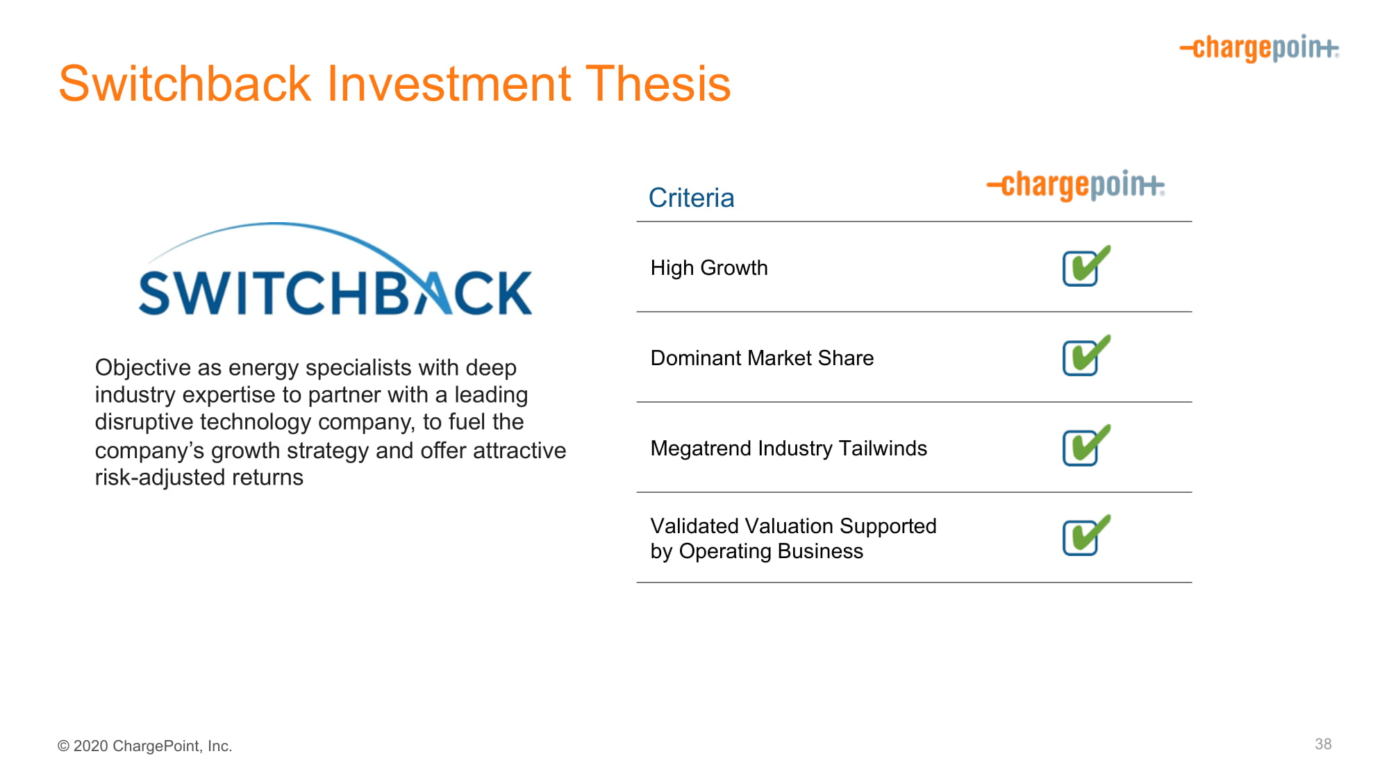 2020ChargePoint,Inc.Switchback投资论文标准38目标作为具有深厚行业专业知识的能源专家与领先的颠复性技术公司合作,为公司的增长战略提供燃料,并提供有吸引力的风险调整后回报高增长主导市场份额大趋势行业顺风经营业务支持下的经验证估值