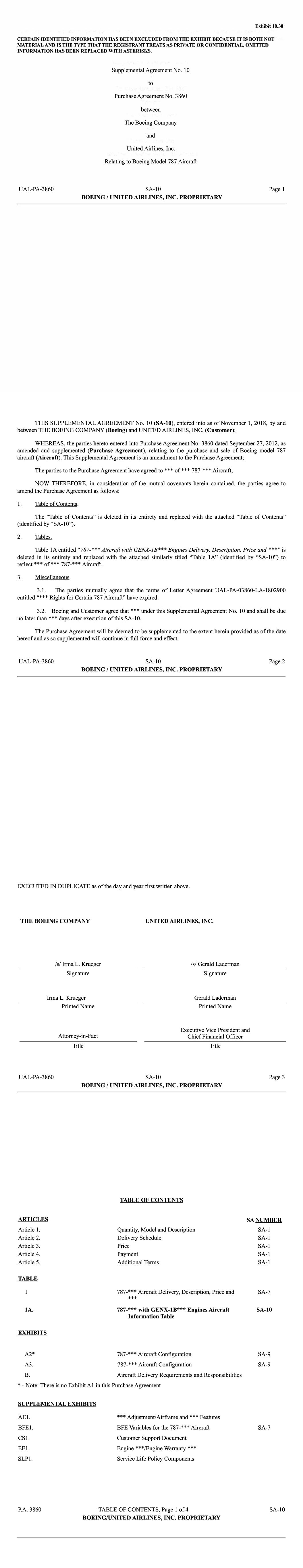 UAL-PA-3860 附件 10.30某些已识别的信息已被排除在展览之外,因为它既不是材料,也是注册人条约作为私人或机密的类型。OMITTED INFORMATION has been replaced with ASTERISKS。The Boeing Company和联合航空公司关于波音787 SA-10波音/联合航空公司的第10号购买协议第3860号补充协议。本补充协议第10号(SA-10),由波音公司(波音)和联合航空公司(客户)于2018年11月1日签订;鉴于本协议双方于2012年9月27日签订了经修订和补充的第3860号采购协议(采购协议),涉及波音787飞机(飞机)的买卖。本补充协议是对采购协议的修订;采购协议各方已同意* * * 787-* * *飞机的* * *;因此,考虑到本协议所载的共同契约,双方同意对采购协议进行如下修订:1。目录。“目录”全部删除,改为所附“目录”(以“SA-1 O”标示)。2.桌子。标题为“787-* * *飞机与GENX-JB * * *发动机交付、说明、价格和* * *”的表lA全部删除,改为所附标题类似的“表lA”(以“SA-10”表示),以反映* * * * 787-* * *飞机的* * *。3.杂项。3.1.双方同意,题为“* * *某些787飞机的权利”的信函协议UAL-PA-03860-LA-1802900的条款已经失效。3.2.波音公司和客户公司同意,根据本补充协议第10号,* * *应在本SA-10执行后* * *天内到期。采购协议将被视为在本协议所规定的范围内自本协议之日起得到补充,并且所补充的协议将继续完全有效。UAL-PA-3860 SA-10第2页BOEING/UNITED AIRLINES,INC。在上面第一个写的日期和年份重复执行的所有权。THE BOEING COMPANY/s/Irma L. Krueger Signature Irma L. Krueger Printed Name Attorney-in-Fact Title UAL-PA-3860 UNITED AIRLINES,INC。SA-10/s/Gerald Laderman签名Gerald Laderman印刷姓名执行副总裁兼首席财务官标题BOEING/UNITED AIRLINES,INC。所有权第3页条款第1条。第2条。第3条。第4条。第5条。表1。表A2 * A3。B.目录数量、型号和说明交付时间表价格支付附加条款787-* * *飞机交付、说明、价格和* * * 787-* * *带GENX-lB * * *发动机飞机信息表787-* * *飞机配置787-* * *飞机配置飞机交付要求和责任*-注:本采购协议中没有附件 Al补充EXHIBITS AEL BFEL CSL EEL SLPl。P.A.3860 * * *调整/机身和* * *特点BFE变量为787-* * *飞机客户支持文件发动机* * */发动机保修* * *使用寿命政策组件目录,第1页,共4页BOEING/UNITED AIRLINES,INC。私有SANUMBER SA-1 SA-1 SA-1 SA-1 SA-1 SA-7 SA-10 SA-9 SA-7