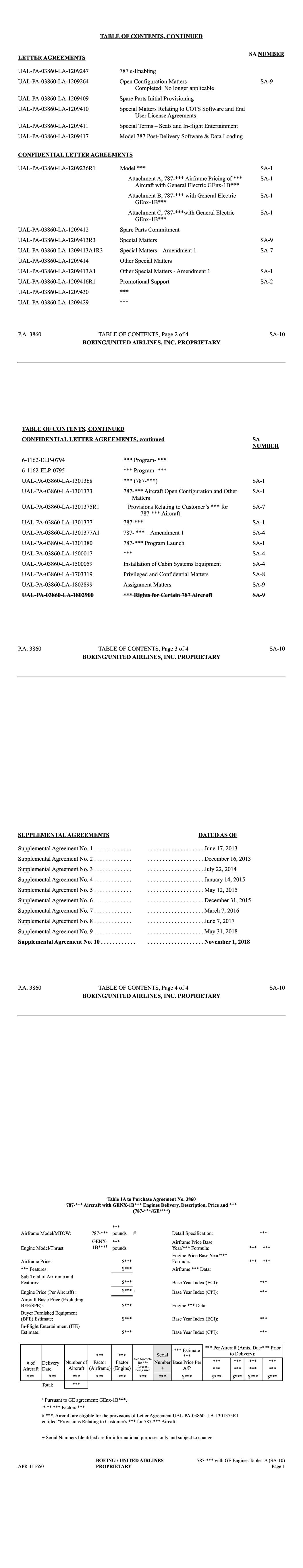 LETTER Agreements UAL-PA-03 860-LA-1209247 UAL-PA-03860-LA-1209264 UAL-PA-03860-LA-1209409 UAL-PA-03860-LA-1209410 UAL-PA-03860-LA-1209411 UAL-PA-03860-LA-1209417目录,续787 e-Enabling Open Configuration Matters Completed:No longer applicable Spare Parts Initial Provisioning Special Matters Related to COTS Software and End User License Agreements Special Terms-Seats and In-flight Entertainment Model 787 Post-Delivery Software & Data Loading Conf787-* * *与通用电气 SA-1 UAL-PA-03 860-LA-1209412 UAL-PA-03860-LA-1209413R3 UAL-PA-03860-LA-1209413A1R3 UAL-PA-03 860-LA-1209414 UAL-PA-03860-LA-1209413Al UAL-PA-03860-LA-1209416Rl UAL-PA-03 860-LA-1209430 UAL-PA-03 860-LA-1209429 GEnx-lB * * *备件承诺特别事项-修正案1其他特别事项其他特别事项-修正案1促销支持* * * * * P.A. 3860目录,第2页,共4页BOEING/UNITED A专有SA-9 SA-7 SA-1 SA-2 SA-10目录,续保密信函协议,续6-1162-ELP-0794 * * *计划-* * * 6-1162-ELP-0795 * * *计划-* * * UAL-PA-03860-LA-1301368 * * *(787-* * *)UAL-PA-03860-LA-1301373 787-* * *飞机开放配置和其他事项UAL-PA-03860-LA-1301375Rl规定与客户有关的* * *适用于787-* * *飞机UAL-PA-03860-LA-1301377 787-* * * UAL-PAAPROPRIETARY SA NUMBER SA-1 SA-1 SA-7 SA-1 SA-4 SA-1 SA-4 SA-8 SA-9 S:A-9 SUPPLEMENTAL AGREEMENTS DATED AS OF Supplemental Agreements No. 1........................。2013年6月17日第2号补充协定。... . . . .. . . ... . ... . .. . ... . ...2013年12月16日第3号补充协定。... . .. . . . . . ... . ... . . . ... . ...2014年7月22日补充协议第4号.................................。2015年1月14日第5号补充协议。... . .. . . . . . ... . ... . . . ... . ...2015年5月12日补充协议第6号.................................。2015年12月31日补充协议第7号.................................。2016年3月7日补充协议第8号..。... . . . .. . . ... . ... . .. . ... . ...2017年6月7日补充协议第9号.................................。2018年5月31日补充协议第10号.................................。2018年11月1日P.A.3860目录,第4页,共4页BOEING/UNITED AIRLINES,INC。专有表lA to purchase agreement No. 3860 787-* * * Aircraft with GENX-lB * * * Engines Delivery,Description,价格和* * *(787-***/GE/* * *)机身型号/MTOW:787-* * * GENX-发动机型号/推力:1B * * * 1机身价格:* * *特点:机身小计和特点:发动机价格(每架飞机):飞机基本价格(不包括BFE/SPE):买方家具设备(BFE)估计:飞行娱乐(IFE)估计:* * *英镑# * * * *英镑$ * * * * $ * * * * $ * * * * $ * * * * 1 $ * * * * $ * * * * *详细规格:机身价格基准年/* * *公式:发动机价格基准年/* * *公式:机身* * *数据:基准年指数(ECI):基准年指数(CPI):发动机* * * *数据:基准年指数(ECI):基准年指数(CPI):* * * * * * * * * * * * * * * * * * * * * * * * * * * * * * * * * * * * * * * * * * * * * * *到期/* * *飞机的先前# * * * * * * * *序列号* * * *至交付):交付数量因数日期飞机(机身)(发动机)* * * * * * * * * * *合计:* * * 1根据通用电气的协议:GEnx-lB * * *。* * * * * *因素* * * *见脚注* * * * * *数字基础价格每预测+ A/P * * * * * * * *正在使用* * * * * $ * * * $ * * * $ * * * * * * * * * * * * * * * * * * * * * * * * * * * * * * * * * * * * * * * * * * * * * * * * * * * * * * * * * * * * * * * * * * * * * * * * * * * * * * * * * * * * * * * * * * * * * * * * * * * * * * * * * * * * * * * * * * * * * * * * * * * * * * * * * * * * * * * * * * * * * * *