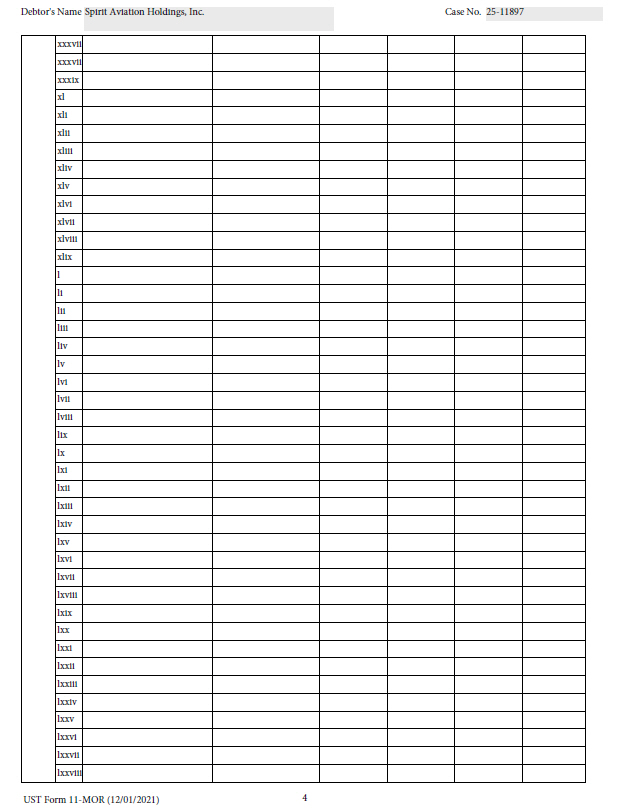 7 UST表格11-MOR(12/01/2021)债务人名称Spirit Aviation Holdings,Inc. Case No. 25-11897 lvii lvii lix lx lxi lxii lxiii lxiv lxvi lxvii lxvii lxvix lxx lxxi lxxxii lxvii lxvii lxvix lxxx lxxxi lxxxii lxxvii lxxvii lxxxxix lxxxx lxxxi lxxxxii lxxxxiv lxxxxv lxxxxv lxxxvi lxxxvi lxxxxvi lxxxxvi lxxxxxvi lx