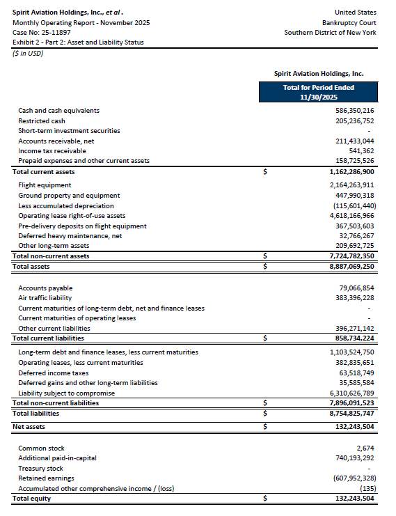 美国Spirit Aviation Holdings,Inc.等破产法院月度运营报告-2025年11月纽约南区案件编号:25-11897 附件 2-第2部分:资产和负债状况(美元)截至11/30/2025586,350,216现金和现金等价物205,236,752受限制现金-短期投资证券211,433,044应收账款净额541,362应收所得税158,725,526预付费用和其他流动资产1美元162,286,900流动资产总额Spirit Aviation Holdings,Inc. 2,164,263,911飞行设备447,990,318地面财产和设备(115,601,440)减累计折旧4,618,166,966经营租赁权-使用资产367,503,603飞行设备交付前保证金32,766,267递延重型维修,净额209,692,725其他长期资产$ 7,724,782,350非流动资产总额$ 8,887,069,250总资产79,066,854应付账款383,396,228空中交通负债-长期债务的当前到期日、净额和融资租赁-经营租赁的当前到期日396,271,142其他流动负债$ 858,734,224流动负债总额1,103,524,750长期债务和融资租赁,减去当期到期日382,835,651经营租赁,减去当期到期日63,518,749递延所得税35,585,584递延收益和其他长期负债6,310,626,789受折衷影响的负债7,896,091,523 $非流动负债总额8,754,825,747 $负债总额132,243,504 $净资产2,674普通股740,193,292额外实收资本-库存股(607,952,328)留存收益(135)累计其他综合收益/(亏损)132美元,243,504总股本