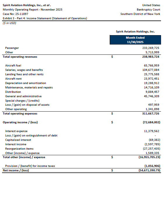 Spirit Aviation Holdings,Inc.Month End 11/30/2025 $(72,684,002)Operating income/(loss)United States Spirit Aviation Holdings,Inc.,et al. Bankruptcy Court Monthly Operating Report-November 2025 Southern District of New York Case No:25-11897 附件 3-Part 4:Income Statement(Operations Statement)(USD)233,269,725 Passengers 5,713,999 Other $ 238,983,724营业总收入65,766,959飞机燃料104,677,084工资和福利25,775,588着陆费和其他租金23,972,451飞机租金19,288材料和维修9,884,457分配45,746,309一般和行政-特别费用/(贷项)497,959资产处置损失/(收益)1,341,898其他经营费用311,667,726总经营费用11,379,562利息费用-债务清偿损失/(收益)(69,382)资本化利息(2,597,785)利息收入(27,257,435)重组项目1,589,335其他(收入)/支出美元(16,955,705。23)其他(收入)/支出总额(1,056,906)所得税拨备/(收益)$(54,671,390。79)净收入/(亏损)