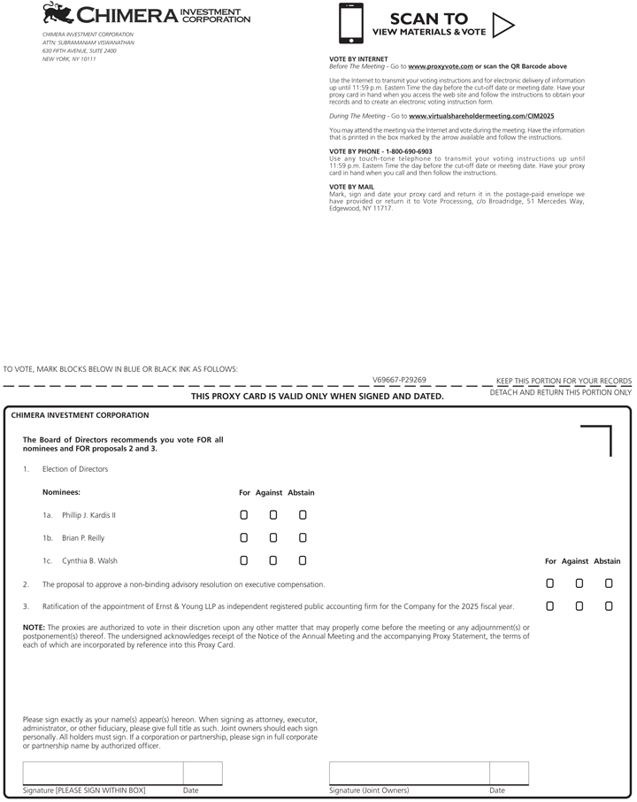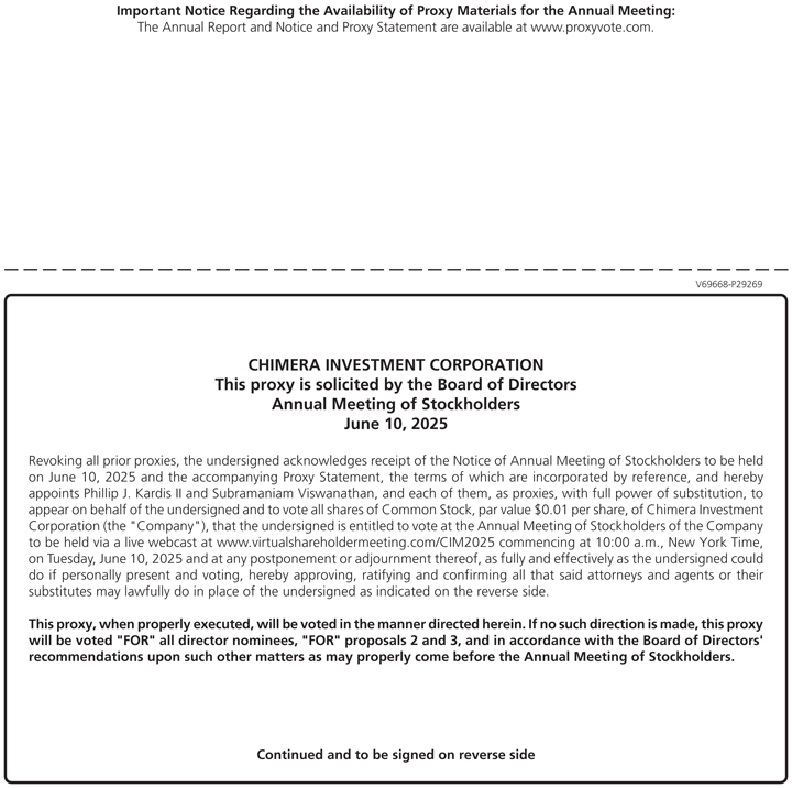 我很高兴地邀请您参加将于美国东部时间2025年6月10日上午10:00举行的马里兰州公司奇美拉投资公司(“Chimera”或“本公司”)的2025年年度股东大会(“年度会议”)。