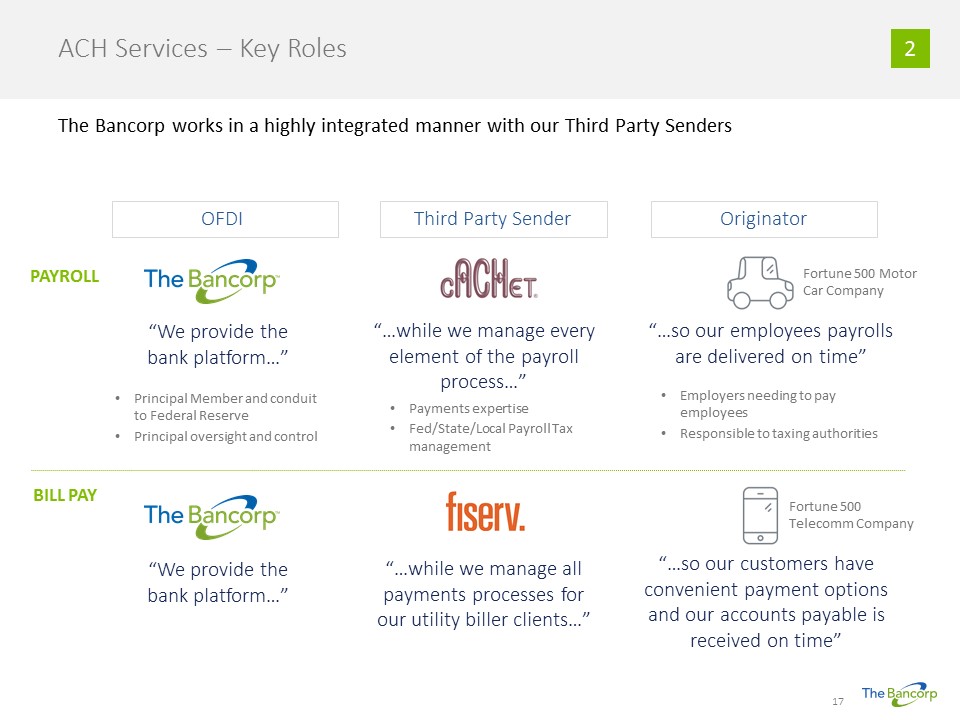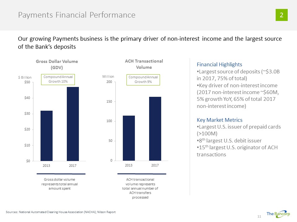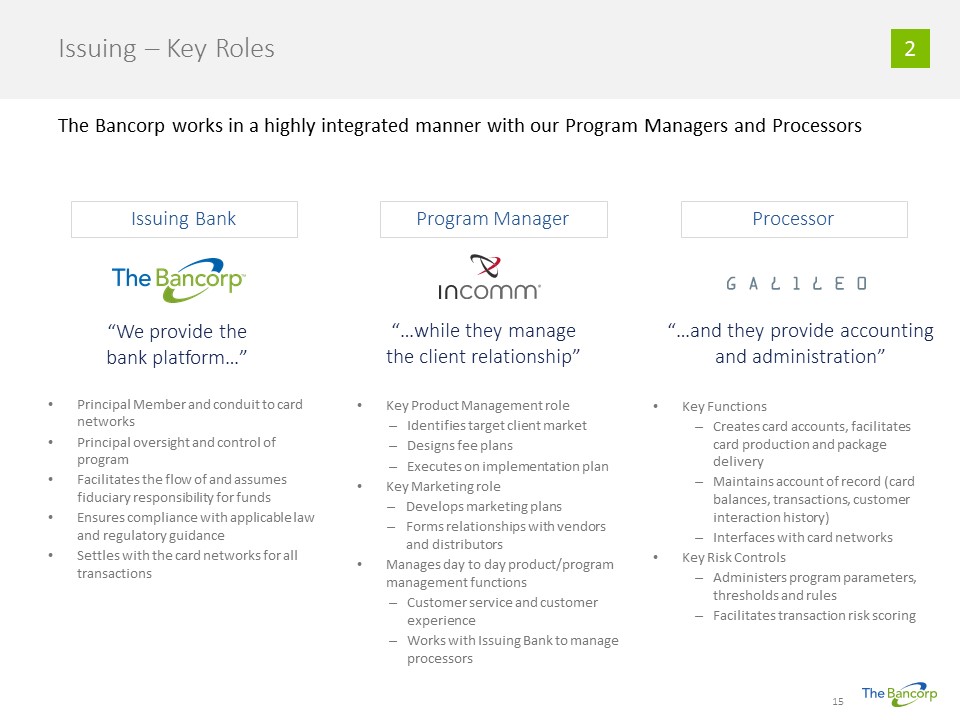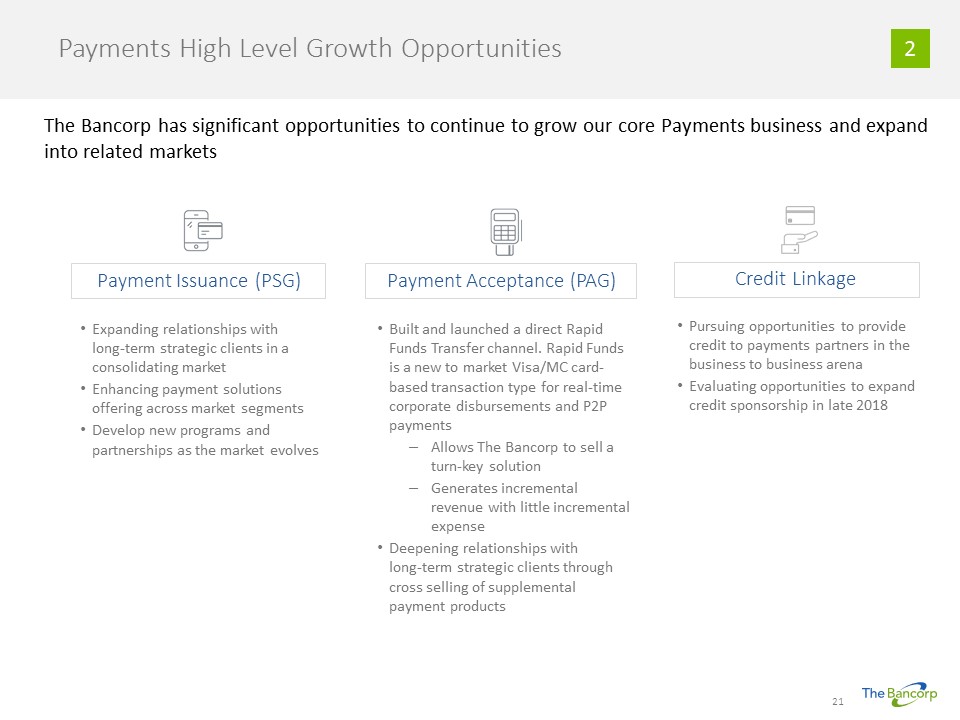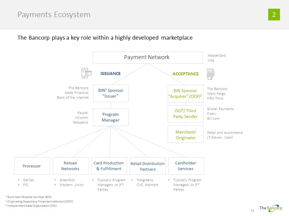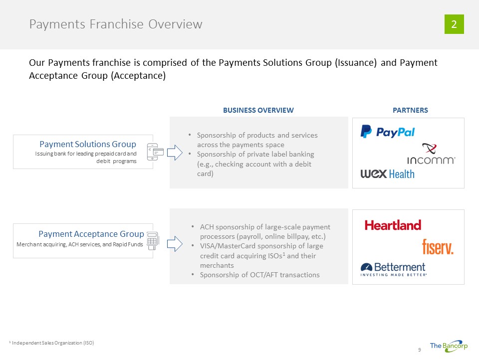 Our Payments franchise is comprised of the Payments Solutions Group (Issuance) and Payment Acceptance Group (Acceptance) Payment Solutions Group Issuing bank for leading prepaid card and debit programs Payment Acceptance Group Merchant acquiring, ACH services, and Rapid Funds BUSINESS OVERVIEW Sponsorship of products and services across the payments spaceSponsorship of private label banking (e.g., checking account with a debit card) PARTNERS ACH sponsorship of large-scale payment processors (payroll, online billpay, etc.)VISA/MasterCard sponsorship of large credit card acquiring ISOs1 and their merchantsSponsorship of OCT/AFT transactions 1 Independent Sales Organization (ISO) Payments Franchise Overview 2