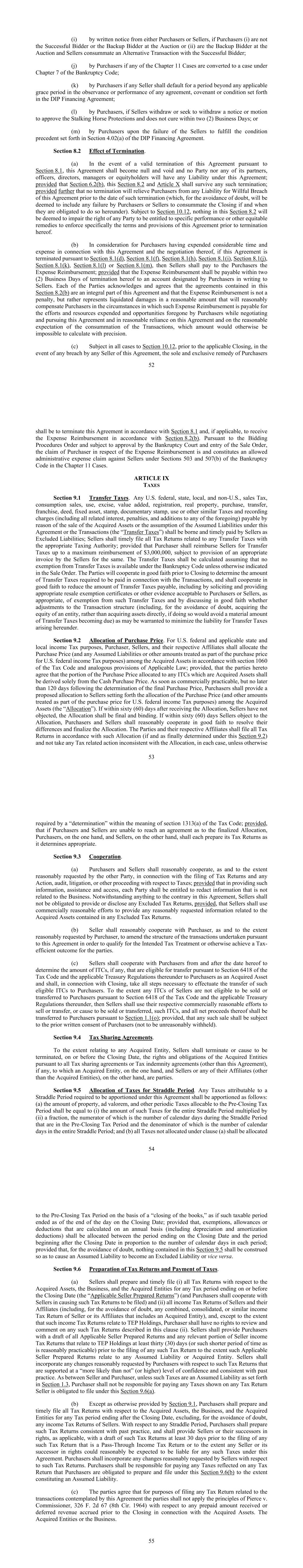 52(i)通过买方或卖方的书面通知,如果买方(i)不是拍卖中的中标人或备用投标人,或(ii)是拍卖中的备用投标人,并且卖方与中标人完成了替代交易;(j)如果第11章的任何案件根据《破产法》第7章被转换为案件,则由买方;(k)如果任何卖方在遵守或履行任何协议时应在超过任何适用的宽限期的期间内违约,则由买方发出,DIP融资协议中规定的契诺或条件;(l)由买方,如果卖方撤回或寻求撤回批准Stalking Horse Protection的通知或动议,但未在两(2)个工作日内治愈;或(m)由买方在卖方未能满足DIP融资协议第4.02(a)节中规定的先决条件时。第8.2节终止的效力。(a)如果根据第8.1节有效终止本协议,则本协议无效,任何一方或其任何合伙人、高级职员、董事、经理或权益持有人均不承担本协议项下的任何责任;但第6.2(b)节、本第8.2节和第X条在任何此类终止后仍有效;此外,前提是任何终止都不会免除买方在该终止日期之前因故意违反本协议而承担的任何责任(为免生疑问,将被视为包括买方或卖方未能完成交割的任何情况,如果他们在本协议下有义务这样做)。除第10.12节另有规定外,本第8.2节中的任何内容均不会被视为损害任何一方当事人在本协议终止前有权获得具体履行或其他衡平法补救办法以具体强制执行本协议的条款和规定的权利。(b)作为买方在本协议及其谈判方面花费大量时间和费用的代价,如果本协议根据第8.1(d)节、第8.1(f)节、第8.1(h)节、第8.1(i)节、第8.1(j)节、第8.1(k)节、第8.1(l)节或第8.1(m)节终止,则卖方应向买方支付费用报销;但费用报销应在本协议终止后两(2)个工作日内支付至买方以书面形式向卖方指定的账户。每一方都承认并同意,本第8.2(b)节所载协议是本协议的组成部分,费用偿还不是一种惩罚,而是一种合理数额的违约金,在这种情况下,对于买方在谈判和追求本协议时所付出的努力和资源以及放弃的机会,并在合理依赖本协议和交易完成的合理预期的情况下,这种费用偿还将是对买方的合理补偿,否则不可能精确计算出多少金额。(c)在符合第10.12条的所有情况下,在适用的结束之前,如果任何卖方违反本协议,买方53的唯一和排他性补救办法应是根据第8.1条终止本协议,并在适用的情况下根据第8.2(b)条获得费用补偿。根据招标程序令,并须经破产法院批准及买卖令入账,买方就费用补偿提出的索赔是并构成第11章案件中根据《破产法》第503和507(b)条向卖方提出的允许的行政费用索赔。第九条对第9.1节转让税征税。任何美国联邦、州、地方和非美国、销售税、消费销售、使用、消费税、增值、登记、不动产、购买、转让、特许经营、契据、固定资产、邮票、文件印章、使用或其他类似的税收和记录费用(包括所有相关的利息、罚款、因出售收购资产或承担本协议项下或交易项下的假定负债(“转让税”)而应付的上述任何一项(“转让税”),应由卖方承担并及时支付,作为除外负债;卖方应及时向适当的税务机关提交与任何转让税相关的所有纳税申报表;但买方应向卖方偿还转让税,最高可偿还3000000美元, 但须由卖方为此提供适当的发票。转让税的计算应假定除非在出售令中另有说明,否则根据《破产法》无法获得转让税的豁免。双方将在交割前进行善意合作,以确定就交易需要支付的转让税金额,并应善意合作以减少应支付的转让税金额,包括通过征集和提供适当的转售豁免证书或买方或卖方酌情可接受的豁免此类转让税的其他证据,以及通过善意讨论是否调整交易结构(包括,为免生疑问,收购实体的股权,而不是直接收购资产,如果这样做将避免大量的转让税到期)作为可能的保证,以最大限度地减少根据本协议产生的转让税的责任。第9.2节采购价格分配。为美国联邦和适用的州和地方所得税目的,买方、卖方及其各自的关联公司应根据税法第1060节和适用法律的类似规定,在被收购资产之间分配购买价格(以及任何假定负债或作为美国联邦所得税目的购买价格的一部分处理的其他金额);但双方同意,分配给任何ITC的购买价格中属于被收购资产的部分应仅来自现金购买价格。买方应在商业上可行的情况下尽快,但不迟于确定最终购买价格后的120天内,向卖方提供拟议的分配,说明购买价格(以及为美国联邦所得税目的被视为购买价格的一部分的其他金额)在获得的资产之间的分配(“分配”)。如果在收到分配后的六十(60)天内,卖方没有提出异议,则分配为最终分配并具有约束力。如果在六十(60)天内卖方反对分配,买卖双方应合理合作,真诚解决分歧并最终确定分配。各方及其各自的关联机构应根据此类分配(如果并根据本第9.2条最终确定)提交所有纳税申报表,并且不得在每种情况下采取与分配不一致的任何税务相关行动,除非《税法》第1313(a)条含义内的“确定”另有要求54;但如果买方和卖方无法就最终分配达成协议,则买方和卖方应各自编制其认为适当的纳税申报表。第9.3节合作。(a)买方和卖方应在另一方合理要求的范围内,就提交纳税申报表以及与税收有关的任何诉讼、审计、诉讼或其他程序进行合理合作;但在提供此类信息、协助和访问时,每一方均有权编辑与业务无关的信息。尽管本协议中有任何相反的规定,卖方没有义务提供或披露任何排除的纳税申报表,但前提是卖方应通过商业上合理的努力,提供任何排除的纳税申报表中包含的与所购资产相关的任