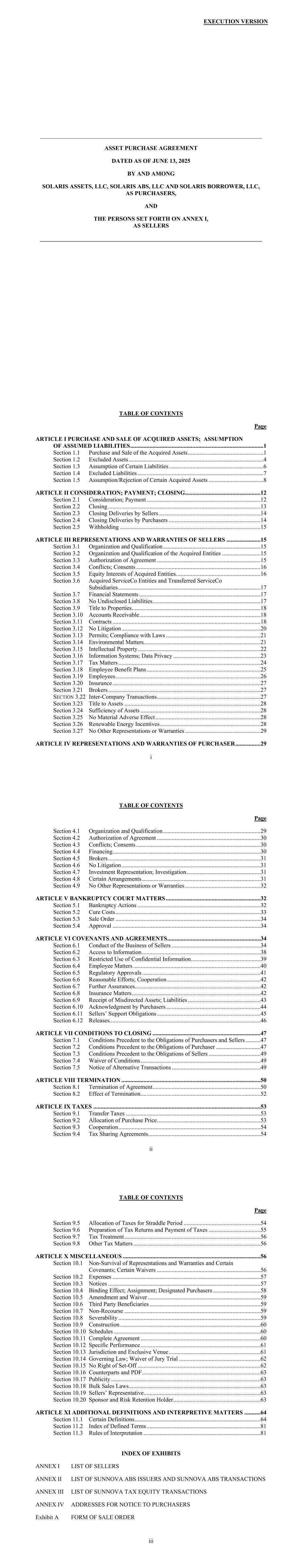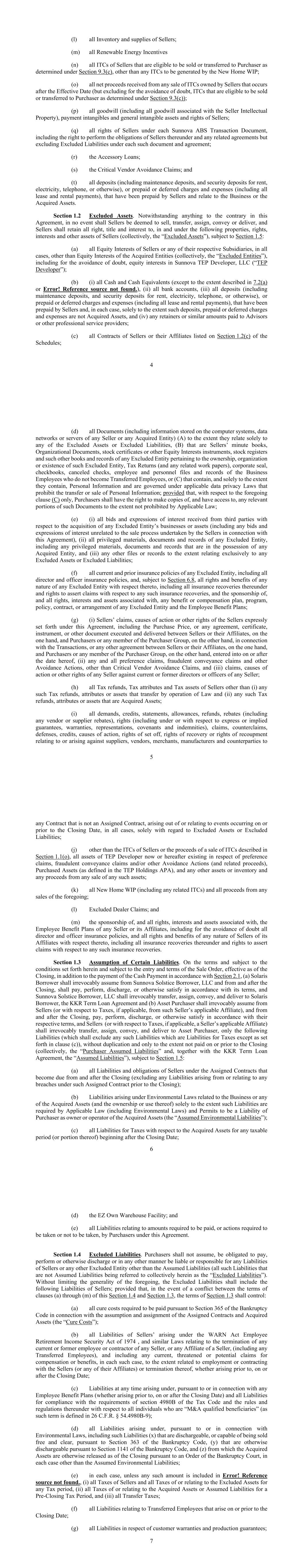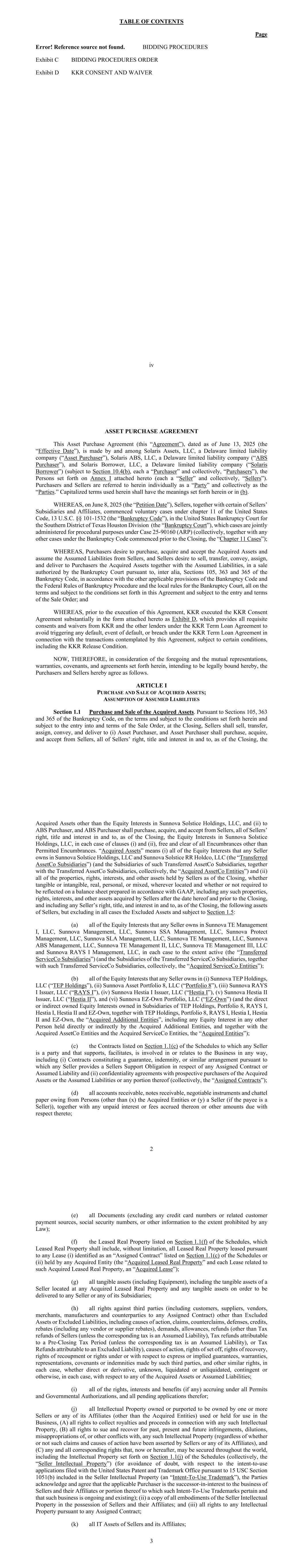 目录page iv错误!未找到参考来源。竞价程序附件 C竞价程序订单附件 D KKR同意和豁免资产购买协议本资产购买协议(本“协议”)的日期为2025年6月13日(“生效日期”),由特拉华州有限责任公司Solaris Assets,LLC(“资产购买者”)、特拉华州有限责任公司Solaris ABS,LLC(“ABS购买者”)和特拉华州有限责任公司Solaris Borrower,LLC(“Solaris Borrower”)(根据第10.4节(b)的规定,各自为“购买者”,统称为“购买者”),附件一所列人员(各自为买方和卖方在本文中分别称为“当事人”,统称为“当事人”。此处使用的大写术语应具有此处或(b)中阐述的含义。鉴于,于2025年6月8日(“请愿日期”),卖方连同若干卖方的附属公司和关联公司,根据美国法典第11章,13 U.S.C. § 101-1532(“破产法”),在美国德克萨斯州南区休斯顿分区破产法院(“破产法院”)启动自愿案件,这些案件根据案件25-90160(ARP)为程序目的共同管理(统称,连同在结案前启动的《破产法》下的任何其他案件,“第11章案件”);鉴于买方希望购买,根据《破产法》和《联邦破产程序规则》的其他适用条款以及破产法院的当地规则,在破产法院授权的出售中,除其他外,根据《破产法》第105、363和365条,从卖方收购和接受被收购资产并承担假定负债,卖方希望出售、转让、转让、转让和向买方交付被收购资产以及假定负债,所有这些均以本协议中规定的条款和条件为准,并以销售订单的输入和条款为准;鉴于在执行本协议之前,KKR基本上以本协议所附的格式作为附件 D执行了KKR同意协议,该协议提供了KKR和KKR定期贷款协议下的其他贷款人的所有必要同意和豁免,以避免触发与本协议所设想的交易有关的任何违约、违约事件或违反KKR定期贷款协议,但须符合某些条件,包括KKR释放条件。现据此,考虑到前述情况及本协议所载的相互陈述、保证、契诺、协议,拟在此受法律约束,买卖双方特此约定如下。第一条购置、出售购置的资产;承担的负债第1.1节购置、出售购置的资产。根据《破产法》第105、363和365节,根据此处规定的条款和条件,并根据买卖令的订立和条款,在交割时,卖方应向(i)资产买方出售、转让、转让、转让和交付,资产买方应向卖方购买、收购和接受除Sunnova Solstice Holdings,LLC的股权之外的卖方在2项被收购资产上的所有权利、所有权和权益,以及(ii)向ABS买方,而ABS买方应购买、收购,并从卖方那里接受卖方对Sunnova Solstice Holdings,LLC的所有权利、所有权和权益,以及截至交割时对Sunnova Solstice Holdings,LLC的股权,在(i)和(ii)条款的每一种情况下,均不受许可的产权负担以外的所有产权负担的影响。“被收购资产”是指(i)任何卖方在Sunnova Solstice Holdings,LLC和Sunnova Solstice RR Holdco,LLC(“被转让的AssetCo子公司”)(以及此类被转让的AssetCo子公司的子公司,连同被转让的AssetCo子公司,统称“被收购的AssetCo实体”)中拥有的所有股权,以及(ii)截至交割时卖方持有的所有财产、权利、权益和其他资产,无论是有形的还是无形的、真实的、个人的还是混合的,无论位于何处,也无论是否需要反映在根据公认会计原则编制的资产负债表中,包括任何此类财产、权利、权益,以及卖方在本协议日期之后和交割前获得的其他资产,包括卖方在交割时对卖方以下资产的任何权利、所有权和权益,但在所有情况下均不包括除外资产,并受第1.5节的约束:(a)任何卖方在Sunnova TE Management I,LLC、Sunnova Management,LLC、Sunnova SSA Management,LLC、Sunnova Protect Management,LLC、Sunnova SLA Management中拥有的所有股权, LLC、Sunnova TE Management,LLC、Sunnova ABS Management,LLC、Sunnova TE Management II,LLC、Sunnova TE Management III,LLC和Sunnova RAYS I Management,LLC,在每种情况下在活动范围内(“被转让的ServiceCo子公司”)(以及被转让的ServiceCo子公司的子公司,连同这些被转让的ServiceCo子公司,统称为“被收购的ServiceCo实体”);(b)任何卖方在(i)Sunnova TEP Holdings,LLC(“TEP Holdings”)、(ii)Sunnova Asset Portfolio 8,LLC(“Portfolio 8”)、(iii)Sunnova RAYS I Issuer,LLC(“RAYS I”),(iv)Sunnova Hestia I I(v)Sunnova Hestia II Issuer,LLC(“Hestia II”)和(vi)Sunnova EZ-Own Portfolio,LLC(“EZ-Own”)(以及在TEP Holdings、Portfolio 8、RAYS I、Hestia I、Hestia II和EZ-Own的子公司中直接或间接拥有的股权,连同TEP Holdings、Portfolio 8、RAYS I、Hestia I、Hestia II和EZ-Own,“被收购的额外实体”,包括被收购的额外实体直接或间接持有的任何其他人的任何股权,以及被收购的AssetCo实体和被收购的ServiceCo实体,“被收购实体”);(c)附表第1.1(c)节所列任何卖方为一方且以任何方式支持、促进、参与或与业务相关的合同,包括(i)构成担保、赔偿或类似安排的合同,据此任何卖方就任何转让合同或承担的责任提供卖方支持义务,以及(ii)与收购资产或承担的负债或其任何部分的潜在购买者签订的保密协议(统称“转让合同”);(d)所有应收账款、应收票据、可转让票据和动产票据(不包括(x)被收购实体或(y)卖方(如果收款人是卖方))所欠的人,以及由此产生的任何未付利息或费用或与此相关的其他应付款项;3(e)所有单据(不包括任何信用卡号码或相关客户付款来源、社会保险号或任何法律禁止的范围内的其他信息);(f)附表第1.1(f)节所列的租赁不动产,其中租赁不动产应包括但不限于根据附表第1.1(c)节所列被确定为“转让合同”的任何租赁(i)租赁的所有租赁不动产或任何被收购实体持有的(ii)租赁的所有租赁不动产(“被收