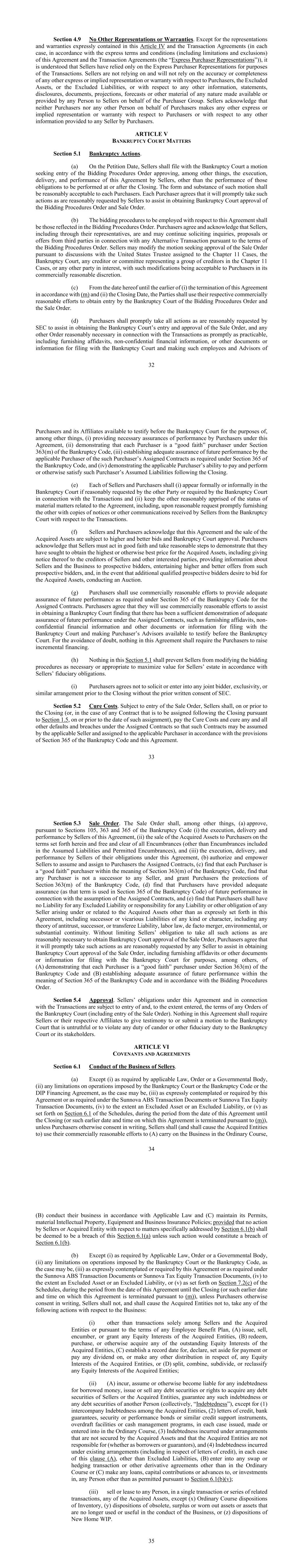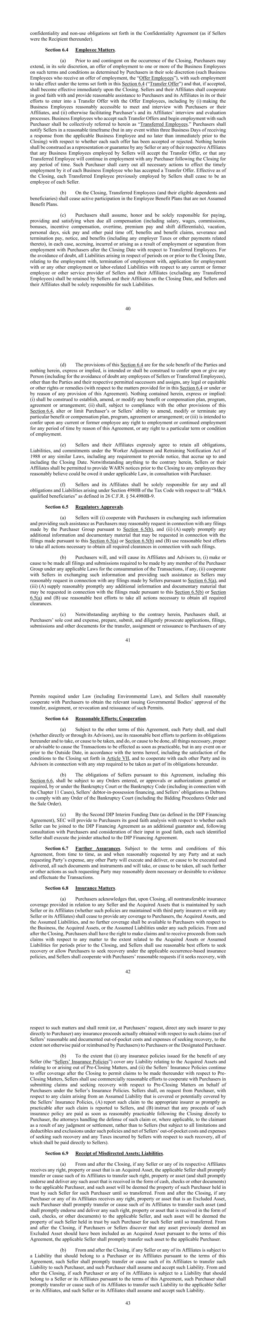 32第4.9节无其他申述或保证。除本条第四条和交易协议中明确包含的陈述和保证(在每种情况下,根据本协议和交易协议的明确条款和条件(包括限制和排除)(“快递买方陈述”))外,据了解,卖方仅为交易的目的依赖快递买方陈述。卖方不依赖、也不会依赖关于买方、除外资产或除外负债的任何其他明示或暗示的陈述或保证的准确性或完整性,或关于任何人代表买方集团向卖方提供或提供的任何其他信息、声明、披露、文件、预测、预测或任何性质的其他材料的准确性或完整性。卖方承认,买方或代表买方的任何其他人均不对买方或买方向任何卖方提供的任何其他信息作出任何其他明示或暗示的陈述或保证。第五条破产法院事项第5.1节破产诉讼。(a)在呈请日期,卖方应向破产法院提交一项动议,要求进入招标程序命令,除其他事项外,批准卖方执行、交付和履行本协议,但在交割时或交割后履行这些义务除外。该动议的形式和实质内容应合理地为每一买方所接受。各买方同意,其将迅速采取卖方合理要求的行动,以协助获得破产法院对投标程序命令和销售命令的批准。(b)将就本协议采用的招标程序应为招标程序令中所反映的程序。买方同意并承认,卖方,包括通过其代表,正在并可能继续根据招标程序令的条款就任何替代交易向第三方征求询价、提议或要约。卖方可根据与分配给第11章案件的美国受托人、破产法院、在第11章案件中代表一组债权人的任何债权人或委员会或任何其他利益方的讨论,修改寻求批准销售订单的动议,买方在其商业上合理的酌处权下可接受此类修改。(c)自本协议之日起至(i)根据(m)和(ii)截止日期终止本协议的较早者,双方应利用各自在商业上合理的努力,争取破产法院进入投标程序令和出售令。(d)买方应迅速采取SEC合理要求的所有行动,以协助在切实可行范围内尽快获得破产法院的录入和批准销售令,以及与交易有关的任何其他合理必要的命令,包括提供誓章、非机密财务信息或其他文件或信息,以提交破产法院,并使33名买方及其关联公司的此类雇员和顾问可在破产法院作证,以便(其中包括)(i)提供买方根据本协议履行义务的必要保证,(ii)证明每个买方都是《破产法》第363(m)条规定的“善意”买方,(iii)根据《破产法》第365条的要求确立适用买方对该买方所转让合同的未来履约的充分保证,以及(iv)证明适用买方在交割后支付和履行或以其他方式满足该买方所承担的责任的能力。(e)卖方和买方中的每一方应(i)在另一方合理要求或破产法院就交易提出要求的情况下正式或非正式地在破产法院出庭,以及(ii)使另一方合理地了解与协议有关的重大事项的状况,包括在合理要求下迅速向另一方提供卖方从破产法院收到的有关交易的通知或其他通信的副本。(f)卖方和买方承认,本协议和收购资产的出售取决于更高和更好的出价和破产法院的批准。买方承认,卖方必须本着诚意行事,并采取合理步骤,证明他们已寻求获得所收购资产的最高价格或其他最优价格, 包括向卖方的债权人和其他利害关系方发出通知,向潜在投标人提供有关卖方和业务的信息,接受这些潜在投标人提出的更高和更好的报价,以及在有更多合格的潜在投标人希望对收购资产进行投标的情况下,进行拍卖。(g)买方应按照《破产法》第365条对转让合同的要求,以商业上合理的努力为未来履约提供充分保证。买方同意,他们将使用商业上合理的努力来协助获得破产法院的裁定,认为已有充分证明充分保证转让合同下的未来履约,例如提供宣誓书、非机密财务信息和其他文件或信息,以向破产法院提交文件,并使买方顾问能够在破产法院作证。为免生疑问,本协议中的任何内容均不得要求买方筹集增量融资。(h)本条第5.1款的任何规定均不得阻止卖方根据卖方的信托义务,在必要或适当的情况下修改投标程序,以实现卖方财产价值最大化。(i)未经SEC事先书面同意,买方同意在交割前不征求或达成任何联合竞标人、排他性或类似安排。第5.2节治愈成本。在输入销售订单的情况下,卖方应在交割时或之前(或者,在根据第1.5节交割后将转让的任何合同的情况下,在该转让日期或之前)支付治愈费用并纠正所转让合同项下的任何和所有其他违约和违约行为,以便此类合同可由适用的卖方承担并根据《破产法》第365节和本协议的规定转让给适用的买方。34第5.3节销售订单。除其他事项外,出售令应(a)根据《破产法》第105、363和365条批准(i)卖方执行、交付和履行本协议,(ii)按照本协议规定的条款向买方出售所收购的资产,并免于和清除所有产权负担(包括在假定负债和允许的产权负担中的产权负担除外),以及(iii)卖方执行、交付和履行其在本协议下的义务,(b)授权并授权卖方承担并将转让合同转让给买方,(c)发现每个买方都是《破产法》第363(m)条所指的“善意”买方,发现任何买方都不是任何卖方的继承人,并授予买方《破产法》第363(m)条的保护,(d)发现买方就所转让合同的承担提供了对未来履约的充分保证(因为该术语在《破产法》第365条中使用),(e)认定买方对任何卖方在所购资产项下产生的或与之相关的任何责任或其他义务不承担任何除外责任或责任,但本协议明文规定的除外,包括任何种类或性质的继承或替代责任,包括任何反托拉斯理论、继承或受让人责任、劳动法、事实上的合并、
