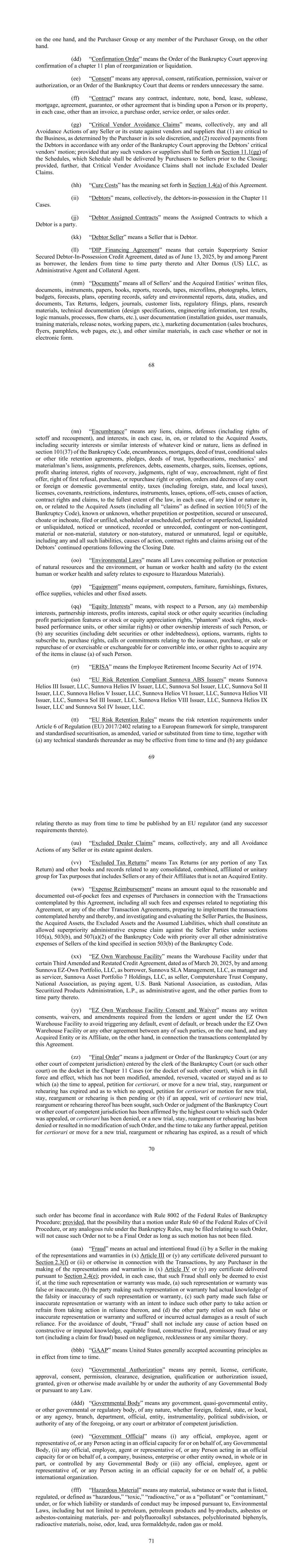 68条,而买方集团或买方集团的任何成员,另一方面。(dd)“确认令”指破产法院批准确认第11章重整或清算计划的命令。(ee)“同意”是指任何批准、同意、批准、许可、放弃或授权,或破产法院认为或使其没有必要的命令。(ff)“合同”是指对个人或其财产具有约束力的任何合同、契约、票据、债券、租赁、转租、抵押、协议、担保或其他协议,在每种情况下,除发票、采购订单、服务订单或销售订单外。(gg)“关键供应商避免索赔”统称为任何卖方或其财产针对卖方和供应商的任何和所有避免诉讼,这些诉讼(1)对业务至关重要,由买方自行决定,以及(2)根据破产法院批准债务人的关键供应商动议的任何命令从债务人收到付款;但任何此类卖方或供应商应按附表第11.1(gg)节提出,该附表应由买方在交割前交付给卖方;此外,但前提是,关键供应商避免索赔不应包括排除的经销商索赔。(hh)“治疗费用”具有本协议第1.4(a)节规定的含义。(ii)“债务人”统称为第11章案件中的债务人占有人。(jj)“债务人转让合同”是指债务人作为当事人的转让合同。(kk)“债务人卖方”是指作为债务人的卖方。(ll)“DIP融资协议”是指某些Superpriorty高级有担保债务人-占有权信贷协议,日期为2025年6月13日,由作为借款人的母公司、不时作为其当事人的放款人以及作为行政代理人和抵押品代理人的Alter Domus(US)LLC签署。(mm)“文件”是指卖方和被收购实体的所有书面文件、文件、仪器、文件、书籍、报告、记录、磁带、缩微胶卷、照片、信件、预算、预测、计划、运营记录、安全和环境报告、数据、研究和文件、纳税申报表、分类账、期刊、客户名单、监管备案、计划、研究材料、技术文件(设计规范、工程信息、测试结果、逻辑手册、流程、流程图等)、用户文件(安装指南、用户手册、培训材料、发布说明、工作底稿等)、营销文件(销售手册、传单、小册子、网页等),以及其他类似材料,在每种情况下,无论是否采用电子形式。69(nn)“产权负担”是指在每种情况下,在被收购资产上、或与之相关的任何留置权、债权、抗辩(包括抵销权和补偿权)和权益,包括担保权益或任何种类或性质的类似权益、《破产法》第101(37)条定义的留置权、产权负担、抵押、信托契据、有条件出售或其他所有权保留协议、质押、信托契据、质押、机械师和材料人的留置权、转让、优先权、债务、地役权、押记、诉讼、许可、期权、利润分享权益、追偿权、判决、路权、侵占、优先要约权、优先购买权,或回购权利或选择权、任何法院或外国或国内政府实体的命令和法令、税收(包括外国、州和地方税)、许可、契约、限制、契约、文书、租赁、期权、抵销、诉讼因由、合同权利和债权,在每种情况下,在每种情况下,在所获得的资产(包括《破产法》第101(5)条中定义的所有已知或未知的“债权”,无论是前请愿或后请愿、有担保或无担保、选择或早期、已备案或未备案、已安排或未安排、已完善或未完善、已清算或未清算,注意到或未注意到、已记录或未记录、或有或非或有、重大或非重大、法定或非法定、已到期或未到期、合法或衡平法,包括任何和所有此类责任、诉讼因由、合同权利和因债务人在截止日期后的持续经营而产生的索赔。(oo)“环境法”是指有关污染或保护自然资源和环境,或人类或工人健康和安全(在人类或工人健康和安全与接触有害材料有关的范围内)的所有法律。(pp)“设备”是指设备、计算机、家具、摆设、固定装置、办公用品、车辆等固定资产。(qq)“权益”是指,就个人而言,任何(a)会员权益、合伙权益、利润权益、 股本或其他股本证券(包括利润参与特征或股票或股权增值权、“幻影”股票权利、基于股票的业绩单位或其他类似权利)或该人的其他所有权权益,或(b)任何证券(包括债务证券或其他债务)、期权、认股权证、认购权、购买权、与发行、购买、出售或回购或可行使或交换或可转换为或可转换为该人的任何项目有关的催缴或承诺,或获得(a)条中任何项目的其他权利。(rr)“ERISA”是指1974年《雇员退休收入保障法》。(ss)“符合欧盟风险保留标准的Sunnova ABS发行人”是指Sunnova Helios III发行人,LLC、Sunnova Helios IV发行人,LLC、Sunnova Sol发行人,LLC、Sunnova Sol II发行人,LLC、Sunnova Helios V发行人,LLC、Sunnova Helios VI发行人,LLC、Sunnova Helios VII发行人,LLC、Sunnova Sol III发行人,LLC、Sunnova Helios VIII发行人,LLC、Sunnova Helios IX发行人,LLC和Sunnova Sol IV发行人,LLC。(tt)“欧盟风险保留规则”是指(EU)2017/2402条例第6条规定的风险保留要求,涉及欧洲简单、透明和标准化证券化框架,并经不时修订、更改或替代,连同(a)该条例下可能不时有效的任何技术标准和(b)欧盟监管机构可能不时发布的与此相关的任何指南70(及其任何后续要求)。(uu)“被排除的经销商索赔”统称为任何卖方或其财产对经销商的任何和所有回避诉讼。(vv)“排除的纳税申报表”是指纳税申报表(或任何纳税申报表的任何部分)以及与任何合并、合并、关联或单一集团相关的其他账簿和记录,用于税务目的,其中包括卖方或其任何非被收购实体的关联公司。(ww)“费用偿还”是指相当于买方与本协议所设想的交易有关的合理且有文件证明的自付费用和开支的金额,包括与谈判本协议或任何其他交易协议有关的所有此类费用和