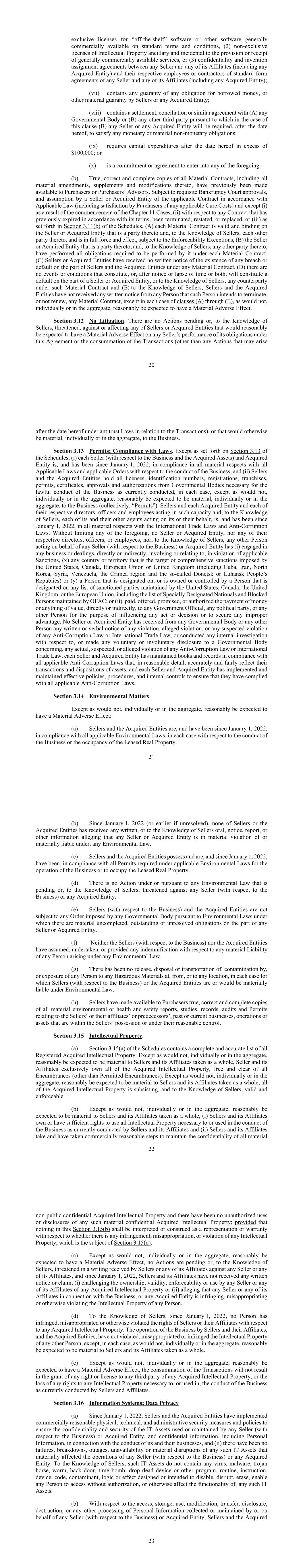 20项针对“现成”软件或一般按标准条款和条件商业上可获得的其他软件的独家许可,(2)提供或接受一般商业上可获得的服务所附带和附带的知识产权非独家许可,或(3)任何卖方及其任何关联公司(包括任何被收购实体)与其各自的雇员或承包商之间的任何卖方及其任何关联公司(包括任何被收购实体)的标准格式协议的保密和发明转让协议;(vii)包含对所借资金的任何义务的任何担保,或卖方或任何被收购实体的其他重大担保;(viii)包含与(a)任何政府机构或(b)任何其他第三方的和解、调解或类似协议,据此,在本条款(b)的情况下,任何卖方或任何被收购实体将被要求在本协议日期之后履行任何货币或重大非货币义务;(ix)要求在本协议日期之后的资本支出超过100,000美元;或(x)是订立上述任何一项的承诺或协议。(b)所有重大合同的真实、正确和完整副本,包括对其的所有重大修订、补充和修改,以前已提供给采购人或采购人顾问。须经必要的破产法院批准,并由卖方或被收购实体根据适用法律承担适用的合同(包括买方清偿任何适用的治愈费用),但(i)由于第11章案件的启动,(ii)对于先前已根据其条款到期、已终止、重述或替换的任何合同,或(iii)附表第3.11(b)节所述,(a)每份重要合同均有效并对作为其一方的卖方或被收购实体具有约束力,并且,据卖方及其彼此当事人所知,并在可执行性例外的情况下具有完全的效力和效力,(b)作为其当事人的卖方或被收购实体,以及据卖方所知,作为其当事人的任何其他当事人,已履行了其在每一份重大合同项下要求履行的所有义务,(c)卖方或被收购实体未收到卖方和被收购实体在任何重大合同项下存在任何违约或违约的书面通知,(d)不存在构成的事件或条件,或,在通知或时间流逝或两者兼而有之后,将构成卖方或被收购实体方面的违约,或据卖方所知,此类重大合同项下的任何交易对手和(e)卖方所知,卖方和被收购实体没有收到任何人的任何书面通知,表明该人打算终止或不再续签任何重大合同,但(a)至(e)条款的每一种情况除外,因为合理地预计单独或合计不会产生重大不利影响。第3.12节无诉讼。没有任何待决的诉讼,或据卖方所知,没有对任何卖方或被收购实体构成威胁、针对或影响的诉讼,这些诉讼可以合理地预期会对任何卖方履行其在本协议下的义务或完成交易产生重大不利影响(根据反垄断法与交易相关的日期之后可能在21日之后出现的任何诉讼除外),或者对业务单独或总体而言具有重大影响。第3.13节许可;遵守法律。除附表第3.13节规定的情况外,(i)每个卖方(就业务和被收购资产而言)和被收购实体自2022年1月1日以来在所有重大方面均遵守与业务开展有关的所有适用法律和适用命令,以及(ii)卖方和被收购实体持有目前合法开展业务所需的所有执照、识别号、注册、特许经营权、许可证、证书、批准和政府机构的授权,在每种情况下,除非不会,单独或合计,合理预期对企业具有重要意义,单独或合计(统称“许可”)。卖方和每个被收购实体及其各自以这种身份行事的董事、管理人员和雇员,据卖方所知,其每一位及其代表其或他们行事的其他代理人,自2022年1月1日以来,在所有重大方面都遵守《国际贸易法》和《反腐败法》。在不限制上述任何规定的情况下,任何卖方或被收购实体,或其各自的任何董事、高级管理人员或雇员,也不据卖方所知, 代表任何卖方(就业务)或被收购实体行事的任何其他人(i)在违反适用制裁的情况下直接或间接从事涉及或涉及(x)美国、加拿大、欧洲联盟或英国(包括古巴、伊朗、朝鲜、叙利亚、委内瑞拉、克里米亚地区和所谓的顿涅茨克或卢甘斯克人民共和国)实施全面制裁的任何国家或地区的任何业务或交易,或(y)被指定在,或由美国、加拿大、英国或欧盟维护的任何受制裁方名单上指定的人拥有或控制,包括OFAC维护的特别指定国民和被阻止人员名单;或(ii)直接或间接向任何政府官员、任何政党或任何其他人支付、提供、承诺或授权支付金钱或任何有价值的东西,以影响任何行为或决定或确保任何不正当利益。没有任何卖方或被收购实体从任何政府机构或任何其他人收到任何违反、涉嫌违反或涉嫌违反任何反腐败法或国际贸易法的书面或口头通知,或就任何实际、涉嫌或涉嫌违反任何反腐败法或国际贸易法的行为进行任何内部调查,或向政府机构自愿或非自愿披露,每个卖方和被收购实体都按照所有适用的反腐败法保存账簿和记录,这些法律在合理的细节上,准确、公平地反映其交易和资产处置情况,每个卖方和被收购实体都实施并维护了有效的政策、程序和内部控制,以确保其遵守所有适用的反腐败法律。第3.14节环境事项。除个别或总体上不会合理预期会产生重大不利影响的情况外:(a)卖方和被收购实体自2022年1月1日以来一直遵守所有适用的环境法,在每种情况下都与经营业务或租赁不动产的占用有关。22(b)自2022年1月1日(如未解决则更早)以来,没有任何卖方或被收购实体收到任何书面或卖方知悉的口头、通知、报告或其他信息,声称任何卖方或被收购实体严重违反任何环境法或根据任何环境法承担重大责任。(c)卖方和被收购实体拥有并自2022年1月1日以来一直遵守适用的环境法要求的经营业务或占用租赁不动产的所有许可。(d)没有根据或依据任何环境法采取的行动有待执行,或据卖方所知,