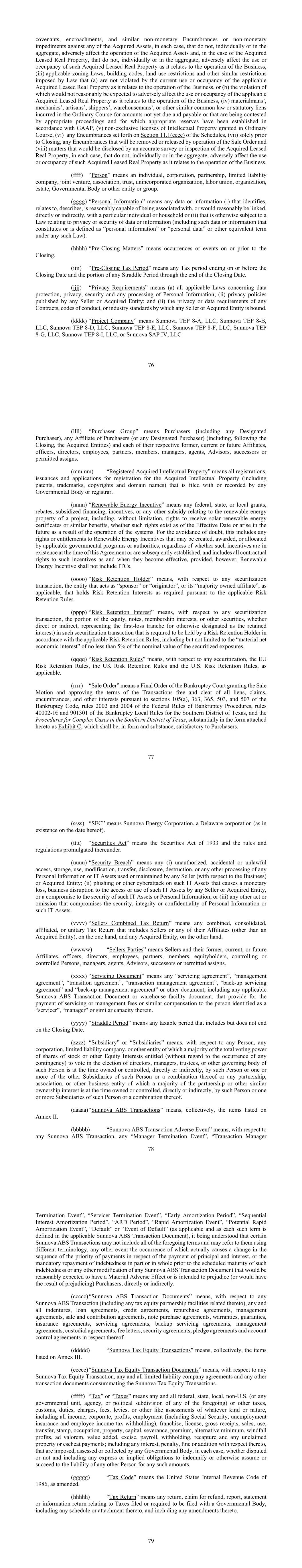 76项针对任何被收购资产的契诺、侵占和类似的非货币产权负担或非货币障碍,在每种情况下,不会单独或合计对被收购资产的运营产生不利影响,就被收购租赁不动产而言,不会单独或合计对此类被收购租赁不动产的使用或占用产生不利影响,因为这与业务运营有关,(iii)适用的分区法律、建筑规范,土地使用限制和法律规定的其他类似限制,即(a)适用的已取得租赁不动产的当前使用或占用不因与业务经营有关而违反,或(b)由于与业务经营有关,合理地预计其违反不会对适用的已取得租赁不动产的使用或占用产生不利影响,(iv)材料商、机械师、工匠、托运人、仓库管理员,或其他类似的普通法或法定留置权在普通课程中因尚未到期和应付的金额或正受到适当程序质疑且已根据公认会计原则为其建立适当准备金的金额而产生,(v)在普通课程中授予的知识产权的非排他性许可,(vi)附表第11.1节(eeee)中规定的任何产权负担,(vii)仅在交割前,将通过执行出售令消除或解除的任何产权负担,以及(viii)将通过对所购租赁不动产进行准确调查或检查而披露的事项,在每种情况下,不会单独或总体上对所收购的租赁不动产的使用或占用产生不利影响,因为这与业务运营有关。(ffff)“人”是指个人、公司、合伙企业、有限责任公司、合营企业、协会、信托、非法人组织、工会、组织、产业、政府机构或其他实体或团体。(gggg)“个人信息”是指(i)识别、涉及、描述、合理能够与特定个人或家庭直接或间接关联或将合理关联的任何数据或信息,或(ii)以其他方式受有关数据或信息的隐私或安全的法律(包括构成或被定义为“个人信息”或“个人数据”或任何此类法律下的其他等同术语的此类数据或信息)的任何数据或信息。(hhhh)“交割前事项”是指交割当日或之前发生的事项或事项。(iii)“交割前税期”是指在交割日期或之前结束的任何税期以及任何跨期至交割日期结束的部分。(jjjj)“隐私要求”是指(a)有关数据保护、隐私、安全和任何个人信息处理的所有适用法律;(ii)任何卖方或被收购实体公布的隐私政策;(ii)任何卖方或被收购实体受约束的任何合同、行为准则或行业标准的隐私或数据要求。(KKKK)“项目公司”指Sunnova TEP 8-A,LLC、Sunnova TEP 8-B,LLC、Sunnova TEP 8-D,LLC、Sunnova TEP 8-E,LLC、Sunnova TEP 8-F,LLC、Sunnova TEP 8-G,LLC、Sunnova TEP 8-I,LLC或Sunnova SAP IV,LLC。77(lLLL)“买方集团”是指买方(包括任何指定买方)、买方的任何关联公司(或任何指定买方)(包括,在交割后,被收购实体)及其各自的前任、现任或未来关联公司、高级职员、董事、雇员、合伙人、成员、经理、代理人、顾问、继任者或允许的受让人。(mmm)“已注册的已获知识产权”是指向任何政府机构或注册商提交或记录的所有已获知识产权(包括专利、商标、版权和域名)的注册、发布和注册申请。(nNNN)“Renewable能源激励”是指与项目的可再生能源财产有关的任何联邦、州或地方赠款、回扣、补贴融资、激励措施或任何其他补贴,包括但不限于获得太阳能可再生能源证书或类似福利的权利,无论这些权利在生效日期存在还是在未来因系统的运行而产生。为免生疑问,这包括适用的政府计划或当局可能创建、授予或分配的对Renewable能源激励措施的任何权利或权利,无论此类激励措施在本协议签订时是否已经存在或随后是否已经建立,并包括此类激励措施生效时的所有合同权利,但前提是,Renewable能源激励措施不包括ITC。(oooo)“风险保留持有人”是指, 就任何证券化交易而言,根据适用的风险保留规则的要求,作为“发起人”或“发起机构”的实体,或其“拥有多数股权的关联公司”(如适用)持有风险保留权益。(pppp)“风险自留权益”是指,就任何证券化交易而言,代表该证券化交易中首亏部分(或以其他方式指定为自留权益)的股权、票据、会员权益或其他证券,无论是直接或间接的,根据适用的风险自留规则要求由风险自留持有人持有的部分,包括但不限于不低于证券化敞口面值5%的“重大净经济权益”。(qqqq)“风险保留规则”是指,就任何证券化而言,欧盟风险保留规则、英国风险保留规则和美国风险保留规则(如适用)。(rrrr)“出售令”是指破产法院根据《破产法》第105(a)、363、365、503和507条、《联邦破产程序规则》第2002和2004条、《德克萨斯州南区破产地方规则》第40002-1欧元和901301条以及德克萨斯州南区复杂案件程序,基本上以本协议所附的形式作为附件 C批准交易条款的最终命令,该命令应为,在形式和实质上,令购买者满意。78(ssss)“SEC”是指Sunnova Energy Corporation,一家特拉华州公司(如在本协议日期存在)。(tttt)“证券法”是指1933年《证券法》及其下颁布的规章制度。(uuuu)“安全漏洞”是指任何(i)未经授权、意外或非法访问、存储、使用、修改、转移、披露、销毁或对任何卖方(就业务而言)或被收购实体使用或维护的任何个人信息或IT资产进行任何其他处理;(ii)对此类IT资产进行网络钓鱼或其他网络攻击,造成金钱损失、任何卖方或被收购实体访问或使用此类IT资产的业务中断,或损害此类IT资产或个人信息的安全性;或(iii)任何其他损害安全性的作为或不作为,个人信息或此类IT资产的完整性或保密性。(vvvv)“卖方合并纳税申报表”是指任何合并、合并、关联或单一的纳税申报表,一方面包括卖方或其任何关联公司(被收
