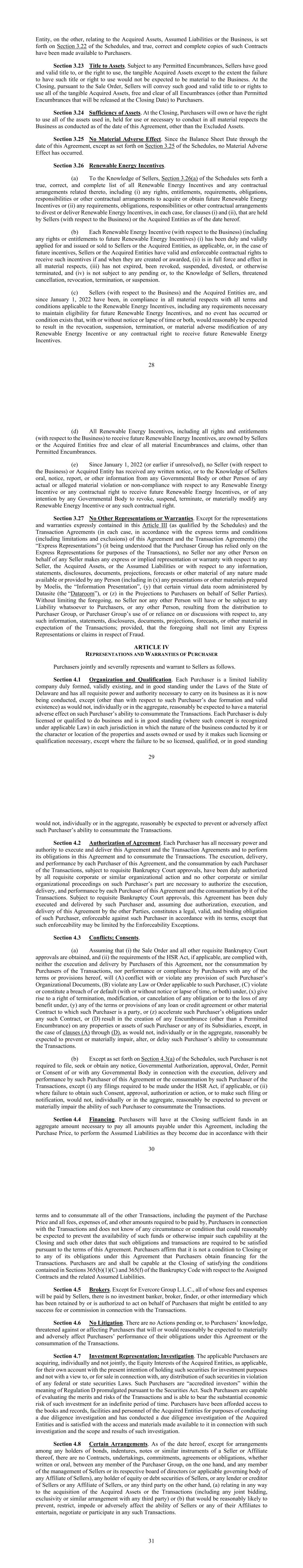 28另一方面,与收购资产、假定负债或业务有关的实体载于附表第3.22节,此类合同的真实、正确和完整副本已提供给买方。第3.23节资产所有权。在任何允许的产权负担的情况下,卖方对有形获得的资产拥有良好和有效的所有权或使用权,除非未能拥有此种所有权或使用权预计不会对企业产生重大影响。在交割时,根据出售订单,卖方将向买方转让对所有有形收购资产的此类良好且有效的所有权或使用权,免于所有产权负担(将在交割日期解除的许可产权负担除外)。第3.24节资产充足性。在交割时,买方将拥有或有权使用截至本协议日期所开展业务所使用、为使用而持有或为在所有重大方面开展业务所必需的所有资产,但除外资产除外。第3.25节无实质性不利影响。自资产负债表日期至本协议日期,除附表第3.25节规定的情况外,未发生任何重大不利影响。第3.26节Renewable能源激励。(a)据卖方所知,附表第3.26(a)节列出了所有Renewable能源激励措施及其相关的任何合同安排的真实、正确和完整的清单,包括(i)获取或获得未来Renewable能源激励措施的任何权利、权利、要求、义务、责任或其他合同安排,或(ii)卖方(就业务而言)或被收购实体在本协议日期为(i)和(ii)条款持有的任何要求、义务、责任或其他合同安排,以剥离或交付Renewable能源激励措施(在每种情况下)。(b)每份Renewable能源激励(就业务而言)(包括未来Renewable能源激励的任何权利或权利)(i)已妥为有效地申请并酌情向卖方或被收购实体(如适用)发行或出售,或者,就未来激励而言,卖方或被收购实体拥有有效和可执行的合同权利以接收此类激励,前提是这些激励在创建或授予时,(ii)在所有重大方面均完全有效,(iii)尚未到期、被撤销、暂停、剥离或以其他方式终止,(iv)不受任何待决或卖方知悉的威胁取消、撤销、终止或暂停的影响。(c)卖方(就业务而言)和被收购实体(自2022年1月1日以来)在所有重大方面均遵守适用于Renewable能源激励措施的所有条款和条件,包括维持未来Renewable能源激励措施资格所必需的任何要求,并且没有发生任何事件或条件存在,无论是否通知或时间推移,或两者兼而有之,均合理预期会导致任何Renewable能源激励措施或接收未来Renewable能源激励措施的任何合同权利被撤销、暂停、终止或重大不利修改。29(d)所有Renewable能源激励措施,包括(与业务相关的)获得未来Renewable能源激励措施的所有权利和权利,均由卖方或被收购实体拥有,不受任何重大产权负担和债权的影响,但允许的产权负担除外。(e)自2022年1月1日(或更早,如未解决)以来,没有任何卖方(就业务而言)或被收购实体收到任何书面通知,或据卖方所知,任何政府机构或其他人提供的任何实际或涉嫌的重大违规或不遵守情况的口头、通知、报告或其他信息,或任何政府机构撤销、暂停、终止或实质性修改任何Renewable能源激励措施或任何此类合同权利的任何意图。第3.27节无其他申述或保证。除本第三条(由附表限定)和交易协议(在每种情况下,根据本协议和交易协议的明示条款和条件(包括限制和排除)(“明示陈述”)中明确包含的陈述和保证(据了解,买方集团仅为交易的目的依赖明示陈述)外,任何卖方或代表任何卖方的任何其他人均不对任何卖方、被收购资产作出任何明示或默示的陈述或保证,或承担的责任或关于任何信息、报表, 任何人提供或提供的任何性质的披露、文件、预测、预测或其他材料(包括在(x)中由Moelis准备的任何演示文稿或其他材料,“信息演示文稿”,(y)由Datasite管理的某些虚拟数据室(“Dataroom”),或(z)在代表卖方方向买方提供的预测中)。在不限制上述规定的情况下,任何卖方或任何其他人都不会对买方或任何其他人承担或承担因向买方集团分发、或买方集团使用或依赖或讨论任何此类信息、声明、披露、文件、预测、预测或预期交易的其他材料而导致的任何责任;但上述规定不应限制与欺诈有关的任何明示陈述或索赔。第四条买方买方对卖方的连带代表和保证如下。第4.1节组织和资格。每个买方都是根据特拉华州法律正式成立、有效存在并具有良好信誉的有限责任公司,并拥有开展其目前正在开展的业务所需的一切必要权力和权力,但合理预期单独或总体上不会对该买方完成交易的能力产生重大不利影响的除外(就该买方的适当形成和有效存在而言除外)。每一买方均获得正式许可或有资格开展业务,并在其所开展的业务的性质或其拥有或使用的财产和资产的性质或位置使此类许可或资格成为必要的每个法域内具有良好的信誉(在适用法律承认此种概念的情况下),除非未能获得如此许可、合格或信誉良好30不会单独或总体上合理地预期会阻止或对该买方完成交易的能力产生不利影响。第4.2节协议的授权。每一买方拥有执行和交付本协议和交易协议以及履行其在本协议中的义务和完成交易的所有必要权力和权力。每一买方执行、交付和履行本协议,以及每一买方完成交易,但须经必要的破产法院批准,已获得所有必要的公司或类似组织行动的正式授权,该买方方面无需进行其他公司或类似组织程序来授权每一买方执行、交付和履行本协议并由其完成交易。在获得必要的破产法院批准的情况下,本协议已由该买方正式签署和交付,并假定其他方适当授权、执行和交付本协议,构成该买方的一项法律、有效和具有约束力