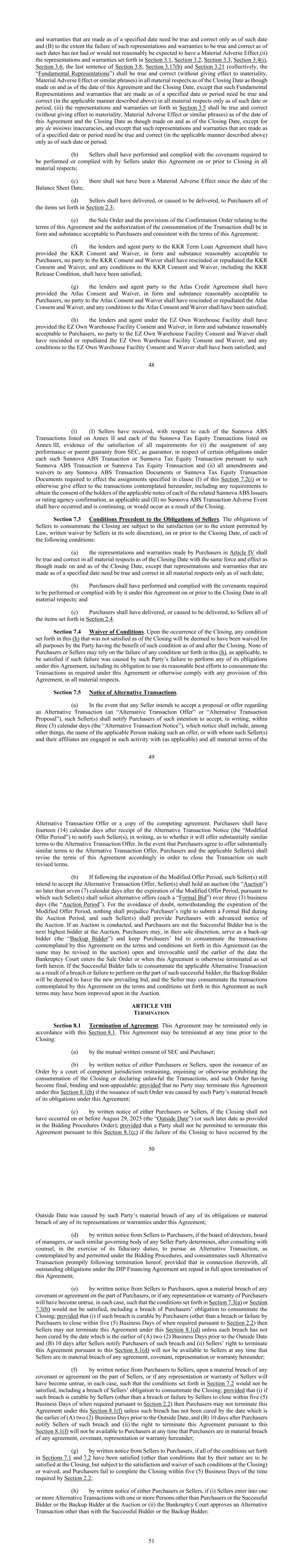 48及于指明日期作出的保证,只须在该日期及(b)在截至该日期该等陈述及保证不属真实及正确的情况下,并未产生或不会合理地预期会产生重大不利影响,(ii)第3.1节、第3.2节、第3.3节、第3.4(i)节、第3.6节、第3.8节最后一句、第3.17(b)节和第3.21节(统称“基本陈述”)所载的陈述及保证,须为真实及正确(但不影响重要性,重大不利影响或类似短语)在截止日期的所有重大方面,犹如是在本协议日期和截止日期作出的一样,但在指明日期或期间作出的基本陈述和保证只需在该日期或期间在所有重大方面是真实和正确的(以上述适用方式),(iii)第3.5节所述的陈述和保证应是真实和正确的(不影响重要性,重大不利影响或类似短语)截至本协议日期和结束日期,犹如在结束日期和截至结束日期作出的一样,但任何极小程度的不准确之处除外,及除非于指明日期或期间作出的该等陈述及保证,只须于该日期或期间(以上述适用方式)为真实及正确;(b)卖方在所有重大方面均已履行及遵守根据本协议须由卖方履行或遵守的契诺;(c)自资产负债表日期起,不会产生重大不利影响;(d)卖方应已交付或促使交付,向买方提供第2.3节所列的所有项目;(e)售货单和确认单中有关本协议条款和完成交易的授权的规定,其形式和实质应为买方可接受的,并与本协议的条款一致;(f)KKR定期贷款协议的贷款人和代理方应已在形式和实质上为买方合理可接受的情况下提供了KKR同意和豁免,KKR同意和豁免的任何一方均不得撤销或否定KKR同意和豁免,且KKR同意和豁免的任何条件,包括KKR释放条件,均应已满足;(g)Atlas信贷协议的贷方和代理方应已在买方合理可接受的形式和实质上提供Atlas同意和豁免,Atlas同意和豁免的任何一方均不得撤销或否定Atlas同意和豁免,且Atlas同意和豁免的任何条件应已满足;(h)EZ自有仓库融资项下的贷款人和代理人应已提供EZ自有仓库融资同意和豁免,其形式和实质应为买方合理接受,EZ自有仓库融资同意和豁免的任何一方均不得撤销或否定EZ自有仓库融资同意和豁免,且EZ自有仓库融资同意和豁免的任何条件应已满足;及49(i)(i)卖方已收到,就附件二所列的每一笔Sunnova ABS交易和附件三所列的每一笔Sunnova税务股权交易而言,满足(i)SEC作为担保人转让任何履约或母担保的所有要求的证据,就每项该等Sunnova ABS交易或Sunnova税务股权交易项下的某些义务而言,根据该等Sunnova ABS交易或Sunnova税务股权交易,以及(ii)对任何Sunnova ABS交易文件或Sunnova税务股权交易文件的所有修订和豁免,以实现本第7.2(i)条第(i)款规定的转让或以其他方式使本协议项下所设想的交易生效,包括取得每一相关Sunnova ABS发行人的适用票据持有人同意或评级机构确认的任何要求,如适用,以及(II)Sunnova ABS交易不利事件不应已经发生并正在继续,或将因关闭而发生。第7.3节卖方义务的先决条件。卖方完成交割的义务须在交割日期当日或之前满足(或在法律允许的范围内,由卖方自行决定书面放弃)以下各项条件:(a)买方在第四条中作出的陈述和保证在截止日期的所有重大方面均应是真实和正确的,其效力和效力与在截止日期当日和截止日期作出的相同, 但截至指明日期作出的陈述及保证,只须自该日期起,在所有重大方面均属真实及正确;(b)买方须已在所有重大方面履行及遵守根据本协议规定须由其履行或遵守的契诺;及(c)买方须已向卖方交付或安排交付第2.4节所列的所有物品。第7.4节放弃条件。在交割发生时,本(h)中规定的截至交割时未得到满足的任何条件将被视为在交割时及交割后受益于该条件的一方为所有目的而被放弃。任何买方或卖方均不得依赖本(h)规定的任何条件(如适用)未能得到满足,前提是该缔约方未能履行其在本协议项下的任何义务,包括其在所有重大方面按本协议要求尽合理最大努力完成交易或以其他方式遵守本协议任何规定的义务。第7.5节替代交易的通知。(a)如果任何卖方打算接受有关替代交易的提议或要约(“替代交易要约”或“替代交易提议”),则该等卖方应在三(3)个日历日内(“替代交易通知”)以书面形式通知买方接受该提议或要约的意向,该通知应包括(其中包括)提出该要约的适用人员的姓名,或与该等卖方及其关联公司从事该活动的人(如适用)以及50替代交易要约的所有重要条款或竞争协议的副本。买方应在收到替代交易通知(“经修改的要约期”)后的十四(14)个日历日内,以书面通知该等卖方,说明其是否将提供与替代交易要约基本相似的条款。如果买方同意提供与替代交易要约基本相似的条款,买方和适用的卖方应相应地修改本协议的条款,以便根据这些修改后的条款完成交易。(b)如在修改后的要约期届满后,该等卖方仍有意接受替代交易要约,则卖方应不迟于修改后的要约期届满后七(7)个历日举行拍卖(“拍卖”),据此,该等卖方应在三(3)个工作日(“拍卖期”)内征集替代要约(每个“正式出价”)。为免生疑问,尽管经修改的要约期已届满,但不应损害买方在拍卖期内提交正式出价的权利,该等卖方应向买方提供拍卖的提前通知。如进行拍卖,而买方并非中标人,但在拍卖中是次高出价者,买方可自行决定作为备用投标人(“备用投标人”),保持买方根据本协议规定的条款和条件(可能在拍卖中修改)完成本协议所设想的交易的出价公开且不可撤销,直至破产法院下达买卖令之日或本协议另有规定的本协议