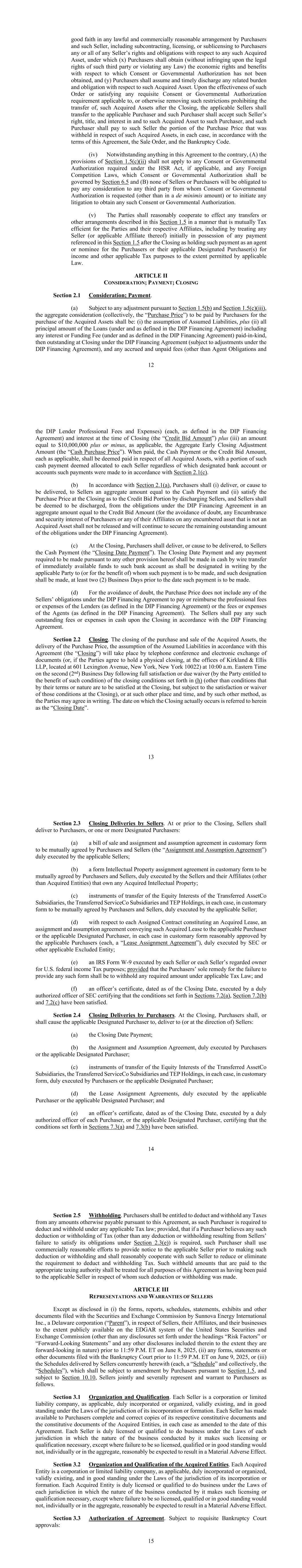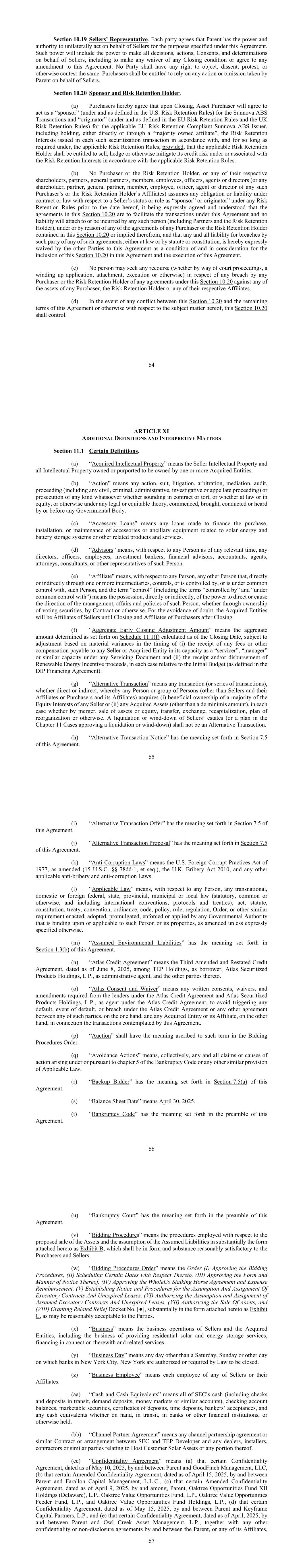 64第10.19节卖方代表。各方同意,母公司有权为本协议规定的目的单方面代表卖方行事。此类权力将包括代表卖方作出所有决定、行动、同意和决定的权力,包括对任何成交条件作出任何放弃或同意对本协议的任何修订。任何一方均无权对此提出异议、异议、抗议或以其他方式提出异议。买方有权依赖母公司代表卖方采取的任何作为或不作为。第10.20节保荐机构和风险自留持有人。(a)买方特此同意,在交割时,资产买方将同意担任Sunnova ABS交易的“发起人”(根据美国风险保留规则并在其定义下)和适用的欧盟风险保留合规Sunnova ABS发行人的“发起人”(根据欧盟风险保留规则和英国风险保留规则并在其定义下),包括直接或通过“多数拥有的关联公司”持有根据适用的风险保留规则并在其要求的时间内,在每笔此类证券化交易中发行的风险保留权益;但前提是,适用的风险自留持有人有权根据适用的风险自留规则出售、对冲或以其他方式减轻其在风险自留权益项下或与之相关的信用风险。(b)任何买方或风险保留持有人,或其各自的股东、合伙人、普通合伙人、成员、雇员、高级职员、代理人或董事(或任何股东、合伙人、普通合伙人、成员、雇员、高级职员、代理人或任何此类买方或风险保留持有人关联公司的董事)在本协议日期之前就卖方作为任何风险保留规则下的“发起人”或发起人”的地位或角色承担合同或法律规定的任何义务或责任,经明确同意和理解,本条10.20中的协议是为了促进本协议项下的交易,任何此类人(包括合伙人和风险保留持有人)不会根据或由于本条10.20中所载或由此暗示的任何买方或风险保留持有人的任何协议而承担或承担任何责任,并且该等方在法律上或在法规或宪法上违反任何此类协议的任何和所有责任,本协议其他各方特此明确放弃,作为将本第10.20条纳入本协议并执行本协议的条件和考虑。(c)任何人不得就任何买方或风险保留持有人违反根据本条第10.20条订立的任何协议而针对任何买方、风险保留持有人或其各自的任何附属公司的任何资产寻求任何追索(不论是通过法院程序、清盘申请、扣押、执行或其他方式)。(d)如本条第10.20条与本协定其余条款发生任何冲突或与本协定标的事项发生其他冲突,则由本条第10.20条控制。65 XI条附加定义和解释事项第11.1节的某些定义。(a)“获得的知识产权”是指卖方的知识产权以及一个或多个被收购实体拥有或声称拥有的所有知识产权。(b)“诉讼”是指由任何政府机构或在其面前提起、提起、进行或审理的任何诉讼、诉讼、诉讼、仲裁、调解、审计、程序(包括任何民事、刑事、行政、调查或上诉程序)或任何类型的起诉,无论是听起来像是合同或侵权行为,还是在法律或衡平法上,或在任何法律或衡平法理论下,或以其他方式。(c)“附属贷款”是指为购买、安装或维护与太阳能和电池存储系统或其他相关产品和服务相关的配件或附属设备而提供的任何贷款。(d)“顾问”就截至任何有关时间的任何人而言,指该人的任何董事、高级职员、雇员、投资银行家、财务顾问、会计师、代理人、律师、顾问或其他代表。(e)就任何人而言,“关联公司”是指通过一个或多个中间人直接或间接控制、或受该人控制、或与该人处于共同控制之下的任何其他人,而“控制”一词(包括“受其控制”和“与其共同控制”一词)是指直接或间接拥有通过合同或其他方式指导或导致该人的管理、事务和政策方向的权力。为免生疑问, 被收购实体在交割前将是卖方的关联公司,在交割后将是买方的关联公司。(f)“提前结算调整总额”是指按附表11.1(f)所列确定的截至结算日期的总额,但可根据以下时间上的重大差异进行调整:(i)根据任何服务文件以“服务商”、“管理人”或类似身份收到应付给任何卖方或被收购实体的任何费用或其他补偿,以及(ii)收到和/或支付Renewable能源奖励收益,在每种情况下均相对于初始预算(如DIP融资协议中所定义)。(g)“替代交易”是指任何个人或群体(卖方及其关联公司或买方及其关联公司除外)通过合并、出售资产或股权、转让、交换、资本重组、重组计划或其他方式获得(i)任何卖方多数股权的实益所有权或(ii)任何获得的资产(微量金额除外)的任何交易(或系列交易),无论是直接还是间接交易。卖方财产的清算或清盘(或第11章案例中批准清算或清盘的计划)不应成为替代交易。(h)“替代交易通知”具有本协议第7.5节规定的含义。66(i)“替代交易要约”具有本协议第7.5节规定的含义。(j)“替代交易建议书”具有本协议第7.5节规定的含义。(k)“反腐败法”是指经修订的1977年美国《反海外腐败法》(15 U.S.C. § 78dd-1等)、2010年英国《反贿赂法》以及任何其他适用的反贿赂和反腐败法律。(l)“适用法律”就任何人而言是指任何跨国、国内或外国联邦、州、省、市或地方法律(成文法、普通法或其他法律,包括国际公约、议定书和条约)、法案、法规、宪法、条约、公约、条例、法典、政策、规则、条例、命令或任何政府当局颁布、通过、颁布、执行或适用的对该人或其财产具有约束力或适用的其他类似要求,经修订,除非另有明确规定。(m)“承担的环境责任”具有本协议第1.3(b)节规定的含义。(n)“Atlas信贷协议”指作为借款人的TEP Holdings、作为行政代理人的Atlas Securitized Pr