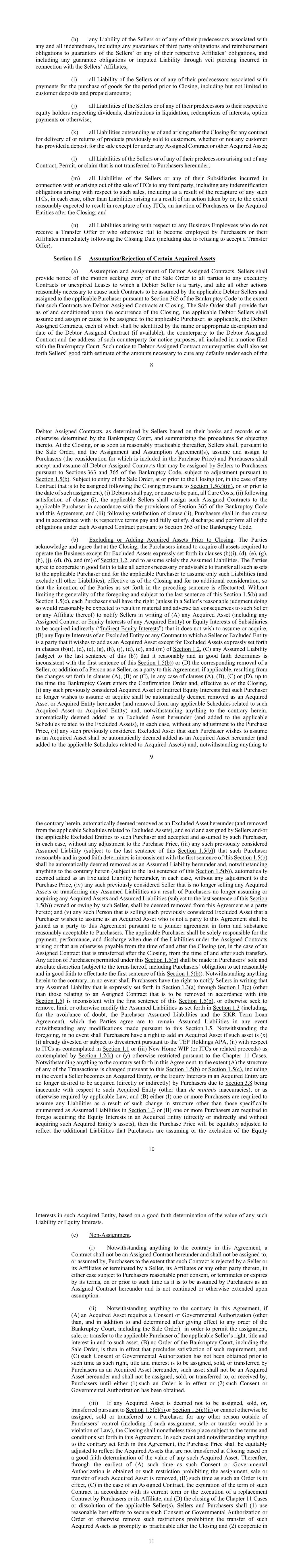 8(h)卖方或其任何前任与任何和所有债务相关的任何责任,包括对第三方义务的任何担保和对卖方或其各自关联公司义务的担保人的偿付义务,包括与卖方关联公司有关的任何担保义务或通过面纱穿孔产生的推定责任;(i)卖方或其任何前任与交割前期间购买货物的付款相关的所有责任,包括但不限于客户保证金和预付金额;(j)卖方或其任何前任对其各自权益持有人在股息、清算中的分配、赎回权益、期权付款或其他方面的所有负债;(k)截至交割时和交割后产生的所有未偿负债,用于交付或返还先前向客户销售的产品的任何合同,无论是否有任何客户为出售提供了定金,但根据任何转让合同或其他获得的资产除外;(l)卖方或其任何前任因任何合同、许可或索赔而产生的、未根据本协议转让给买方的所有负债;(m)卖方或其任何子公司因向任何第三方出售ITC而招致或产生的所有负债,包括与此类销售有关的任何赔偿义务,包括因重新获得任何此类ITC而产生的任何赔偿义务,在每一种情况下,除因任何ITC采取的行动或在合理预期会导致任何ITC被夺回的范围内,买方或被收购实体在交割后不作为而产生的负债外;(n)与未收到转让要约或在其他方面未能在截止日期后立即受雇于买方或其关联公司(包括由于拒绝接受转让要约)的任何商业雇员有关的所有负债。第1.5节假设/拒绝某些收购资产。(a)债务人转让合同的承担和转让。卖方应向债务人卖方作为一方的任何已执行合同或未到期租约的所有各方提供寻求进入销售订单的动议通知,并采取合理必要的所有其他行动,以使此类合同由适用的债务人卖方承担并根据《破产法》第365条转让给适用的买方,前提是此类合同在交割时为债务人转让合同。售卖单应规定,自交割发生时起并以交割发生为条件,适用的债务人卖方应承担并转让或促使转让给适用的买方(如适用)债务人转让合同,每一份合同均应通过债务人转让合同的名称或适当描述和日期(如有)、债务人转让合同的对应方以及为通知目的该对应方的地址加以识别,所有这些均包含在向破产法院提交的通知中。向债务人转让合同对应方发出的此种通知还应载列卖方根据卖方根据其簿册和记录确定或破产法院以其他方式确定的对9份债务人转让合同项下的每一份合同所规定的纠正任何违约所需的必要金额的善意估计,并概述对其提出异议的程序。在交割时,或其后在合理可行的范围内尽快,卖方应根据销售订单以及转让和承担协议承担并转让给买方(其对价包含在购买价格中),买方应接受并承担卖方根据《破产法》第363和365条可能转让给买方的所有债务人转让合同,但须根据第1.5(b)条进行调整。在买卖订单输入的情况下,在交割时或之前(或就根据第1.5(c)(iii)节交割后将转让的任何合同而言,在该转让日期或之前),(i)债务人应支付或促使支付所有补救费用,(ii)在满足第(i)款后,适用的卖方应根据《破产法》第365条和本协议的规定将该等转让合同转让给适用的买方,以及(iii)在满足第(ii)款后,买方应根据《破产法》第365条在适当的时候并按照其各自的条款支付并完全履行、解除和履行每份转让合同项下的所有义务。(b)在交割前排除或增加收购资产。双方承认并同意,在收盘时, 买方打算收购经营业务所需的所有资产,但第1.2节(b)(i)、(d)、(e)、(g)、(h)、(j)、(d)、(b)和(m)条明确规定的除外资产除外,并仅承担所承担的负债。双方同意本着诚意合作,采取一切必要或可取的行动,将所有此类资产转让给适用的买方,并让适用的买方仅承担此类负债(并排除所有其他负债),自交割时起生效,且无需额外对价,以便实现前一句所述各方的意图。在不限制前述内容的概括性的情况下,并在不违反本条第1.5(b)款和第1.5(c)款最后一句的情况下,每一买方均有权(除非卖方合理判断这样做会合理预期会对该卖方或其任何关联公司造成重大不利的税务后果)以书面通知卖方(a)其不希望承担或取得的任何已取得资产(包括任何已转让合同或任何已取得实体的股权)或拟间接取得的子公司的股权(“间接股权”),(b)被排除实体的任何股权或卖方或被排除实体是其希望作为获得资产加入的一方的任何合同,但第1.2条(b)(i)、(d)、(e)、(g)、(h)、(j)、(d)、(c)和(m)中明确规定的排除资产除外,(c)其合理和善意地确定与本条第1.5(b)条第一句不一致的任何假定责任(以本(b)最后一句为准)或(d)相应的解除卖方,或增加一人作为卖方,作为本协议的一方(如适用),由于(a)、(b)或(c)条规定的变更,在(a)、(b)、(c)或(d)条的任何情况下,直至破产法院下达确认令之时为止,并且自结案之日起生效,(i)该买方不再希望承担或获得的任何此类先前被视为已获得的资产或间接股权,应自动被视为根据本协议被收购资产或被收购实体(并从与该被收购资产或被收购实体相关的任何适用附表中删除),并且,尽管本文有任何相反的规定,在每种情况下,自动被视为在本协议下被添加为排除资产(并被添加到与排除资产相关的适用附表中),在不对购买价格进行任何调整的情况下,(ii)该买方希望作为获得资产承担的任何此类先前被视为排除资产应自动被视为在本协议下被添加为获得资产(并被添加到与获得资产相关的适用附表中),并且,尽管本文中有任何相反的规定10,自动被视为在本协议下被排除为排除资产(并从与排除资产相关的适用附表中删除),并由卖方和/