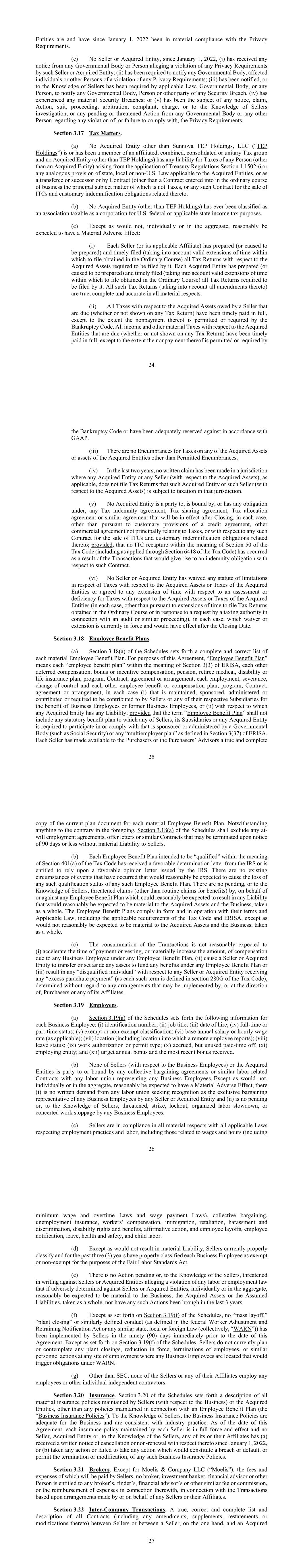 24家实体目前和自2022年1月1日以来一直在实质上遵守隐私要求。(c)自2022年1月1日以来,没有任何卖方或被收购实体(i)收到任何政府机构或个人的任何通知,声称此类卖方或被收购实体违反了任何隐私要求;(ii)被要求将违反任何隐私要求的情况通知任何政府机构、受影响个人或其他人;(iii)已被通知,或在卖方知情的情况下,已被适用法律、政府机构或任何人要求将任何安全漏洞通知任何政府机构、个人或其他方,(iv)已经历任何重大安全漏洞;或(v)已成为任何通知、申索、诉讼、诉讼、程序、仲裁、投诉、指控的对象,或卖方调查的知情对象,或任何政府机构或任何其他人就任何违反或未能遵守隐私要求而提出的任何未决或威胁诉讼。第3.17节税务事项。(a)除Sunnova TEP Holdings,LLC(“TEP Holdings”)外,没有任何被收购实体是或曾经是关联、合并、合并或单一税务集团的成员,也没有任何被收购实体(TEP Holdings除外)对任何人(被收购实体除外)因适用财政部条例第1.1502-6节或适用于被收购实体的州、地方或非美国法律的任何类似规定而产生的税款承担任何责任,或作为受让人或继承人或通过合同(在正常业务过程中订立的主要标的不是税款的合同,或任何此类ITC销售合同以及与之相关的惯常赔偿义务除外。(b)就美国联邦或适用的州所得税而言,没有任何被收购实体(TEP Holdings除外)被归类为应作为公司征税的协会。(c)除个别或总体上合理预期不会产生重大不利影响的情况外:(i)每个卖方(或其适用的关联公司)已编制(或促使编制)并及时提交(考虑到在普通课程中获得的有效延长提交时间)其要求提交的与所购资产有关的所有纳税申报表。每个被收购实体已准备(或促使准备)并及时提交(考虑到在普通课程中获得的有效延长提交时间)其要求提交的所有纳税申报表。所有该等报税表(考虑到其所有修订)在所有重大方面均属真实、完整及准确。(ii)卖方所欠已取得资产的所有应缴税款(无论是否显示在任何纳税申报表上)均已及时足额缴纳,但《破产法》允许或要求不缴纳的情况除外。与被收购实体有关的所有到期收入和其他重要税款(无论是否显示在任何纳税申报表上)均已及时全额缴纳,除非《破产法》第25条允许或要求不缴纳,或已根据公认会计原则进行了充分的预留。(三)除许可的担保物外,对被收购实体的任何被收购资产或资产不存在征税的担保物。(iv)在过去两年中,没有在任何被收购实体或任何卖方(就被收购资产而言)(如适用)未提交纳税申报表表明该被收购实体或该卖方(就被收购资产而言)须在该司法管辖区纳税的司法管辖区提出书面索赔。(v)任何被收购实体都不是任何税务赔偿协议、分税协议、分税协议或类似协议的一方、受其约束或根据其承担任何义务,而这些协议、分税协议或类似协议将在交割后生效,在每种情况下,除了根据信贷协议的习惯规定、其他主要与税收无关的商业协议,或就任何此类ITC销售合同和与之相关的习惯赔偿义务而言;但,未发生《税法》第50条含义内的ITC重新获取(包括通过《税法》第6418条适用的情况),因为交易会产生与该合同有关的赔偿义务。(vi)没有任何卖方或被收购实体放弃与被收购资产或被收购实体的税收有关的任何税务时效,或同意延长与被收购实体的被收购资产或税收有关的评估或税收不足的任何时间(在每种情况下,除非根据延长提交在普通课程中获得的纳税申报表的时间或响应税务机关就审计或类似程序提出的请求), 在每种情况下,哪种豁免或延期目前有效,并将在截止日期后生效。第3.18款员工福利计划。(a)附表第3.18(a)节列出每项重要雇员福利计划的完整和正确清单。就本协议而言,“雇员福利计划”指ERISA第3(3)节所指的每项“雇员福利计划”,彼此递延补偿、奖金或奖励补偿、养老金、退休人员医疗、残疾或人寿保险计划、计划、合同、协议或安排,每项雇佣、遣散、控制权变更以及彼此的雇员福利或补偿计划、计划、合同、协议或安排,在每种情况下(i)由卖方或其各自的任何子公司为业务雇员或前业务雇员的利益维持、赞助、管理或贡献或要求贡献,或(ii)任何被收购实体对此负有任何责任;但“雇员福利计划”一词不应包括任何卖方、其子公司或任何被收购实体被要求参与或遵守的由政府机构(如社会保障)或ERISA第3(37)节定义的任何“多雇主计划”赞助或管理的任何法定福利计划。每个卖方都向买方或买方顾问提供了每个重要员工福利计划的真实完整的26份当前计划文件副本。尽管上述有任何相反的规定,附表第3.18(a)节应排除任何可在90天或更短时间的通知后终止的随意雇佣协议、要约函或类似合同,而不对卖方承担重大责任。(b)每项拟在税法第401(a)条含义内“合格”的员工福利计划均已收到IRS的有利确定函,或有权依赖IRS出具的有利意见函。不存在合理预期会导致任何此类员工福利计划丧失任何此类资格状态的已发生事件的现有情况。任何雇员福利计划、代表或针对任何可合理预期会导致合理预期对所收购资产和业务整体而言具有重大意义的任何责任的未决或卖方所知的威胁索赔(例行福利索赔除外)。雇员福利计划在形式上和运作上均符合其条款和适用法律,包括税法和ERISA的适用要求,但合理预期对收购资产和业务整体而言并不重要的情况除外。(c)交易的完成没有被合理预期会(i)加快支付或