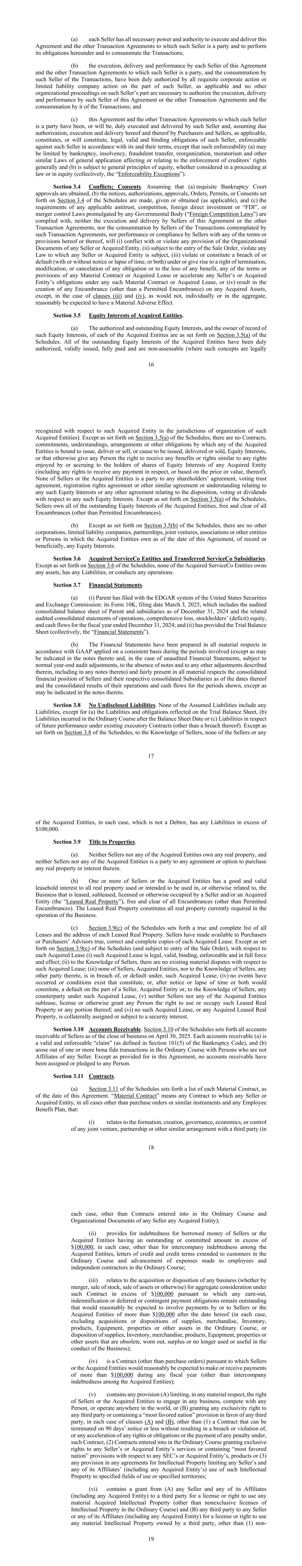 16(a)每一卖方拥有一切必要的权力和权力,以执行和交付本协议及该卖方作为一方的其他交易协议,并履行其在本协议项下的义务和完成交易;(b)每一卖方执行、交付和履行本协议及该卖方作为一方的其他交易协议,以及该卖方完成交易,均已获得该卖方所有必要的公司行动或有限责任公司行动的正式授权,(c)本协议和每一卖方作为一方的其他交易协议已经或将要由该卖方正式签署和交付,并假定适当授权,由买方和卖方(如适用)执行和交付本协议及其,构成或将构成该卖方的法律、有效和具有约束力的义务,可根据其及其条款对此类卖方强制执行,但此类可执行性(a)可能受到破产、无力偿债、欺诈性转让、重组、暂停执行和其他影响或与强制执行债权人权利有关的一般适用的类似法律的限制,以及(b)受衡平法一般原则的约束,无论是在法律程序中还是在衡平法中考虑(统称为“可执行性例外”)。3.4节冲突;同意。假设(a)获得必要的破产法院批准,(b)作出、给予或获得(如适用)附表第3.4节所载的通知、授权、批准、命令、许可或同意,以及(c)任何适用的反垄断、竞争、外国直接投资或“FDI”的要求,或任何政府机构颁布的合并控制法(“外国竞争法”)均未得到遵守,卖方既未执行和交付本协议或其他交易协议,卖方也未完成此类交易协议所设想的交易,卖方履行或遵守本协议或其任何条款或规定,也不会(i)与任何卖方或被收购实体的组织文件的任何规定相冲突或违反,(ii)受制于销售订单的输入,违反任何卖方或被收购实体所受的任何法律,(iii)违反或构成违反或违约(无论是否通知或时间流逝,或两者兼而有之),或导致终止、修改或取消任何义务的权利或任何利益的损失,任何重大合同或收购租赁的任何条款或规定,或加速任何卖方或被收购实体在任何此类重大合同或收购租赁下的义务,或(iv)导致对任何收购资产产生任何产权负担(许可产权负担除外),但在第(iii)和(iv)条的情况下,合理地预期不会单独或合计产生重大不利影响的情况除外。第3.5节被收购实体的股权。(a)每一被收购实体的已获授权和未偿还的股权,以及该等股权的记录所有人,如附表第3.5(a)节所述。被收购实体的所有未偿股权均已获得正式授权、有效发行、全额支付且不可评估(如果此类概念在此类被收购实体的组织管辖范围内就此类被收购实体获得法律认可17)。除附表第3.5(a)节规定的情况外,没有任何合同、承诺、谅解、安排或其他义务使任何被收购实体有义务发行、交付或出售,或促使发行、交付或出售股权,或以其他方式赋予任何人获得任何利益或权利的权利,类似于任何被收购实体的股权股份持有人所享有或应计的任何权利(包括就其价格或价值收取任何付款的任何权利)。卖方或被收购实体均不是任何股东协议、投票信托协议、登记权协议或其他与任何此类股权有关的类似协议或谅解或与任何此类股权有关的处置、投票或股息有关的任何其他协议的一方。除附表第3.5(a)节规定的情况外,卖方拥有被收购实体的所有未偿股权, 免于所有产权负担(许可产权负担除外)。(b)除附表第3.5(b)节规定的情况外,截至本协议签署之日,被收购实体没有其他法团、有限责任公司、合伙企业、合资企业、协会或其他实体或个人拥有任何记录在案或实益权益。3.6节收购ServiceCo实体并转让ServiceCo子公司。除附表第3.6节规定的情况外,被收购的ServiceCo实体均不拥有任何资产、拥有任何负债或开展任何业务。第3.7节财务报表。(a)(i)母公司已向美国证券交易委员会EDGAR系统提交:其10K表格,提交日期为2025年3月3日,其中包括截至2024年12月31日的母公司和子公司经审计的合并资产负债表以及截至2024年12月31日的财政年度相关经审计的合并经营报表、综合亏损、股东(赤字)权益和现金流量表;(ii)已提供试行资产负债表(统称“财务报表”)。(b)财务报表在所有重大方面均按照所涉期间一致适用的公认会计原则编制(附注中可能注明的除外,如为未经审计的财务报表,则须按正常的年终审计调整、在没有附注的情况下以及在其中所述的任何其他调整的情况下,包括在其任何附注中),并在所有重大方面公平列报卖方及其各自的综合附属公司截至其日期的综合财务状况及其所示期间的综合经营业绩和现金流量,但其附注中可能注明的除外。第3.8节无未披露负债。除(a)试行资产负债表所反映的负债和义务、(b)在资产负债表日之后的普通课程中发生的负债或(c)与现有执行合同下的未来履行有关的负债(违约除外)外,所有假定负债均不包括任何负债。除附表第3.8节规定的情况外,据卖方所知,卖方或任何18个被收购实体(在每种情况下均不是债务人)的负债均不超过100,000美元。第3.9节财产所有权。(a)卖方或任何被收购实体均不拥有任何不动产,卖方或任何被收购实体均不是购买其中任何不动产或权益的任何协议或选择的一方。(b)卖方或被收购实体中的一个或多个对卖方和/或被收购实体租赁、转租、许可或以其他方式占用的业务中使用或打算使用或以其他方式与之相关的所有不动产(“租赁不动产”)拥有良好和有效的租赁权益,不存在任何产权负担(许可产权负担除外)。租赁不动产构成业务经营目前所需的全部不动产。(c)附表第3.9(c)条列出所有租赁的真实完整清单及每项租赁不动产的地址。卖方已向买方或买方顾问提供每一份获