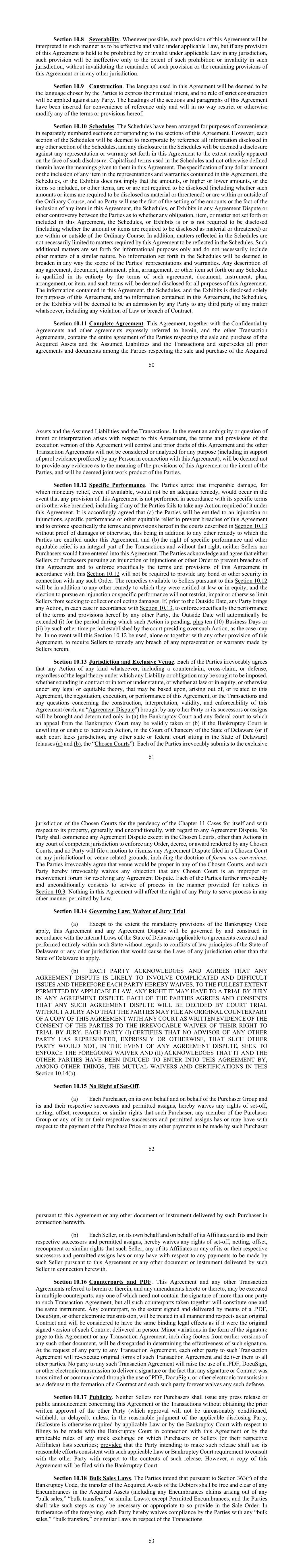 60第10.8节可分割性。只要有可能,本协议的每一项条款将被解释为根据适用法律有效和有效,但如果本协议的任何条款被认为是任何法域的适用法律所禁止或无效,则该条款将仅在该法域的此类禁止或无效范围内无效,而不会使该条款的其余部分或本协议的其余条款或在任何其他法域无效。第10.9节施工。本协议中使用的语言将被视为双方为表达其共同意图而选择的语言,不会对任何一方适用严格的解释规则。本协议各章节和段落的标题仅为便于参考而插入,绝不会限制或以其他方式修改本协议的任何条款或规定。第10.10节附表。为方便起见,已将附表安排在与本协定各节相对应的单独编号的节中。然而,附表的每一节将被视为通过引用纳入附表任何其他节中披露的所有信息,而附表中的任何披露将被视为针对本协议中规定的任何陈述或保证的披露,其范围在此类披露的表面上显而易见。附表中使用且其中未另行定义的大写术语具有本协议赋予它们的含义。本协议、附表或展品所载的陈述和保证中对任何美元金额的说明或任何项目的列入,并不意味着这些金额或更高或更低的金额或如此包括的项目或其他项目被或不被要求披露(包括这些金额或项目是否被要求披露为重大或威胁)或在普通课程范围内或范围外,且任何缔约方都不会利用本协议、附表、或任何协议争议中任何项目被列入的金额设定事实或展品这一事实或各方之间的任何协议争议或其他争议中的任何义务、项目或事项未在本协议、附表或展品中列出或包含是否被要求披露(包括该金额或项目是否被要求披露为重大或威胁)或在普通课程范围内或之外。此外,附表所反映的事项不一定限于本协定要求在附表中反映的事项。此类附加事项仅供参考,不一定包括其他类似性质的事项。附表中列出的任何信息都不会被视为以任何方式扩大了缔约方的陈述和保证的范围。对任何协议、文件、文书、计划、安排或任何附表所列其他项目的任何描述,均受该等协议、文件、文书、计划、安排或项目的条款的全部限定,且该等条款将被视为为本协议的所有目的而披露。本协议、附表和展品中包含的信息仅为本协议的目的而披露,本协议、附表或展品中包含的任何信息均不会被视为任何一方向任何第三方承认任何事项,包括任何违法或违约行为。第10.11节完整协议。本协议连同此处明确提及的保密协议和其他协议以及其他交易协议,包含各方关于收购资产和假定负债的买卖和交易的全部协议,并取代各方之前关于收购61资产和假定负债的买卖和交易的所有协议和文件。如果出现与本协议有关的模棱两可或意图或解释问题,本协议执行版本的条款和规定将控制本协议和其他交易协议的先前草案,不会出于任何目的(包括支持任何人就本协议提供的口头证据)进行审议或分析,将被视为不提供任何关于本协议条款含义或双方意图的证据,并将被视为双方的共同工作产物。第10.12节具体表现。双方同意,不可挽回的损害,对其而言,即使可以获得金钱救济,也不是适当的补救措施, 如果本协议的任何条款未按照其具体条款履行或以其他方式被违反,包括如果任何一方未能根据本协议采取其要求的任何行动,则会发生这种情况。据此商定,(a)双方将有权获得一项或多项强制令、特定履行或其他衡平法救济,以防止违反本协议,并在没有损害或其他证据的情况下在法院具体执行第10.13节所述的本协议条款和规定,这是对双方根据本协议有权获得的任何其他补救的补充,以及(b)特定履行和其他衡平法救济的权利是交易的组成部分,没有这项权利,卖方和买方都不会订立本协议。双方承认并同意,为防止违反本协议并根据本条第10.12款具体执行本协议条款和规定而寻求强制令或强制令或其他命令的卖方或买方将不需要提供与任何此类命令有关的任何保证金或其他担保。根据本条第10.12款向卖方提供的补救办法将是他们在法律上或公平上有权获得的任何其他补救办法的补充,而选择寻求强制令或具体履行将不会限制、损害或以其他方式限制卖方寻求收取或收取损害赔偿。如果在外部日期之前,任何一方提出任何诉讼(在每种情况下均根据第10.13节),以具体强制执行任何其他方履行本协议的条款和规定,则外部日期将自动延长(i)该诉讼待决期间,加上十(10)个工作日或(ii)由主持该诉讼的法院(视情况而定)确定的其他时间段。在任何情况下,本第10.12节都不会被单独使用或与本协议的任何其他条款一起使用,以要求卖方对任何违反卖方在此作出的任何陈述或保证的行为进行补救。第10.13节管辖权和专属地点。每一方当事人不可撤销地同意,任何任何类型的诉讼,包括反诉、交叉索赔或抗辩,无论根据何种法律理论可能寻求施加任何责任或义务,无论是在合同或侵权或法规中听起来,还是在法律或衡平法中,或在任何法律或衡平法理论下以其他方式,可能基于、产生于或与本协议、本协议的谈判、执行或履行有关,或交易以及与构造、解释、有效性有关的任何问题,由任何其他方或其继承人或受让人提起的本协议(每一项,“协议争议”)的可执行性将仅在(a)破产法院和任何可能有效地向其提出破产法院上诉的联邦法院或(b)如果破产法院不愿意或无法审理此类诉讼,则在特拉华州衡平法院(或如果该法院缺乏管辖权,则在特拉华州开庭的任何