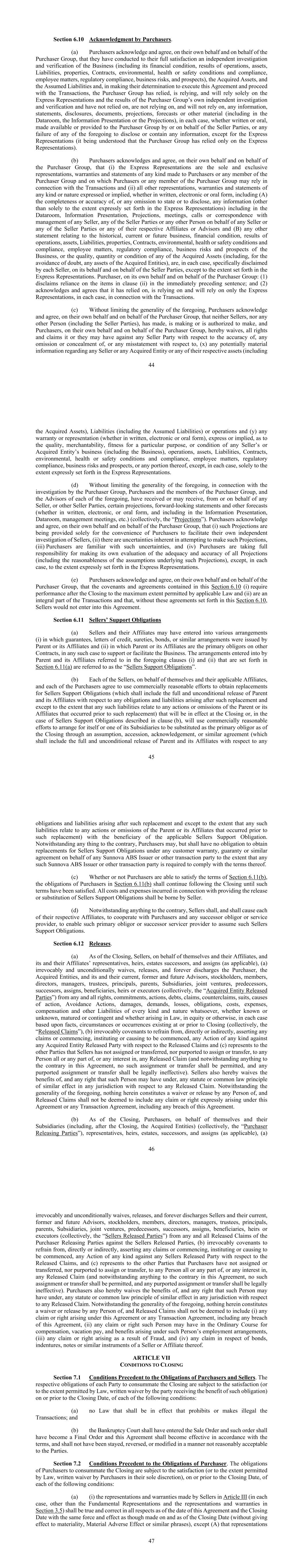 44第6.10节购买者致谢。(a)买方代表自己和买方集团承认并同意,他们已对业务(包括其财务状况、经营成果、资产、负债、财产、合同、环境、健康或安全状况和合规性、员工事项、监管合规、业务风险和前景)、收购资产和承担的负债进行了完全满意的独立调查和核实,并且在确定执行本协议和进行交易时,买方集团一直依赖、正在依赖,并将完全依赖明示陈述和买方集团自己独立调查和核实的结果,没有依赖、不依赖、也不会依赖卖方各方或代表卖方各方向买方集团提供或提供的任何信息、声明、披露、文件、预测、预测或其他材料(包括在数据室、信息介绍或预测中),在每种情况下,无论是书面或口头的,或上述任何一项未能披露或包含任何信息,快递申述除外(据了解,买方集团仅依赖快递申述)。(b)买方代表自己和买方集团承认并同意:(i)明示陈述是向买方或买方集团任何成员作出的唯一和排他性的陈述、保证和陈述,买方或买方集团任何成员在与交易有关时可依赖这些陈述、保证和陈述;(ii)所有其他明示或暗示的任何种类或性质的陈述、保证和陈述,无论是书面、电子形式还是口头形式,包括(a)其完整性或准确性,或任何遗漏陈述或披露、任何信息(仅在明示陈述中明确规定的范围内除外),包括数据室、信息演示、预测、会议、与任何卖方的管理层、任何卖方方或代表任何卖方或任何卖方方或其各自的任何关联公司或顾问的任何其他人的通话或通信,以及(b)与历史、当前或未来业务、财务状况、运营结果、资产、负债、财产、合同、环境、健康或安全条件和合规性、员工事项有关的任何其他声明,监管合规、业务风险和业务前景,或任何被收购资产(包括,为免生疑问,被收购实体的任何资产)的质量、数量或状况,在每种情况下,均由每个卖方、代表其和代表卖方各方明确否认,但特快陈述中规定的范围除外。买方代表自己和买方集团:(1)否认依赖上一句第(ii)款中的项目;(2)承认并同意其在每种情况下仅依赖与交易有关的明示陈述。(c)在不限制前述一般性的情况下,买方代表其本人和买方集团承认并同意,卖方或任何其他人(包括卖方各方)均未作出、正在作出或被授权作出,买方代表其本人和买方集团特此放弃其或他们可能对任何卖方方拥有的关于以下方面的准确性、任何遗漏或隐瞒或任何错误陈述的所有权利和主张,(x)关于任何卖方或任何被收购实体或其各自的任何资产(包括45被收购资产)、负债(包括假定负债)或运营的任何潜在重要信息,以及(y)关于任何卖方或被收购实体的业务(包括业务)、运营、资产、负债、合同、环境、健康或安全条件和合规性、员工事项、监管合规、业务风险和前景或其任何部分的任何明示或暗示的任何保证或陈述(无论是书面、电子或口头形式),但在每种情况下,仅在明示陈述中明确规定的范围内。(d)在不限制前述内容的概括性的情况下,就买方集团的调查而言,买方和买方集团的成员以及上述每一方的顾问已收到或可能收到来自或代表任何卖方或其他卖方当事人的某些预测, 前瞻性陈述和其他预测(无论是书面、电子或口头形式,包括在信息介绍、数据室、管理层会议等中)(统称为“预测”)。买方代表自己并代表买方集团承认并同意:(i)提供此类预测完全是为了方便买方,以便于他们自己对卖方进行独立调查;(ii)试图作出此类预测存在固有的不确定性;(iii)买方熟悉此类不确定性,以及(iv)买方承担自己对所有预测的充分性和准确性(包括此类预测所依据的假设的合理性)进行评估的全部责任,但在每种情况下,在明示陈述中明确规定的范围内除外。(e)买方代表自己和买方集团承认并同意,本条6.10(i)所载的契诺和协议要求在交割后在适用法律允许的最大限度内履行,并且(ii)是交易的组成部分,如果没有本条6.10中规定的这些协议,卖方将不会订立本协议。第6.11节卖方的支持义务(a)卖方及其关联公司可能已订立各种安排(i)其中担保、信用证、担保、债券或类似安排由母公司或其关联公司签发,以及(ii)其中母公司或其关联公司是其他合同的主要义务人,在任何此类情况下以支持或促进业务。第6.11(a)节规定的上述(i)和(ii)条中提及的母公司及其关联公司订立的安排被称为“卖方支持义务”。(b)每一卖方代表自己及其适用的关联公司,以及每一买方同意使用商业上合理的努力来获得卖方支持义务的替代(这应包括母公司及其关联公司就此类替代后产生的任何义务和责任的全部和无条件解除,但任何此类责任与母公司或其关联公司在此类替代之前发生的任何作为或不作为有关的情况除外)将在交割时生效,或,在(b)条所述卖方支持义务的情况下,将通过承担、加入、承认等方式,以商业上合理的努力安排自己或其子公司之一在交割时被替代为主要义务人,或与适用的卖方支持义务的受益人达成的类似协议(其中应包括母公司及其关联公司就此类替换后产生的任何46项义务和责任的完全无条件解除,但任何此类责任与母公司或其关联公司在此类替换之前发生的任何作为或不作为有关的情况除外)。尽管有任何相反的情况,买方可以但没有义务代表任何Sunnova ABS发行人或其他交易方获得替代任何客户保证、保证或类似协议下的卖方支持义务,只要任何此类Sunnova ABS发行人或其他交易方被要求遵守其条款。(c)无论买方是否能够满足第6.11