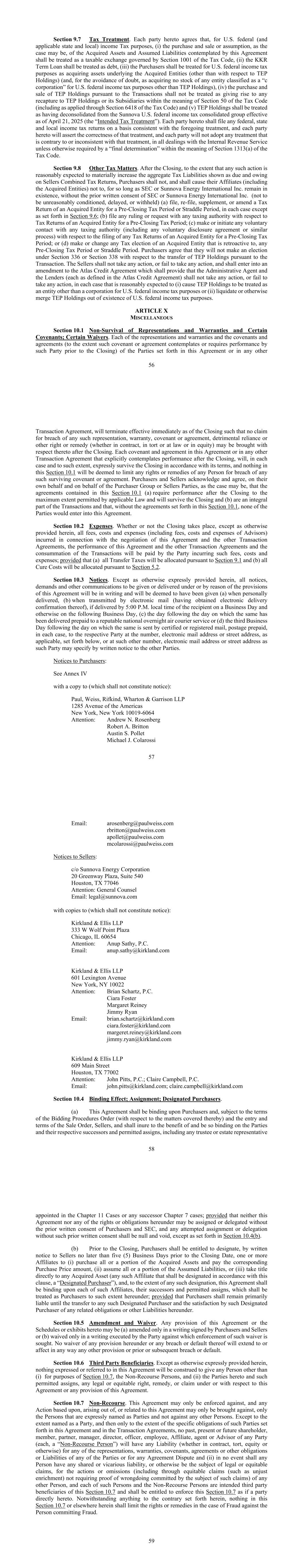 56第9.7节税务处理。本协议各方同意,就美国联邦(以及适用的州和地方)所得税而言,(i)本协议所设想的收购和出售或承担(视情况而定)所收购资产和承担的负债应被视为受税法第1001节管辖的应税交换,(ii)KKR定期贷款应被视为债务,(iii)买方应被视为就美国联邦所得税而言收购被收购实体的基础资产(东电控股除外)(并且,为免生疑问,由于除TEP Holdings外,没有为美国联邦所得税目的收购任何被归类为“c公司”的实体的股票),(iv)根据交易购买和出售TEP Holdings不应被视为引起《税法》第50条含义内的TEP Holdings或其子公司的任何重新获得(包括通过《税法》第6418条适用的),以及(v)TEP Holdings应被视为自2025年4月21日起已从Sunnova美国联邦所得税合并集团中取消合并(“预期税务处理”)。本协议每一方应根据与上述处理一致的基础提交任何联邦、州和地方所得税申报表,本协议每一方将断言该处理的正确性,并且每一方将不会在与美国国税局的所有交易中采取任何与该处理相反或不一致的处理,除非《税法》第1313(a)节含义内的“最终裁定”另有要求。第9.8节其他税务事项。交割后,如果合理预期任何此类行动会大幅增加卖方合并纳税申报表上显示为到期和欠款的总税务负债,则只要SEC或Sunnova能源国际 Inc.仍然存在,买方就不应,也应促使其关联公司(包括被收购实体)不会,未经SEC或Sunnova Energy International Inc.事先书面同意(不得被不合理地附加条件、延迟或扣留)(a)提交、重新提交、补充或修改被收购实体的收盘前纳税申报表期间或跨界期,在每种情况下,除第9.6节规定的情况外;(b)就某一被收购实体的截止前纳税期间的纳税申报表向任何税务机关提出任何裁定或请求;(c)就提交某一被收购实体的截止前纳税期间的任何纳税申报表与任何税务机关进行或发起任何自愿联系(包括任何自愿披露协议或类似程序);或(d)作出或更改任何被收购实体的任何可追溯至任何截止前纳税期间或跨接期的税务选择。买方同意,他们不会根据第336条或第338条就根据交易转让东电控股作出选择。卖方不得采取任何行动,或未采取任何行动,并应订立Atlas信贷协议修正案,其中应规定,行政代理人和贷款人(各自在Atlas信贷协议中定义)不得采取任何行动,或未采取任何行动,在合理预期的每种情况下,(i)导致TEP Holdings在美国联邦所得税目的下被视为公司以外的实体,或(ii)清算或以其他方式合并TEP Holdings,使其不存在美国联邦所得税目的。第十条杂项第10.1节陈述和保证及某些盟约的不存续;某些豁免。本协议或任何其他57项交易协议中规定的各方的每一项陈述和保证以及契诺和协议(在此种契诺或协议设想或要求该方在交割前履行的范围内)将在交割时立即终止,因此在交割后不得就违反任何此类陈述、保证、契诺或协议、有害依赖或其他权利或补救(无论是在合同、侵权或法律或股权方面)提出索赔。本协议或任何其他交易协议中明确考虑在交割后履行的每项契诺和协议,在每种情况下并在此范围内,将根据其条款明确在交割后继续有效,而本条第10.1款的任何规定将不被视为限制任何人因违反任何该等尚存契诺或协议而享有的任何权利或补救措施。买方和卖方承认并同意,代表他们自己并代表买方集团或卖方各方(视情况而定), 本条第10.1(a)款所载协议要求在交割后在适用法律允许的最大限度内履行,并将在交割后继续有效,并且(b)是交易的组成部分,如果没有本条第10.1款规定的协议,任何一方都不会订立本协议。第10.2节费用。无论交割是否发生,除本文另有规定外,与本协议和其他交易协议的谈判、本协议和其他交易协议的履行以及交易的完成有关的所有费用、成本和开支(包括顾问的费用、成本和开支)将由产生此类费用、成本和开支的一方支付;但前提是(a)所有转让税将根据第9.1节分配,(b)所有治疗费用将根据第5.2节分配。第10.3节通知。除本协议另有明确规定外,根据本协议规定或因本协议规定而发出或交付的所有通知、要求和其他通信将以书面形式发出,并将被视为(a)在亲自送达时发出,(b)在通过电子邮件传送时(已获得电子送达确认书),如果在收件人当地时间某个工作日下午5:00之前送达,或在下一个工作日以其他方式送达,(c)以预付方式交付给信誉良好的国家隔夜航空快递服务的翌日,或(d)以核证或挂号邮件、邮资预付方式(在每种情况下)按以下所列的号码、电子邮件地址或街道地址(如适用)或按该缔约方通过书面通知向其他缔约方指明的其他号码、电子邮件地址或街道地址(如适用)发送给相应缔约方的翌日的第三个工作日。致购买者的通知:见附件四并附副本(不应构成通知):Paul,Weiss,Rifkind,Wharton & Garrison LLP 1285 Avenue of the Americas New York,New York 10019-6064收件人:Andrew N. Rosenberg Robert A. Britton Austin S. Pollet Michael J. Colarossi 58邮箱:arosenberg@paulweiss.com rbritton@paulweiss.com apollet@paulweiss.com mcolarossi@paulweiss.com致卖方的通知:c/o Sunnova Energy Corporation 20 Greenway Plaza,Suite 540 Houston,TX 77046收件人:总法律顾问邮箱:legal@sunnova.com并附副本(不应构成通知):Kirkland & Ellis LLP 333 W WolfP.C.电子邮件:anup.sathy@kirkland.com Kirkland & Ellis LLP 601 Lexington Avenue New York,NY 10022收件人:Brian Schartz,P.C. Ciara Foster Margaret Reiney Jimmy Ryan电子邮件:brian.schartz@kirkland.com ciara.foster@kirkland.com margeret.reiney@kirkland.com jimmy.ryan@kirkland.com Kirkland & Ellis LLP 609 Main
