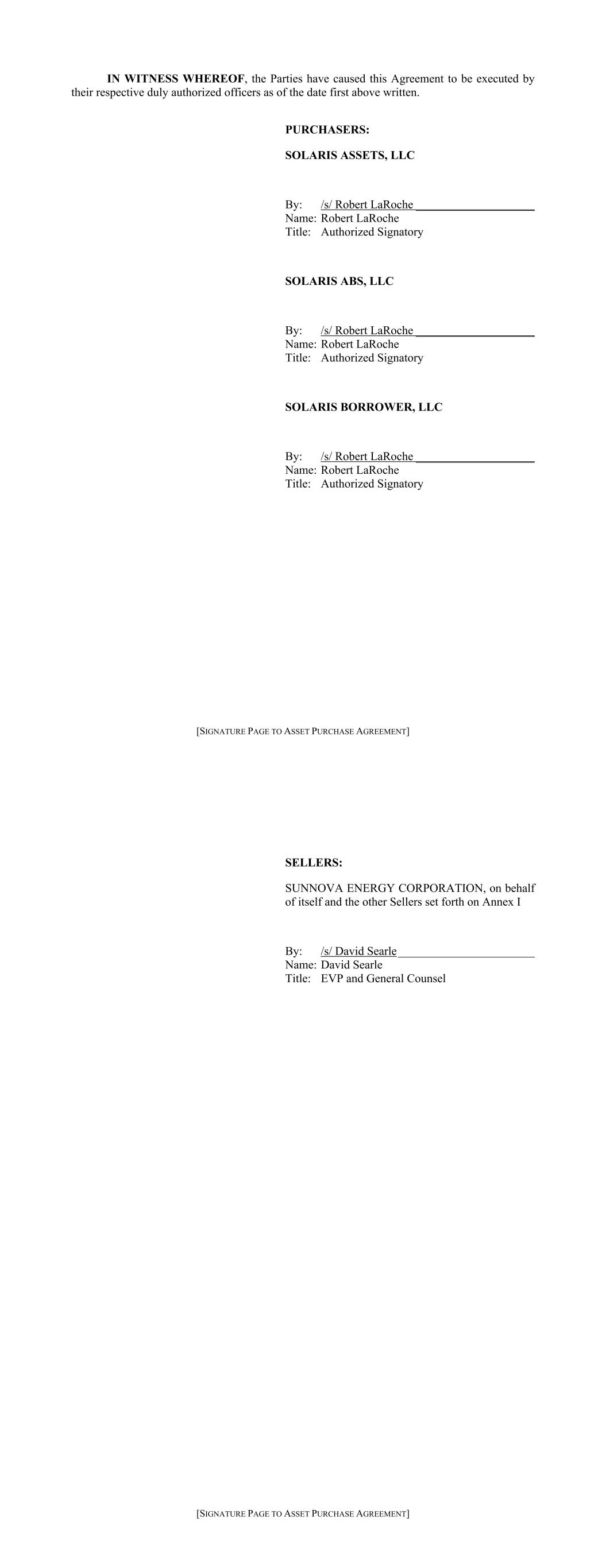 【资产购买协议的签署页】作为证据,双方已安排各自正式授权的官员在上述首次书面日期签署本协议。购买者:SOLARIS ASSETS,LLC by:/s/Robert LaRoche __________________ Name:Robert LaRoche Title:Authorized Signatory SOLARIS ABS,LLC by:/s/Robert LaRoche __________________ Name:Robert LaRoche Title:Authorized Signatory SOLARIS BORROWER,LLC by:/s/Robert LaRoche ______________ Name:Robert LaRoche Title:Authorized Signatory [ Signature Page to Asset Purchase Agreement ]卖方:SUNNOVA ENERGY COROWER