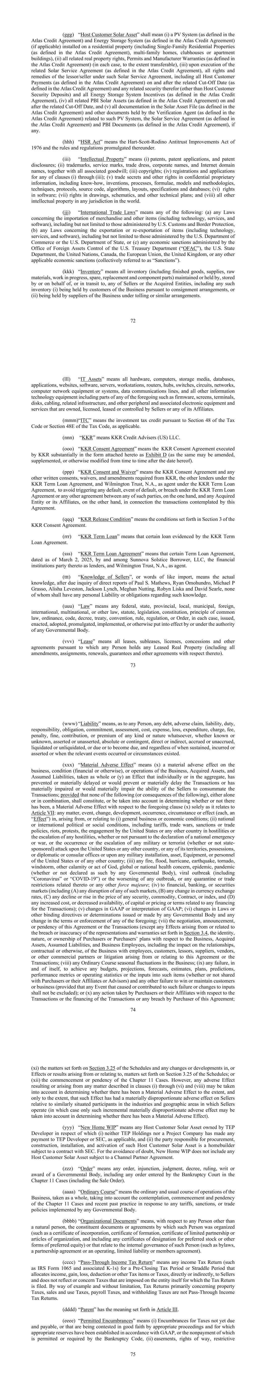 72(ggg)“东道客户太阳能资产”是指(i)安装在住宅物业(包括单户住宅物业(定义见Atlas信贷协议)、多户住宅、会所或公寓楼)上的光伏系统(定义见Atlas信贷协议)和储能系统(定义见Atlas信贷协议)(如适用),(ii)所有相关的不动产权利、许可证和制造商保证(定义见Atlas信贷协议)(在每种情况下,在可转让的范围内),(iii)在执行相关太阳能服务协议(定义见Atlas信贷协议)时,出租人/卖方在该等太阳能服务协议下的所有权利和补救措施,包括在相关截止日期(定义见Atlas信贷协议)及之后的所有主机客户付款(定义见Atlas信贷协议)及其相关的任何证券(主机客户保证金除外)和所有储能系统奖励(定义见Atlas信贷协议),(iv)在相关截止日期及之后的所有相关PBI太阳能资产(定义见Atlas信贷协议),及(v)Solar Asset档案中的所有文件(定义见Atlas信贷协议)及验证代理(定义见Atlas信贷协议)持有的与该等光伏系统、太阳能服务协议(定义见Atlas信贷协议)及PBI文件(定义见Atlas信贷协议)(如有)有关的其他文件。(hhh)“HSR法案”是指1976年《哈特-斯科特-罗迪诺反垄断改进法案》及其下颁布的规则和条例。(iii)“知识产权”是指(i)专利、专利申请和专利披露;(ii)商标、服务标志、商业外观、公司名称和互联网域名,以及所有相关商誉;(iii)版权;(iv)(i)至(iii)条款中任何一项的注册和申请;(v)商业秘密和机密专有信息中的其他权利,包括专有技术、发明、工艺、公式、模型和方法、技术、协议、源代码、算法、布局、规格和数据库;(vi)软件权利;(vii)图纸、原理图和其他技术计划权利;(viii)世界任何司法管辖区的所有其他知识产权。(jjj)“国际贸易法”是指以下任何一种:(a)有关商品和其他物品(包括技术、服务和软件)进口的任何法律,包括但不限于美国海关和边境保护局管理的法律,(b)有关物品(包括技术、服务和软件)出口或再出口的任何法律,包括但不限于美国商务部或美国国务院管理的法律,或(c)美国财政部外国资产管制办公室(“OFAC”)、美国国务院、联合国实施的任何经济制裁,加拿大、欧盟、英国或任何其他适用的经济制裁(统称“制裁”)。(kKK)“库存”是指由任何卖方或被收购实体维持或持有、由其或代表其储存或在转运给任何卖方或被收购实体的所有库存(包括成品、供应品、原材料、在制品、备件、替换件和零部件),包括(i)由业务客户根据寄售安排持有的任何此类库存,或(ii)由业务供应商根据收费或类似安排持有的任何此类库存。73(lll)“IT资产”是指由卖方或其任何关联公司拥有、许可、租赁或控制的所有硬件、计算机、存储介质、数据库、应用程序、网站、软件、服务器、工作站、路由器、集线器、集线器、交换机、电路、网络、计算机网络设备或系统、数据通信线路,以及包括上述任何部分的所有其他信息技术设备,如固件、屏幕、终端、磁盘、电缆、相关基础设施以及其他外围和相关电子设备和服务。(mmm)“ITC”指根据《税法》第48条或《税法》第48E条(如适用)规定的投资税收抵免。(nnn)“KKR”意为KKR Credit Advisers(US)LLC。(ooo)“KKR同意协议”指由KKR以本协议所附形式(作为附件 D)大致执行的KKR同意协议(该协议在本协议日期后可能会不时修订、补充或以其他方式修改)。(ppp)“KKR同意和豁免”指KKR定期贷款协议项下的其他贷款人KKR以及作为KKR定期贷款协议项下的代理人Wilmington Trust,N.A.为避免触发任何违约、违约事件,所需的KKR同意协议及任何其他书面同意、豁免和修订, 或违反《KKR定期贷款协议》或任何该等方与任何被收购实体或其关联公司之间的任何其他协议,另一方面,就本协议所设想的交易。(qqq)“KKR解除条件”指KKR同意协议第3节规定的条件。(rrr)“KKR定期贷款”是指以KKR定期贷款协议为凭证的某笔贷款。(SSS)“KKR定期贷款协议”是指由Sunnova Solstice Borrower,LLC(作为其贷款人的一方金融机构)以及作为代理人的Wilmington Trust,N.A.签订的日期为2025年3月2日的某些定期贷款协议。(ttt)“卖家的知情”,或类似重要性的词语,是指经对Paul S. Mathews、Ryan Omohundro、Michael P Grasso、Alisha Leveston、Jackson Lynch、Meghan Nutting、Robyn Liska和David Searle的直接下属进行适当询问后,实际知情的,他们均不对此类知情承担任何个人责任或义务。(uuu)“法律”指任何联邦、州、省、地方、市、外国、国际、多国或其他法律、法规、立法、宪法、普通法原则、法令、法典、法令、条约、公约、规则、条例或命令,在每种情况下,由任何政府机构发布、颁布、通过、颁布、实施或以其他方式生效或在任何政府机构的授权下生效。(vvv)“租赁”是指任何人持有任何租赁不动产所依据的所有租赁、转租、许可、特许权和其他协议(包括与此相关的所有修订、转让、续期、担保和其他协议)。74(www)“责任”是指,就任何人而言,任何债务、不利债权、责任、义务、责任、义务、承诺、评估、成本、费用、费用、损失、支出、收费、费用、罚款、罚款、分摊或任何种类或性质的溢价,无论已知或未知、声称或未声称、绝对或或有、直接或间接、应计或未计、清算或未清算、或到期或将到期,且不论何时持续、发生或声称或相关事件发生或情况存在。(xxx)“重大不利影响”是指(x)对业务、条件(财务或其他方面)或业务、收购资产和承担的负债的运营产生的整体重大不利影响,或(y)单独或合计已阻止或实质上