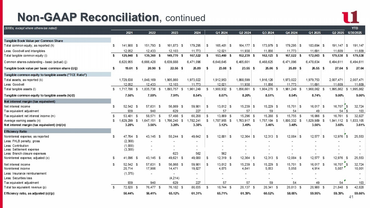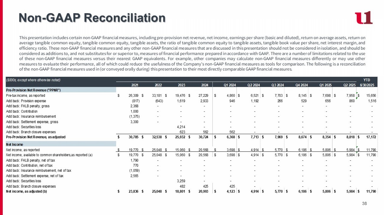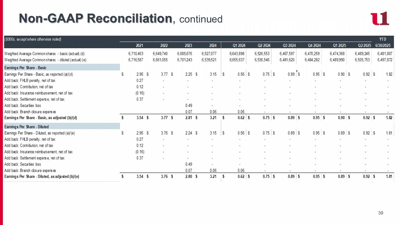 38本演示文稿包括某些非公认会计准则财务指标,包括拨备前净收入、净收入、每股收益(基本和稀释)、平均资产回报率、平均有形普通股权益回报率、有形普通股权益、有形资产、有形普通股权益与有形资产的比率、每股有形账面价值、净息差和效率比率。本演示文稿中讨论的这些非GAAP财务指标和任何其他非GAAP财务指标不应被孤立地考虑,应被视为对根据GAAP编制的财务业绩指标的补充,而不是替代或优于这些指标。使用这些非GAAP财务指标与其最接近的GAAP等值指标相比存在许多限制。例如,其他公司可能会以不同的方式计算非GAAP财务指标,或者可能会使用其他指标来评估其业绩,所有这些都可能降低公司非GAAP财务指标作为比较工具的有用性。以下是本演示文稿中使用(或在此期间口头传达的)非GAAP财务指标与其最直接可比的GAAP财务指标的对账。非公认会计原则调节(000美元,除非另有说明)年初至今2021202220232024 Q1 2024 Q2 2024 Q3 2024 Q4 2024 Q1 2025Q2 20256/30/2025拨备前净收入(“PPNR”)税前收入,如报告26,309美元33,181美元19,476美元27,229美元4,860美元6,521美元7,703美元8,145美元7,698美元7,958美元15,656美元加回:拨备费用(817)(643)1,6192,9339461,1922665296568601,516加回:FHLB罚款,毛额2,368-----------加回:缴款1,000----------加回:保险报销(1,375)----------加回:结算费用,毛额3,300---------加回:证券损失4,214--------加回:分支机构关闭费用623562562-------拨备前净收入,经调整后的30,785美元32,538美元25,932美元30,724美元6,368美元7,713美元7,969美元8,674美元8,354美元8,818美元17,172美元净收入净收入,报告19,770美元25,048美元15,060美元20,568美元3,698美元4,914美元5,770美元6,186美元5,806美元5,984美元11,790美元净收入,可供普通股股东使用,报告(a)19,770美元25,048美元15,060美元20,568美元3,698美元4,914美元5,770美元6,186美元5,806美元5,984美元11,790美元加回:FHLB罚款,税后净额1,税后净额(1,059)-----------加回:结算费用,税后净额2,565----------加回:证券损失3,259--------加回:分支机构关闭费用482425425-------调整后净收入(b)23,836美元25,048美元18,801美元20,993美元4,123美元4,914美元5,770美元6,186美元5,806美元5,984美元11,790美元