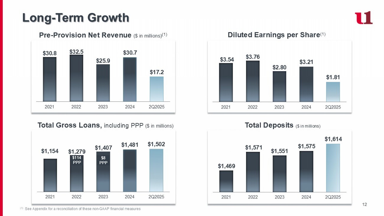11 $ 1180万净收入(1)$ 1.81摊薄后EPS(1)1.20%*ROAA(1)13.64*ROATCE(1)3.61% NIM年初至今财务摘要▪与2024年12月31日相比,总资产增加了3440万美元▪2025年前六个月的合并净收入(1)为1180万美元,而2024年前六个月为860万美元;拨备前净收入分别为1720万美元和1410万美元▪净利息收入,按非公认会计准则,FTE基础*由于利息收入增加和利息支出稳定,与2024年前六个月相比,2025年前六个月增加了370万美元▪资产质量保持稳定,信贷损失准备金(ACL)与未偿还贷款的比率在2025年6月30日为1.27%,在3月31日为1.25%,2025▪2025年前六个月的效率为59.66%(1),而2024年前六个月的效率为63.47%;该比率的改善主要归因于与工资和福利减少、净利息收入增加和稳定的非利息收入相关的非利息支出增加(1)这些非公认会计原则财务措施的调节见附录*2025年第二季度年化