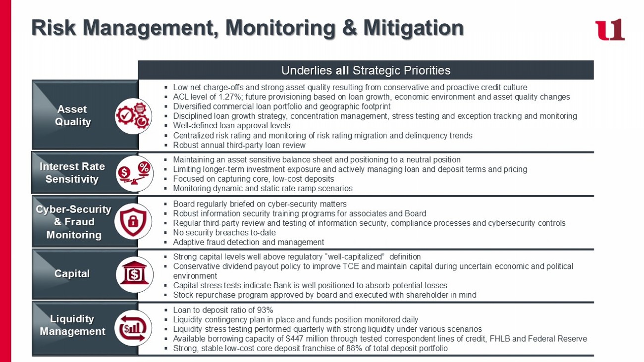 风险管理、监测和缓解是所有战略重点的基础▪保守和积极的信贷文化导致的低净冲销和强劲的资产质量▪ACL水平为1.27%;未来基于贷款增速、经济环境和资产质量变化的拨备计提▪多元化的商业贷款组合和地理足迹▪有纪律的贷款增长战略、集中度管理、压力测试和异常跟踪和监测▪明确界定的贷款审批水平▪风险集中评级,监测风险评级迁移和拖欠趋势▪稳健的年度第三方贷款审查▪维持对资产敏感的资产负债表,定位中性▪限制较长期投资敞口,积极管理贷款和存款条款和定价▪专注于捕获核心,低成本存款▪监测动态和静态速率斜坡场景▪董事会定期就网络安全事项进行简报▪为员工和董事会提供强大的信息安全培训计划▪信息安全定期第三方审查测试,合规流程和网络安全控制▪迄今未发生安全漏洞▪自适应欺诈检测和管理▪强劲的资本水平远高于监管“资本充足”的定义▪保守的派息政策,在不确定的经济和政治环境中改善TCE并保持资本▪资本压力测试显示银行有能力吸收潜在损失▪股票回购计划获董事会批准并在执行时考虑到股东▪贷存比93%▪流动性应急计划到位和每日监测的基金仓位▪流动性压力测试每季度进行一次,各种情景下流动性较强▪通过测试的代理信贷额度、FHLB和美联储的可用借款能力为4.47亿美元▪强大、稳定的低成本核心存款专营权占总存款组合的88%赛博-安全与欺诈监测资产质量资本流动性管理利率敏感性