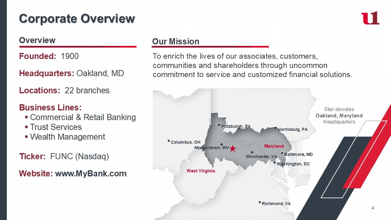 我们的使命是通过不同寻常的服务承诺和定制的金融解决方案,丰富我们的员工、客户、社区和股东的生活。企业概况成立时间:1900总部:马里兰州奥克兰市地点:22个分支机构业务线:▪商业和零售银行▪信托服务▪财富管理股票代码:FUNC(纳斯达克)网站:www.MyBank.com概览西弗吉尼亚州马里兰州•宾夕法尼亚州匹兹堡•华盛顿特区•俄亥俄州哥伦布市•马里兰州巴尔的摩•弗吉尼亚州里士满,西弗吉尼亚州摩根敦•宾夕法尼亚州哈里斯堡温彻斯特,VA Star表示马里兰州奥克兰总部4