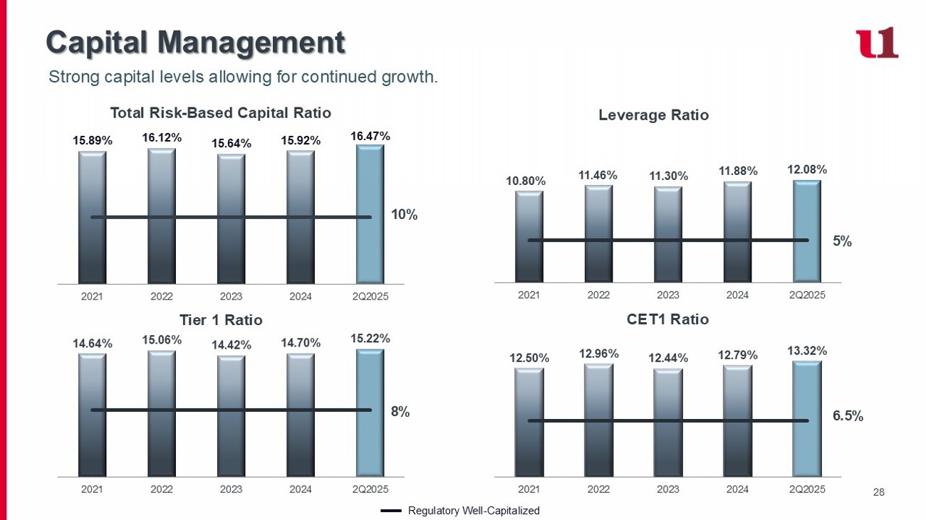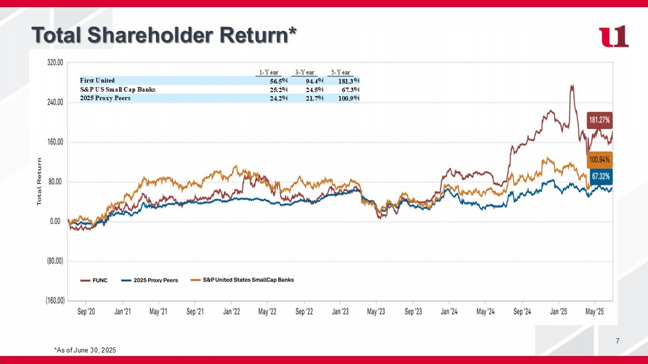 股东总回报*7*截至2025年6月30日5年期3年期1年期% 181.3% 94.4% 56.5 马里兰第一联合 % 67.3% 24.5% 25.2 标普美国小型银行% 100.9% 21.7% 24.22025代理同业