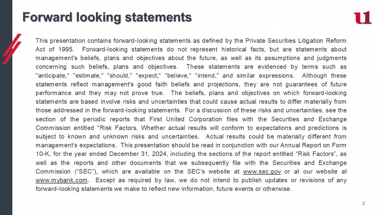 2前瞻性陈述本演示文稿包含1995年《私人证券诉讼改革法案》所定义的前瞻性陈述。前瞻性陈述不代表历史事实,而是关于管理层对未来的信念、计划和目标的陈述,以及其对这些信念、计划和目标的假设和判断。这些说法有“预期”、“估计”、“应该”、“预期”、“相信”、“打算”等类似表述。尽管这些陈述反映了管理层的善意信念和预测,但它们并不是对未来业绩的保证,也可能不会被证明是真实的。前瞻性陈述所依据的信念、计划和目标涉及风险和不确定性,可能导致实际结果与前瞻性陈述中涉及的结果存在重大差异。有关这些风险和不确定性的讨论,请参阅First United Corporation向美国证券交易委员会提交的定期报告中题为“风险因素”的部分。实际结果是否会符合预期和预测,取决于已知和未知的风险和不确定性。实际结果可能与管理层的预期存在重大差异。本演示文稿应与我们截至2024年12月31日止年度的10-K表格年度报告一起阅读,包括报告中题为“风险因素”的部分,以及我们随后向美国证券交易委员会(“SEC”)提交的报告和其他文件,这些文件可在SEC网站www.sec.gov或我们的网站www.mybank.com上查阅。除法律要求外,我们不打算发布我们所做的任何前瞻性陈述的更新或修订,以反映新信息、未来事件或其他方面。