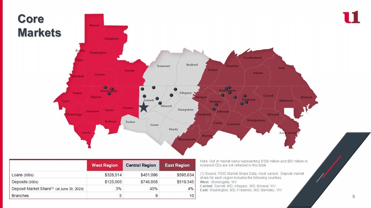 东部地区中部地区西部地区$ 595,634 $ 451,096 $ 328,514贷款(000s)$ 519,345 $ 746,858 $ 125,005存款(000s)4% 45% 3%存款市场份额(1)(截至2024年6月30日)1093分行注:代表1.28亿美元和5000万美元经纪CD的市场外贷款未反映在本表中(1)来源:FDIC市场份额数据,最新。每个地区的矿床市场份额包括以下县:西部:Monongalia,WV Central:Garrett,MD;Allegany,MD;Mineral,WV East:Washington,MD;Frederick,MD;Berkeley,WV Core Markets 5