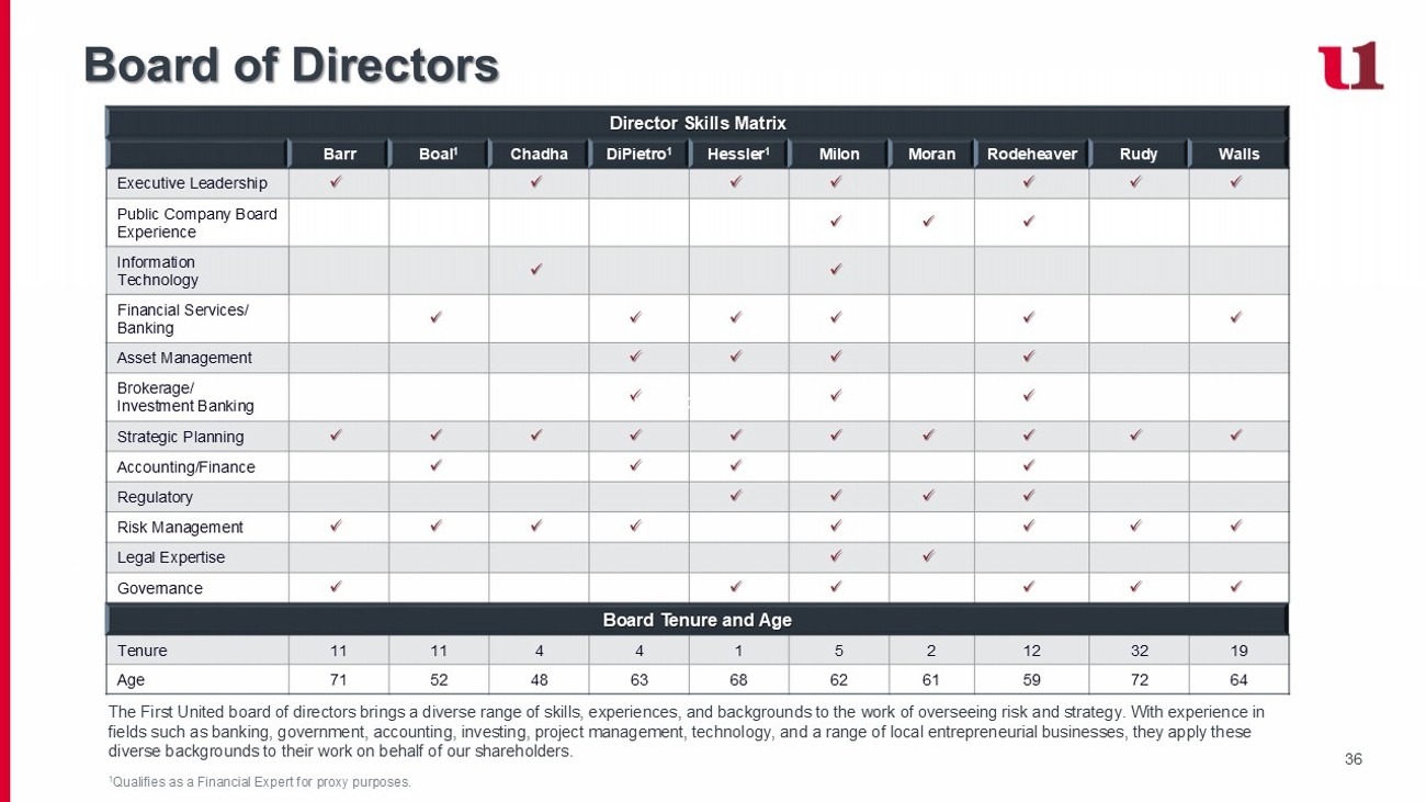 343434 John F. Barr独立董事Ellsworth Electric,Inc.董事长Sanu Chadha独立董事董事总经理合伙人、M & S Consulting Christy DiPietro独立董事、审计主席特许金融分析师、Hidden Cove Advisory Patricia Milon独立董事Principal、Milford Advisory Group,LLC TERM0独立董事总裁、I.R. Rudy’s,Inc. ↓ H. Andrew Walls,III H. Andrew Walls, III独立董事总裁、MEBA,LLC MPB Print & Sign Superstore成员Beth E. Moran独立董事、Beth E. Moran律师事务所Brian Boal首席独立董事、提名与治理主席Boal & Associates,PC Carissa L. Rodeheaver董事会主席、总裁兼首席执行官First United Corporation和马里兰第一联合 Bank & Trust董事会Kevin Hessler LSWG,Inc.独立董事、负责人马里兰第一联合的董事会代表了具有不同背景和观点的个人,为其完善的领导层和治理结构做出了贡献。