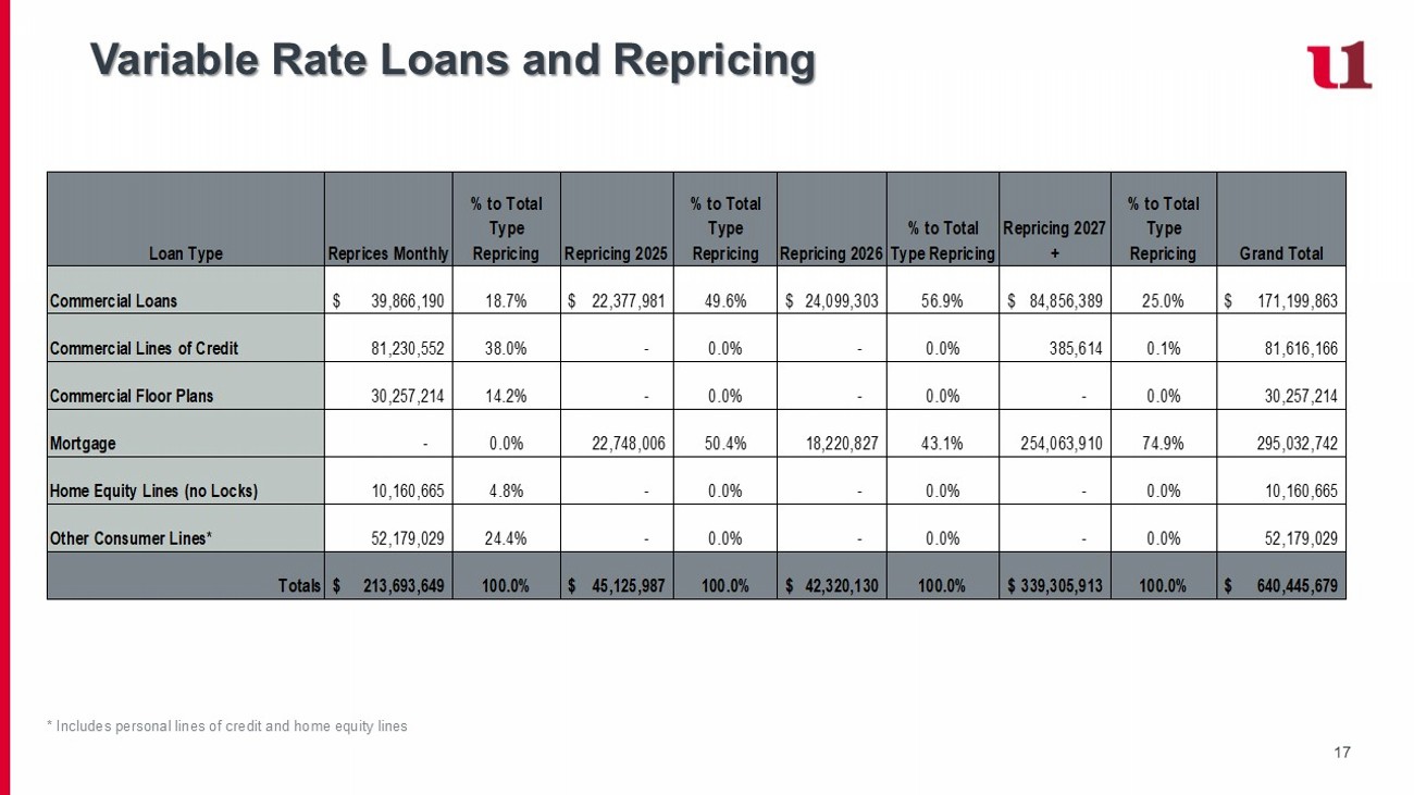17浮动利率贷款和重新定价*包括个人信贷额度和房屋净值额度贷款类型每月重新定价%至总类型重新定价2025%至总类型重新定价2026%至总类型重新定价2027 + %至总类型重新定价2027 + 18.7% 22,377,981 $ 49.6% 24,099,303 $ 56.9% 84,856,389 $ 25.0% 171,199,863 $商业信贷额度81,230,55238.0%-0.0%-0.0% 385,6140.1% 81,616,166商业平面图30,257,21414.2%-0.0%-0.0%-0.0% 30,257,214抵押贷款-0.0% 22,748,00650.4% 18,220,82743.1% 254,063,91074.9% 295,032,742房屋净值额度(无锁)10,160,642*52,179,02924.4%-0.0%-0.0%-0.0% 52,179,029总计213,693,649美元100.0% 45,125,987美元100.0% 42,320,130美元100.0% 339,305,913美元100.0% 640,445,679美元