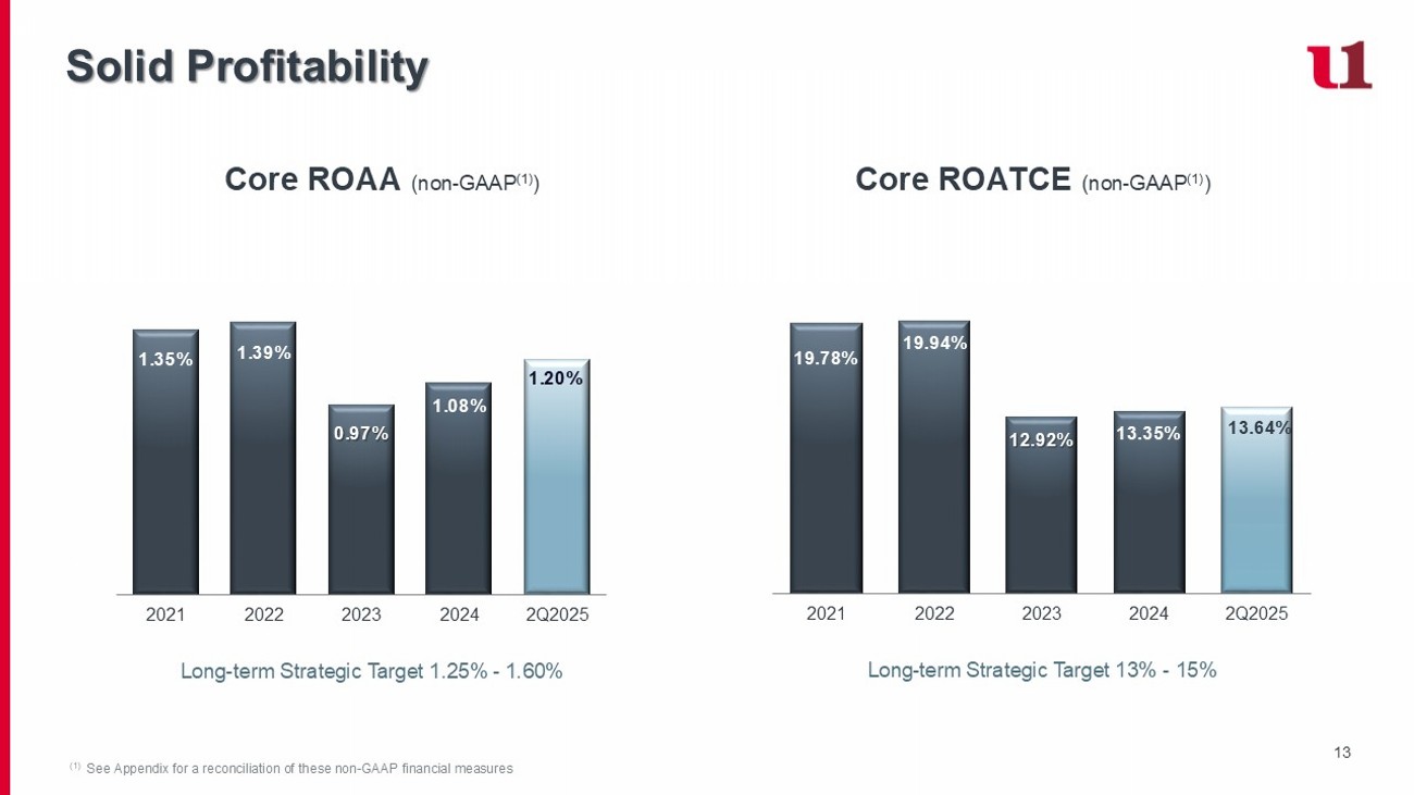 12长期增长拨备前净收入(百万美元)(1)30.8美元32.5美元25.9美元30.7美元17.2美元2021202220232024 2Q2025(1)这些非公认会计原则财务指标的调节见附录3.54美元3.76美元2.80美元3.21美元1.81美元20212022202320232024 2Q2025稀释每股收益(1)存款总额(百万美元)1,469美元1,571美元1,551美元1,575美元1,614美元20212022202320232024 2Q2025贷款总额,包括PPP(百万美元)1,154美元1,279美元1,407美元1,481美元1美元1,502美元2021202220232024 2Q2025美元114美元PPP 8美元PPP