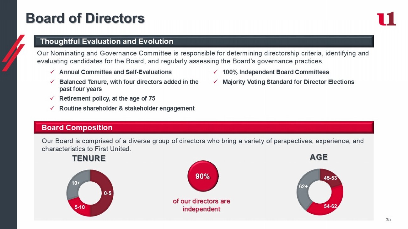 董事会周到的评估和演变我们的董事会由多元化的董事群体组成,他们为马里兰第一联合带来了多种视角、经验和特点。董事会组成我们90%的董事是独立的我们的提名和治理委员会负责确定董事标准,确定和评估董事会候选人,并定期评估董事会的治理实践。x 100%独立董事委员会x董事选举的多数投票标准x年度委员会和自我评估x平衡任期,过去四年增加了四名董事x退休政策,75岁x常规股东和利益相关者聘用0-55-1010 +任期45-5354-6262 +年龄35