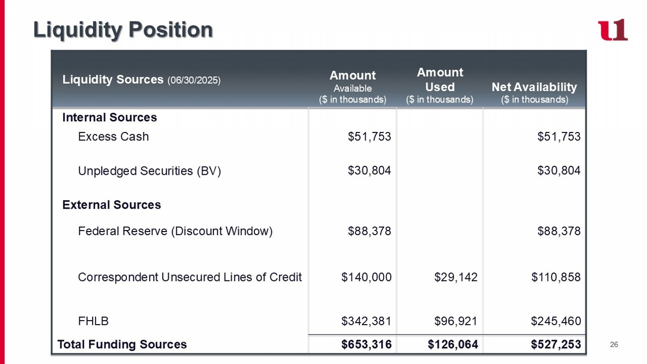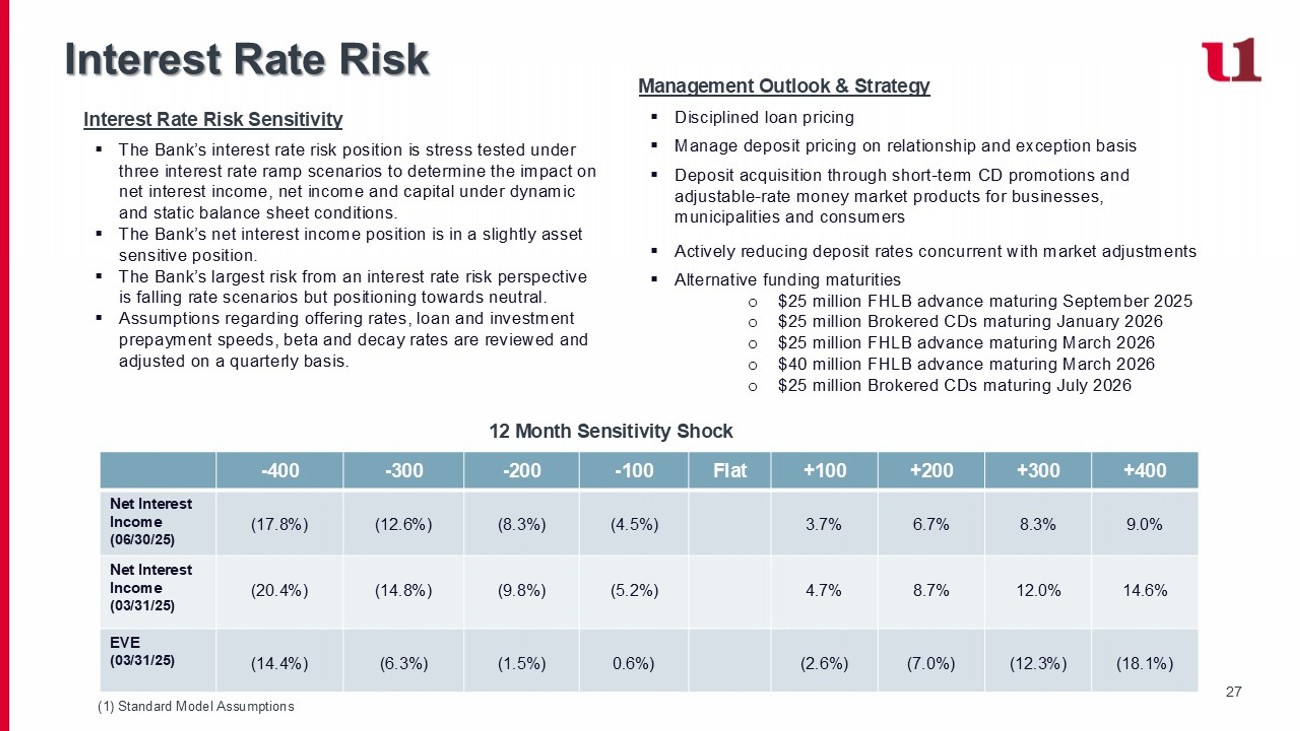 26流动性头寸可用净额(千美元)使用金额(千美元)可用金额(千美元)流动性来源(06/30/2025)内部来源$ 51,753 $ 51,753超额现金$ 30,804 $ 30,804未质押证券(BV)外部来源$ 88,378 $ 88,378美联储(贴现窗口)$ 110,858 $ 245,460 $ 29,142 $ 96,921 $ 140,000 $ 342,381代理无担保信贷额度FHLB $ 527,253 $ 126,064 $ 653,316资金来源总额