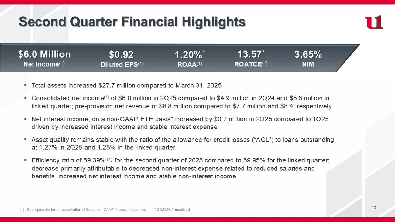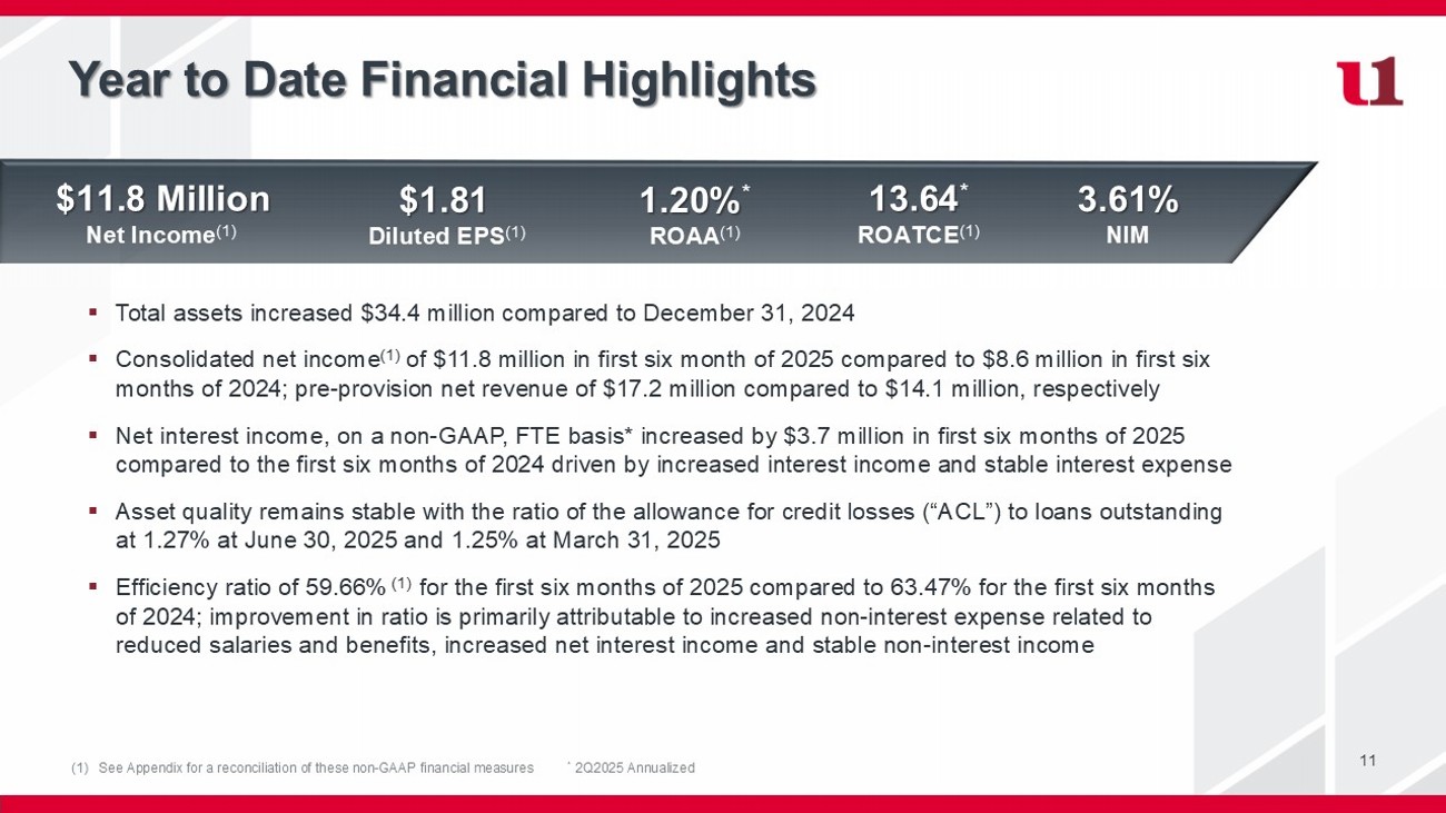 10 $ 6.0百万净收益(1)$ 0.92摊薄EPS(1)1.20%*ROAA(1)13.57*ROATCE(1)3.65% NIM第二季度财务摘要▪与2025年3月31日相比,总资产增加了2770万美元▪2Q25的合并净收入(1)为608万美元,而2Q24为490万美元,上一季度为580万美元;拨备前净收入为880万美元,分别为770万美元和8.4美元▪净利息收入,按非公认会计准则,FTE基础*由于利息收入增加和利息支出稳定,2Q25比1Q25增加了70万美元▪资产质量保持稳定,2Q25的信贷损失准备金(“ACL”)与未偿还贷款的比率为1.27%,而联系季度为1.25%▪2025年第二季度效率比率为59.39%(1),而上一季度为59.95%;减少主要归因于与薪金和福利减少相关的非利息支出减少,净利息收入增加,非利息收入稳定(1)这些非GAAP财务指标的对账见附录*2025年第二季度年化
