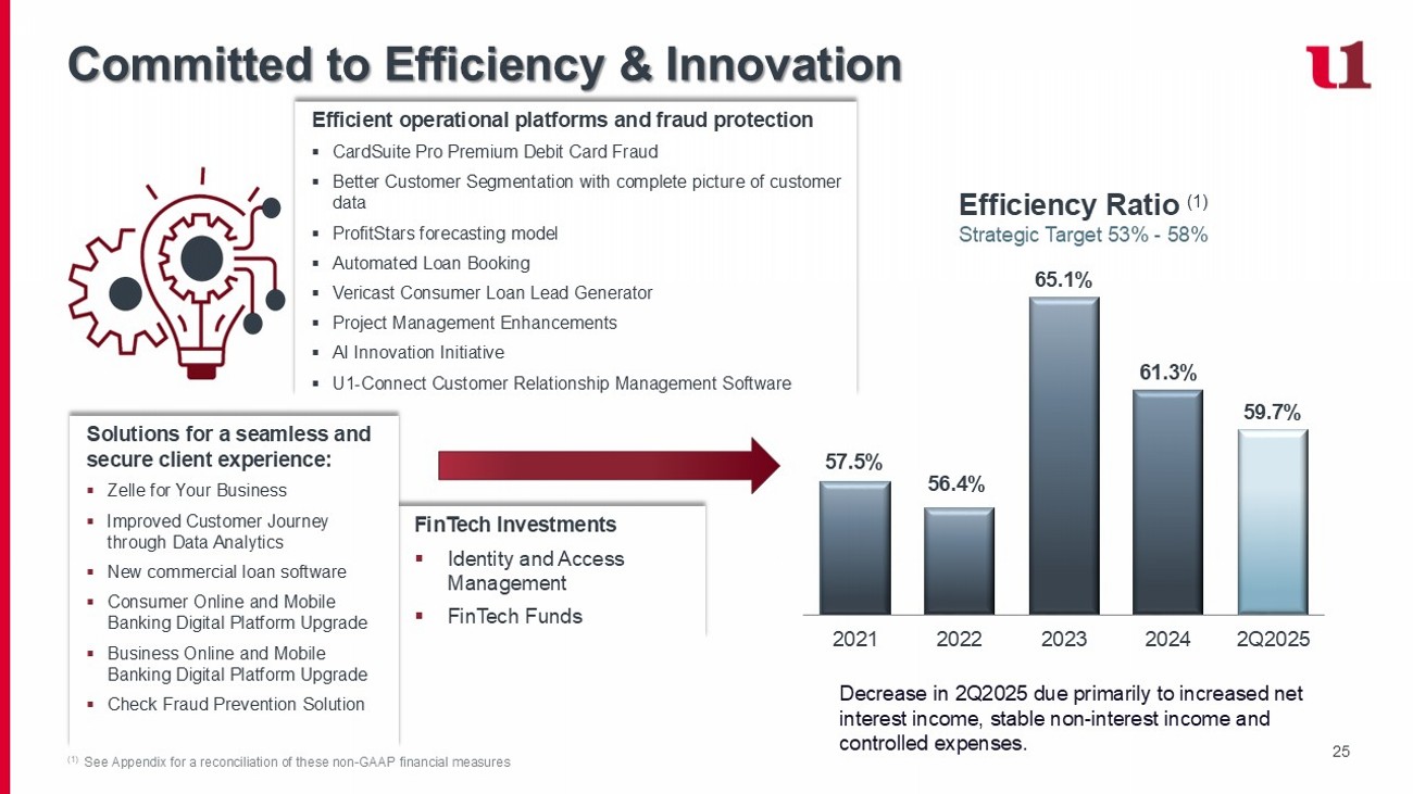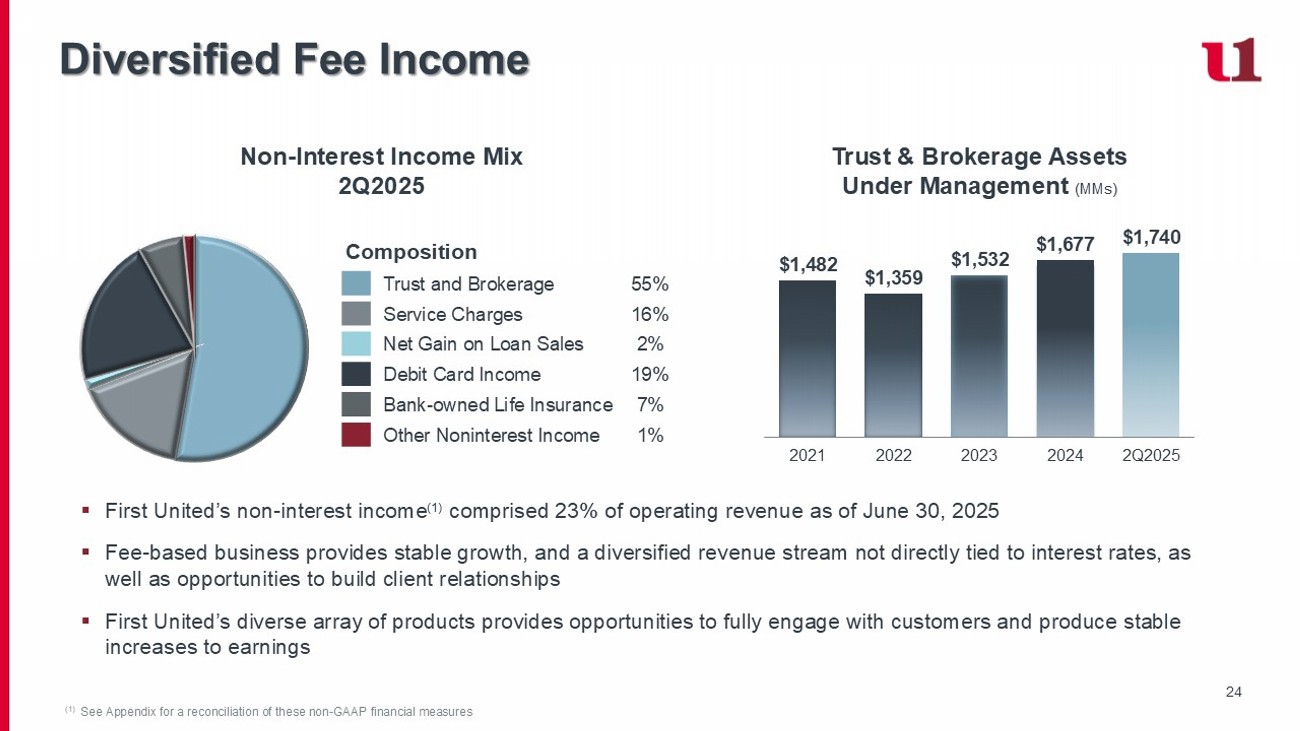 24多元化费用收入(1)这些非GAAP财务指标构成的对账见附录55%信托和经纪16%服务收费2%贷款销售净收益19%借记卡收入7%银行自有人寿保险1%其他非利息收入非利息收入混合2025年第二季度信托和经纪管理资产(MMS)▪截至2025年6月30日,马里兰第一联合的非利息收入(1)占营业收入的23%▪收费型业务提供稳定增长,不直接与利率挂钩的多元化收入流,以及建立客户关系的机会▪马里兰第一联合多样化的产品系列提供了与客户充分互动并稳定增加收益的机会$ 1,482 $ 1,359 $ 1,532 $ 1,677 $ 1,740 2021202220232024 2Q2025
