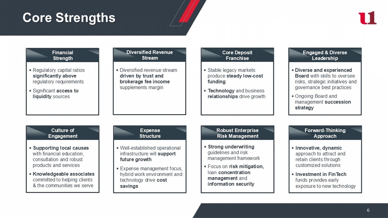 6大核心优势▪信托、券商手续费收入驱动下收入流多元化补充边际收入流多元化▪稳定的遗留市场产生稳定的低成本资金▪技术和业务关系推动增长核心存款特许经营权▪具有监督风险、战略举措和治理最佳实践的技能的多元化和经验丰富的董事会▪正在进行的董事会和管理层继任战略Engaged & Diverse Leadership▪以金融教育支持地方事业,咨询和强大的产品和服务▪知识渊博的员工致力于帮助客户&我们所服务的社区Engagement Culture▪完善的运营基础设施将支持未来增长▪费用管理聚焦、混合工作环境和技术驱动成本节约费用Structure▪强有力的承保准则和风险管理框架▪聚焦风险缓释、贷款集中度管理和信息安全稳健企业风险管理▪创新,通过定制解决方案吸引和留住客户的动态方法▪投资金融科技基金提供早期接触新技术Forward-Thinking Approach▪显著高于监管要求的监管资本比率▪获得大量流动性来源的资金实力