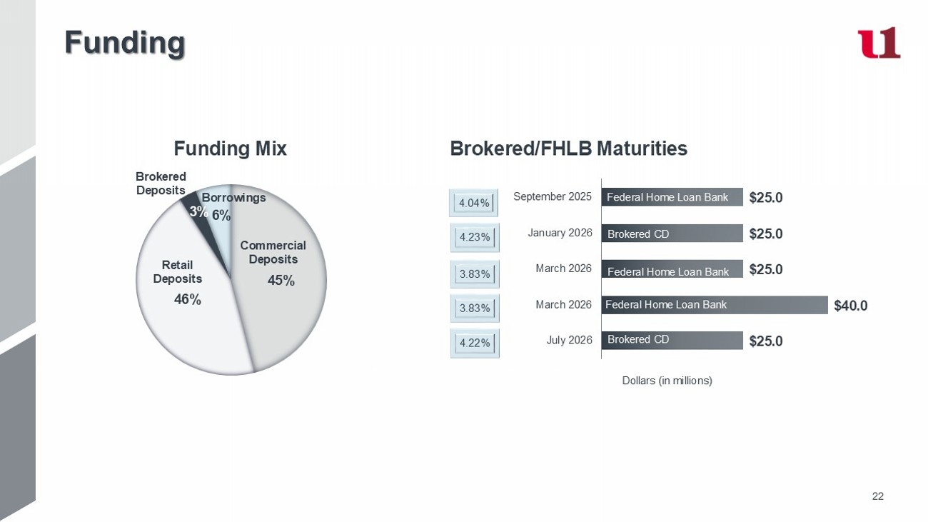 21存款34% 32% 28% 27% 26% 16% 23% 23% 25% 22% 39% 36% 37% 39% 40% 11% 8% 10% 9% 9% 0% 0% 2% 0% 3% 2021202220232024 2Q2025 NIB Demand IB Demand MMA & Savings CDs-Retail CDs-经纪$ 1.57 $ 1.42 $ 1.61 $ 1.57 $ 1.58存款构成(截至06/30/2025以十亿美元计)79% 81% 91% 94% 93%贷存比2021202220232024 2Q2025存款水平相对持平,原因是存款竞争激烈以及消费者、企业和市政当局最近的通胀支出。%余额存款类型76% $ 1,232,328,305有保险存款19% $ 304,560,715无保险–无抵押存款5% $ 77,317,491无保险-抵押存款%余额(MMS)存款类型49% $ 796,108,147零售存款51% $ 818,098,364商业存款