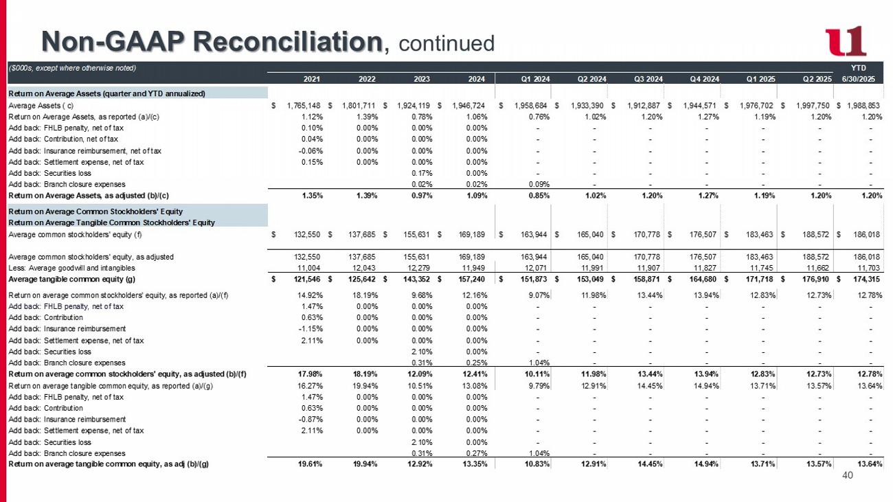 39非公认会计原则和解,续(千美元,除非另有说明)年初至今2021202220232024 Q1 2024 Q2 2024 Q3 2024 Q4 2024 Q1 2025Q2 20256/30/2025加权平均普通股-基本(实际)(d)6,710,4636,649,7406,685,6766,527,0776,643,8986,526,5536,467,5976,470,2596,474,3686,489,2456,481,807加权平均普通股-稀释(实际)(e)6,716,5876,661,0556,701,2436,539,5216,655,6376,536,5466,481,6206,484,2826,489,税后净额0.27----------加回:供款,税后净额0.12---------加回:保险报销,税后净额(0.16)----------加回:结算费用,税后净额0.37----------加回:证券亏损0.49--------加回:分支机构关闭费用0.07 0.06 0.06------每股收益-基本,经调整后(b)/(d)3.54美元3.77美元2.81美元3.21美元0.62美元0.75美元0.89美元0.95美元0.90美元0.92美元1.82美元每股收益-稀释后每股收益-如报告(a)/(e)2.95美元3.76美元2.24美元3.15美元0.56美元0.75美元0.89美元0.95美元0.89美元0.92美元1.81美元加回:FHLB罚款,税后净额0.27-----------加回:缴款,税后净额0.12-----------加回:保险报销,税后净额(0.16)-----------加回:结算费用,税后净额0.37----------加回:证券亏损0.49------加回:分支机构关闭费用0.07 0.06 0.06------每股收益-稀释,经调整(b)/(e)3.54 $ 3.76 $ 2.80 $ 3.21 $ 0.62 $ 0.75 $ 0.89 $ 0.95 $ 0.89 $ 0.92 $ 1.81 $